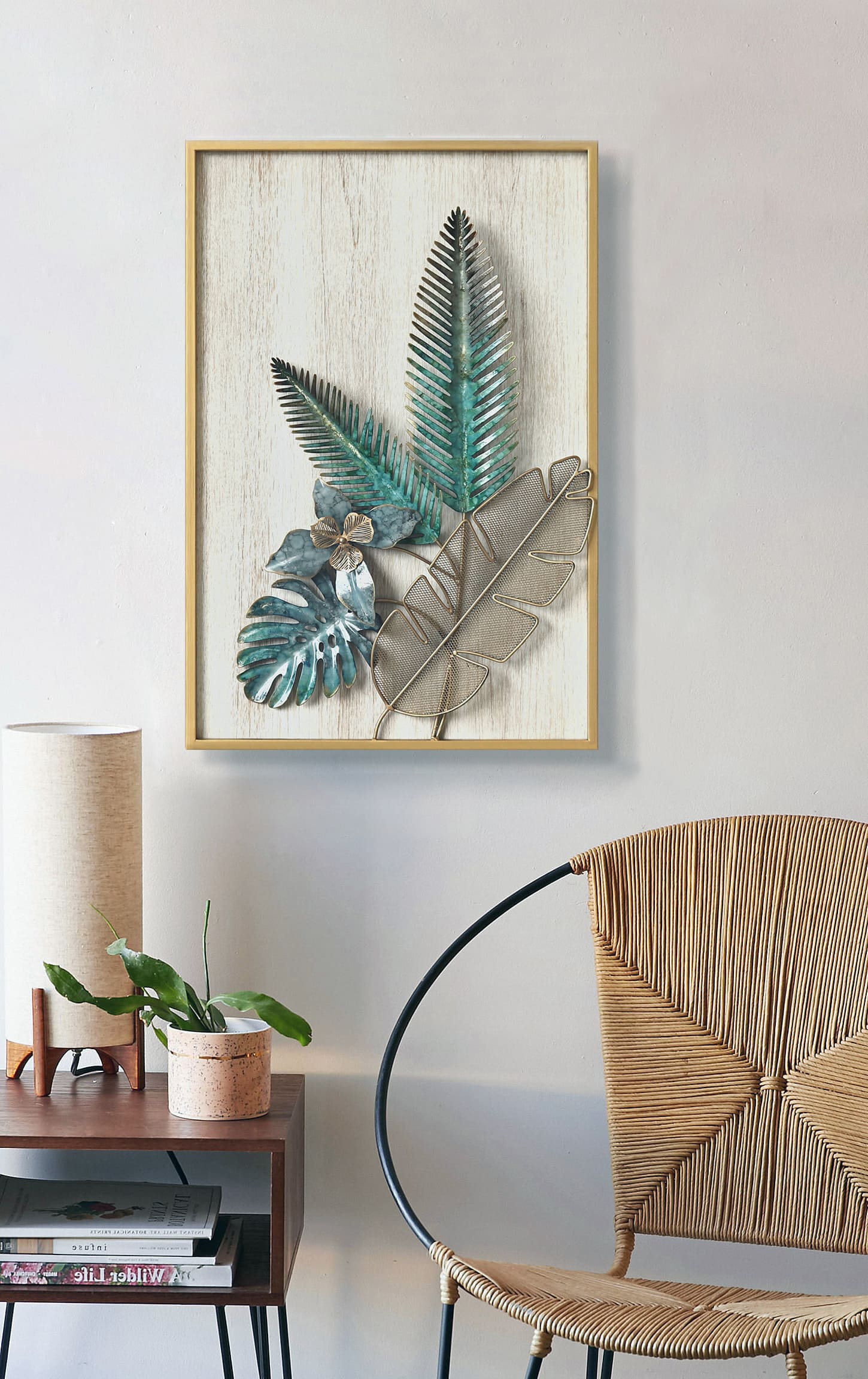 Elegante pieza decorativa con hojas metálicas en relieve, combinando tonos verdes y dorados sobre un fondo efecto madera. Enmarcada en dorado, esta obra aporta textura y color, realzando cualquier estancia del hogar con un estilo sofisticado.