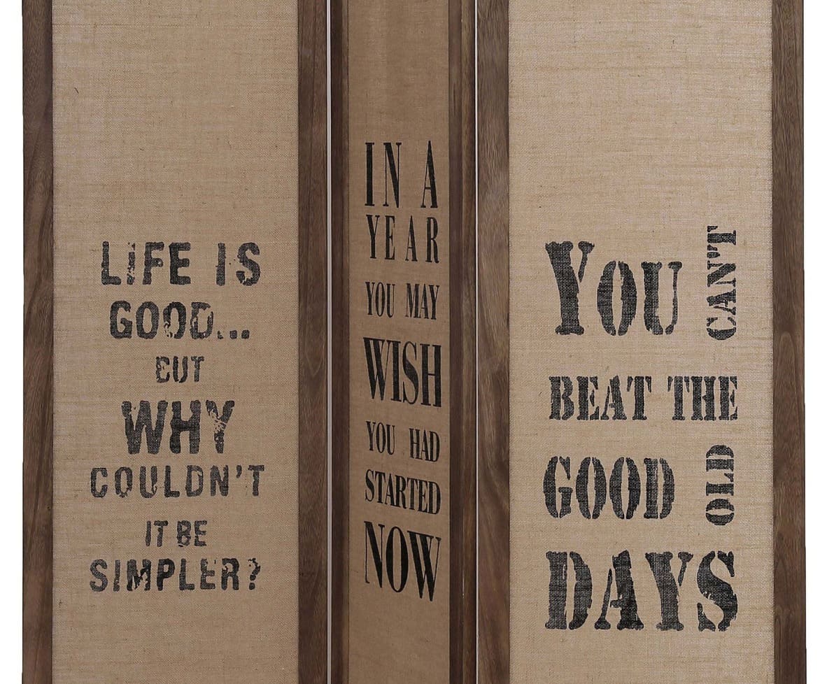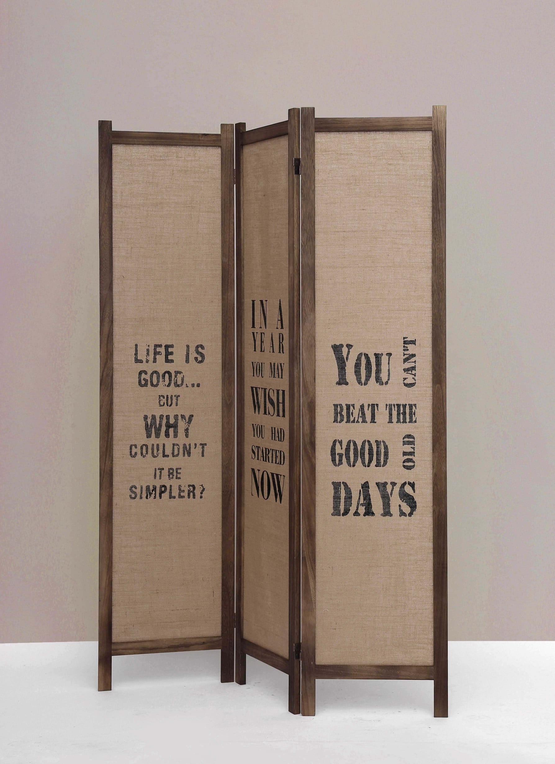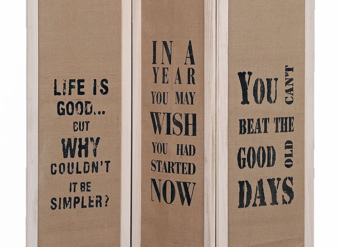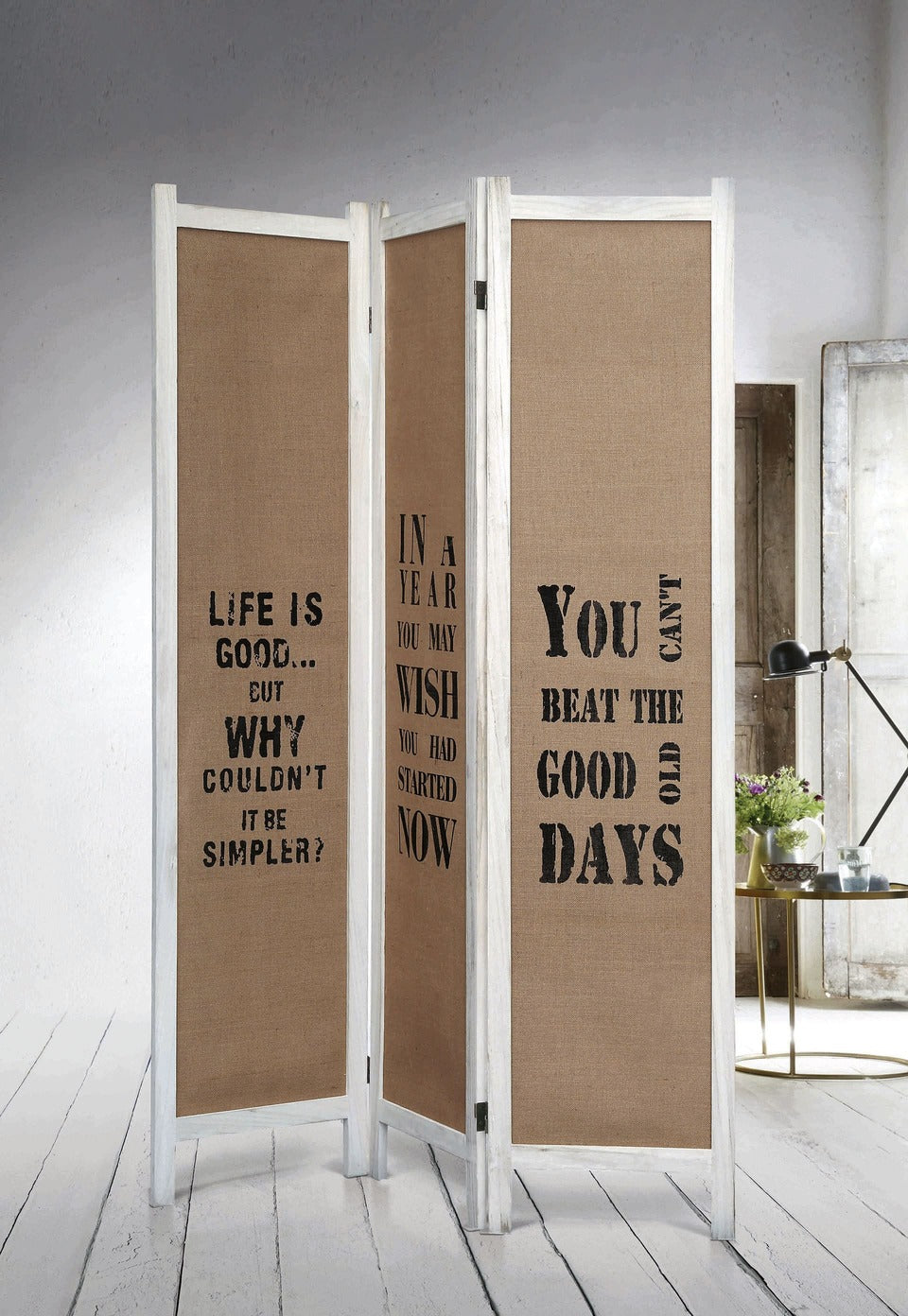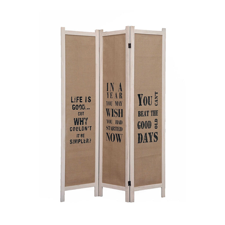 Biombo COUTO, con estructura de madera disponible en color blanco o nogal y paneles de arpillera con mensajes estampados. Formado por 3 paneles unidos mediante bisagras que permiten una apertura de 360º, es ideal para separar espacios en el hogar, oficina o espacios comunes. Tiene una altura de 170 cm, un ancho de 40 cm por panel, y al abrirlo alcanza un ancho total de 120 cm.
