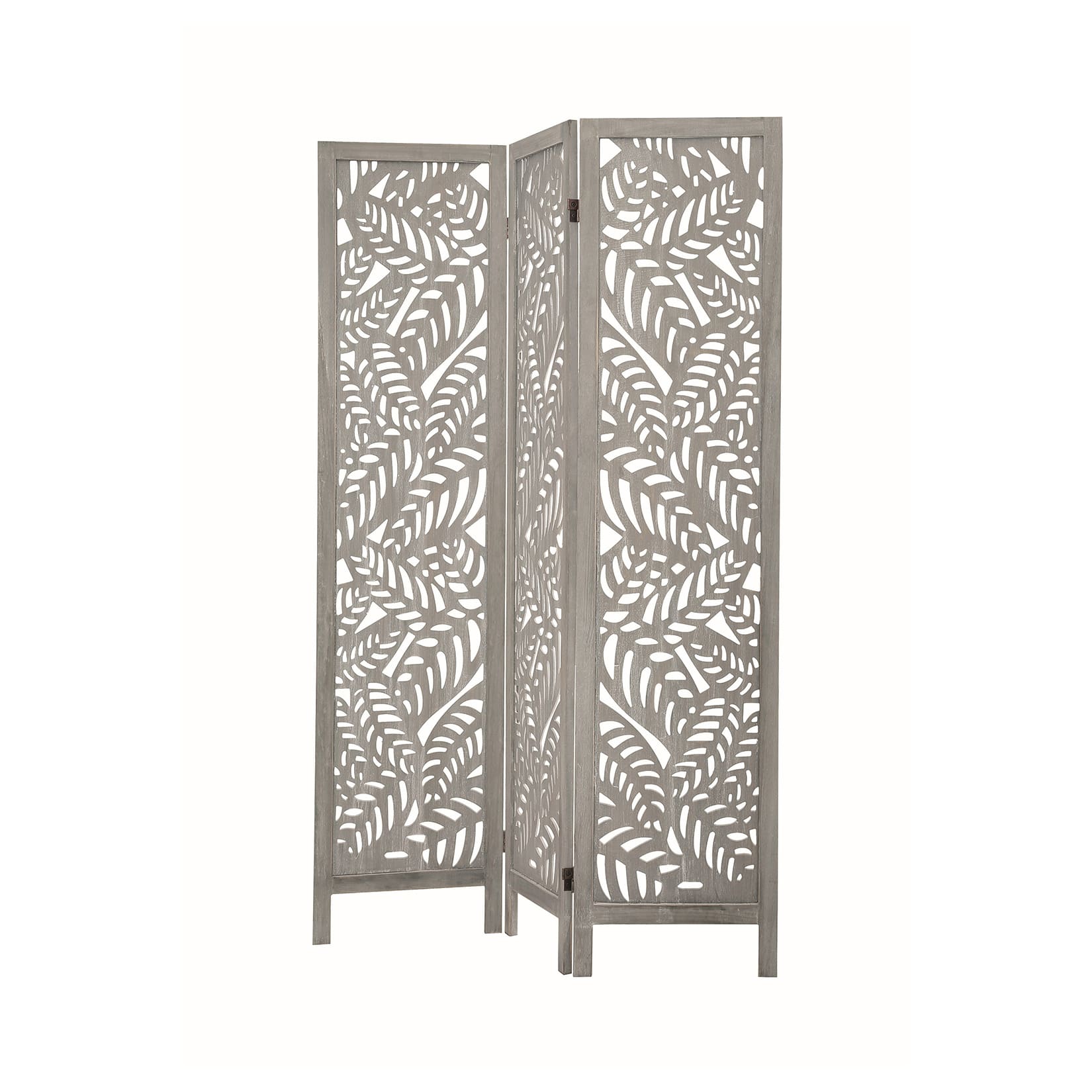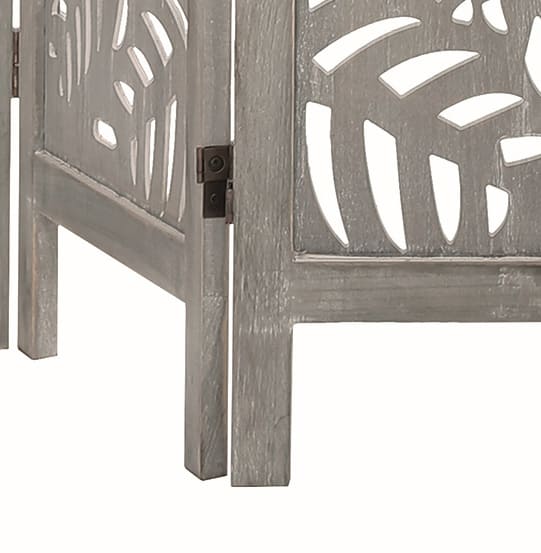Biombo OUTEIRO, fabricado en madera de color gris, con un diseño troquelado de hojas que aporta un estilo natural y elegante. Formado por 3 paneles unidos mediante bisagras de apertura 360º, es perfecto para separar espacios de manera flexible. Tiene una altura de 170 cm, un ancho de 40 cm por panel, y al abrirlo alcanza un ancho total de 120 cm.