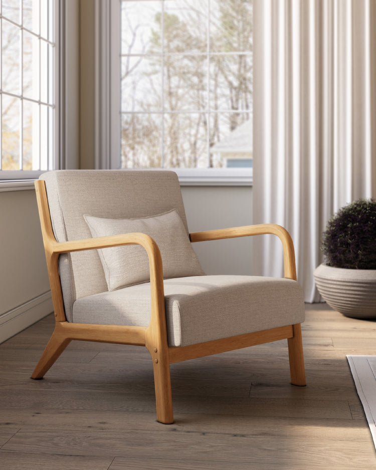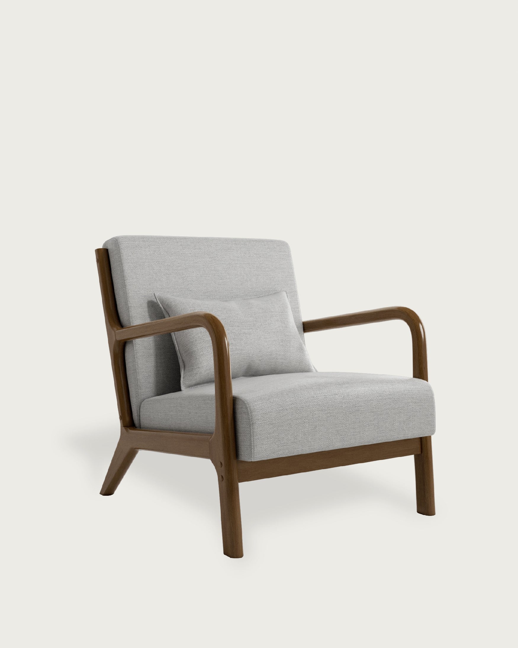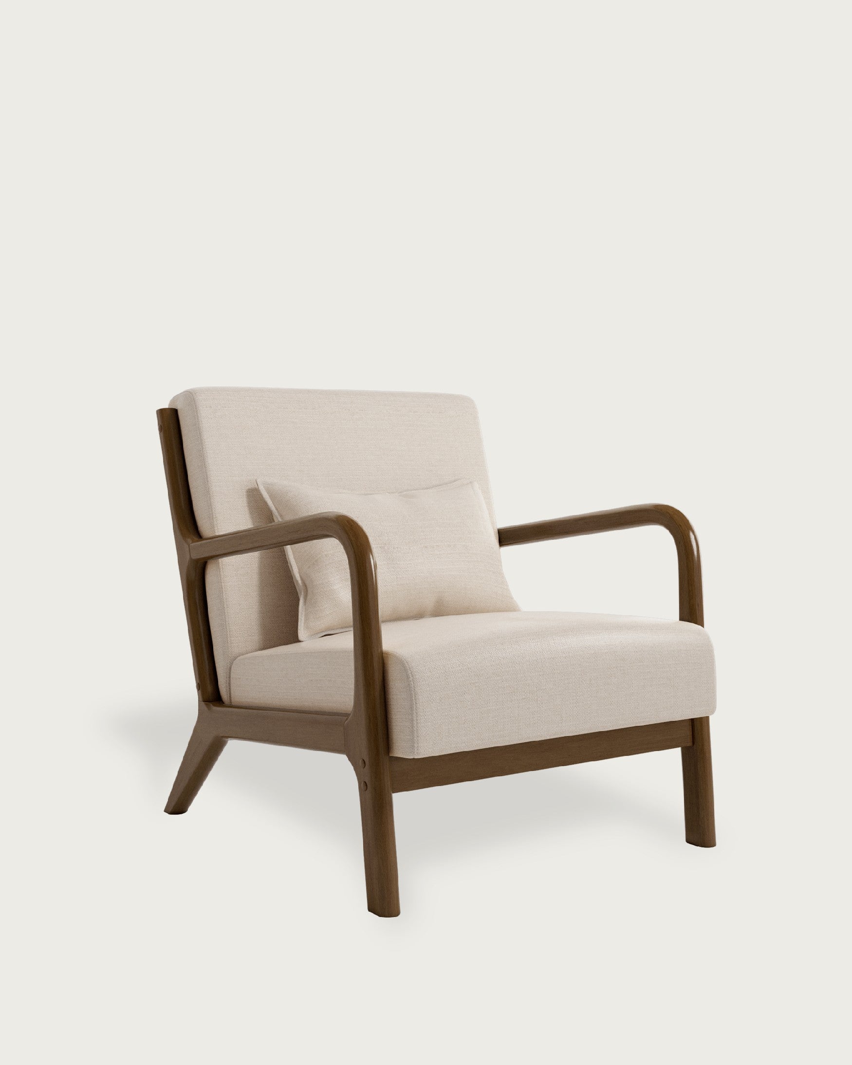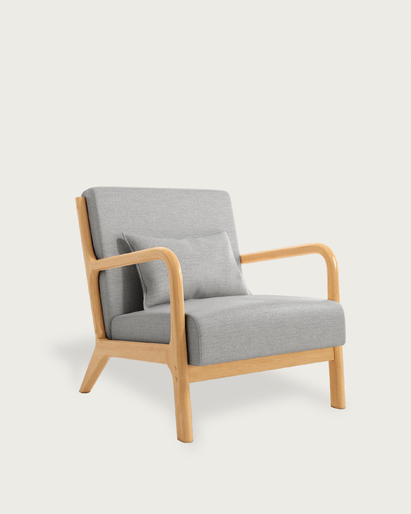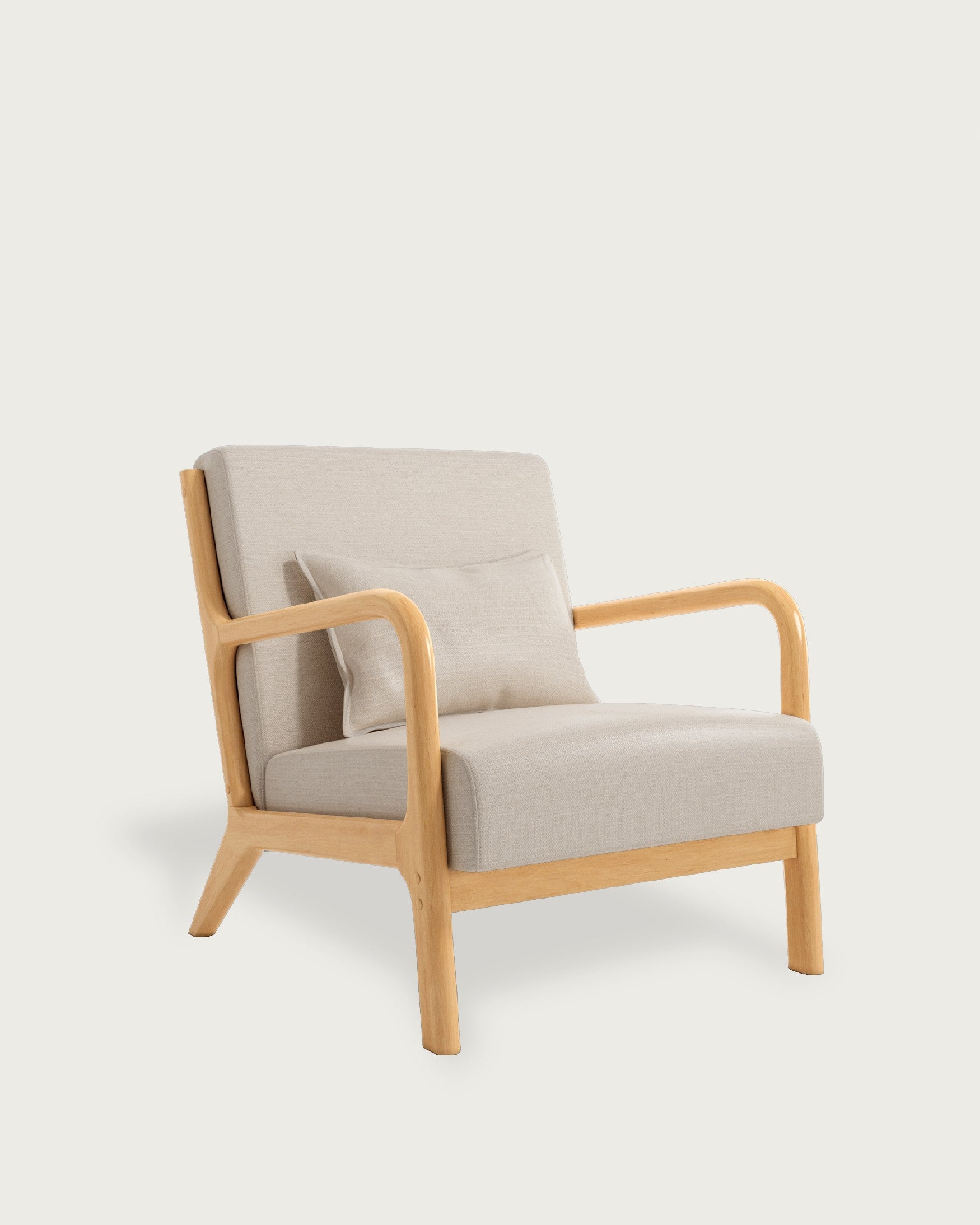 Butaca ALMACHÁR con estructura de madera vista, asiento y respaldo tapizados y cojín incluido para apoyo extra. Proporciona una sentada amplia y relajada, perfecta para salones o rincones de lectura.