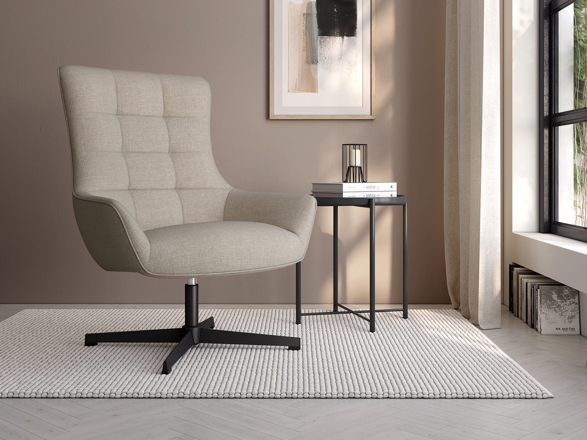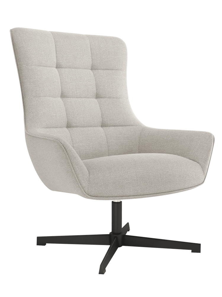 La SALIA es una butaca giratoria de diseño envolvente y elegante, ideal para salones, zonas de lectura o espacios contract donde se busca confort con estilo. El respaldo alto con acolchado en capitoné aporta un toque clásico reinterpretado en clave contemporánea, mientras que su base metálica negra proporciona estabilidad y un giro suave de 360°.