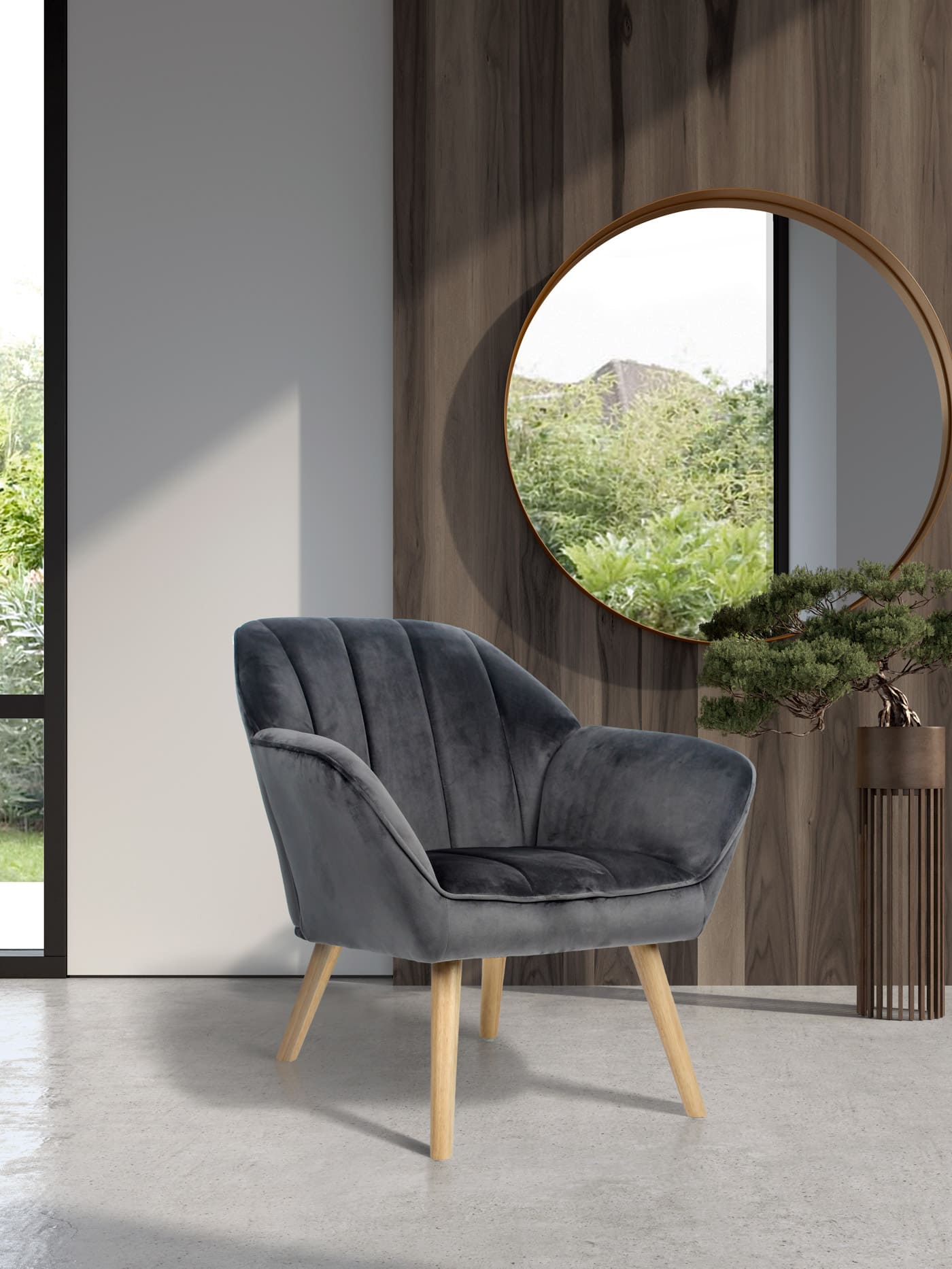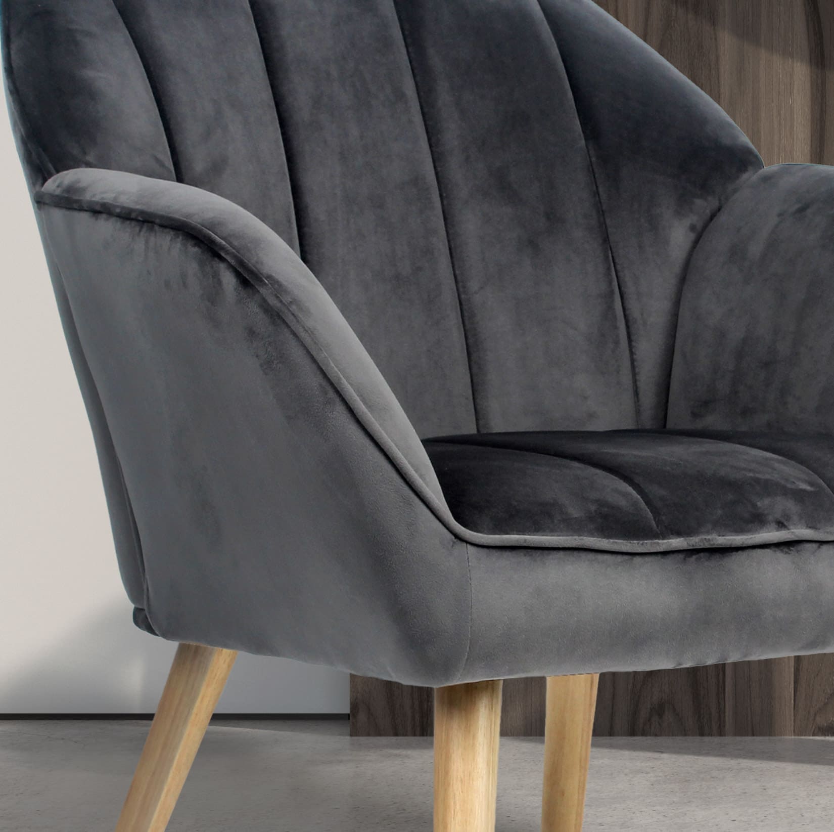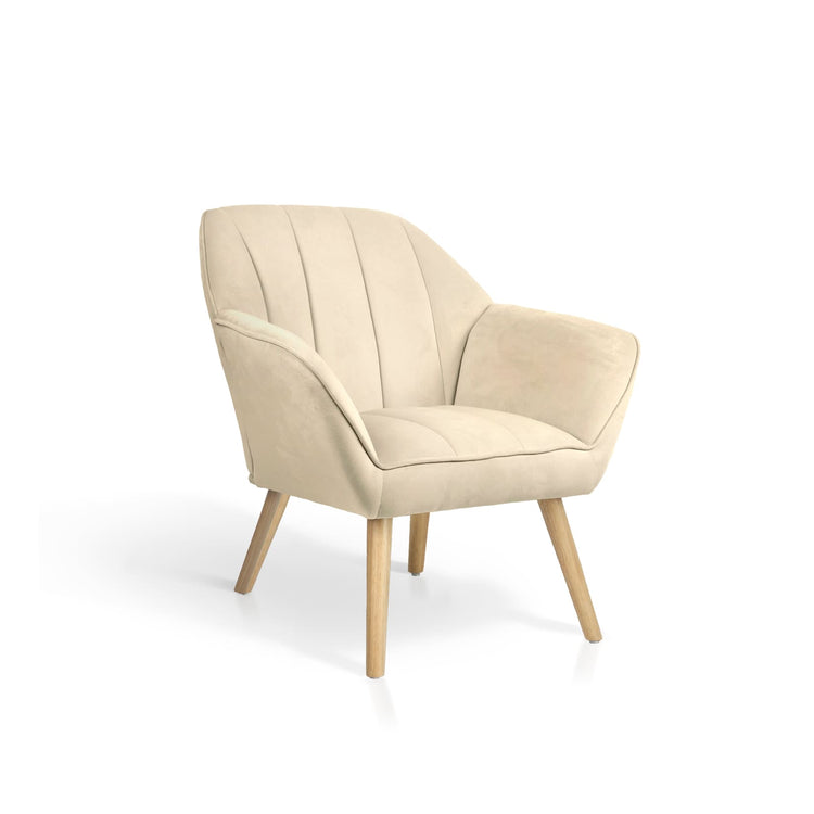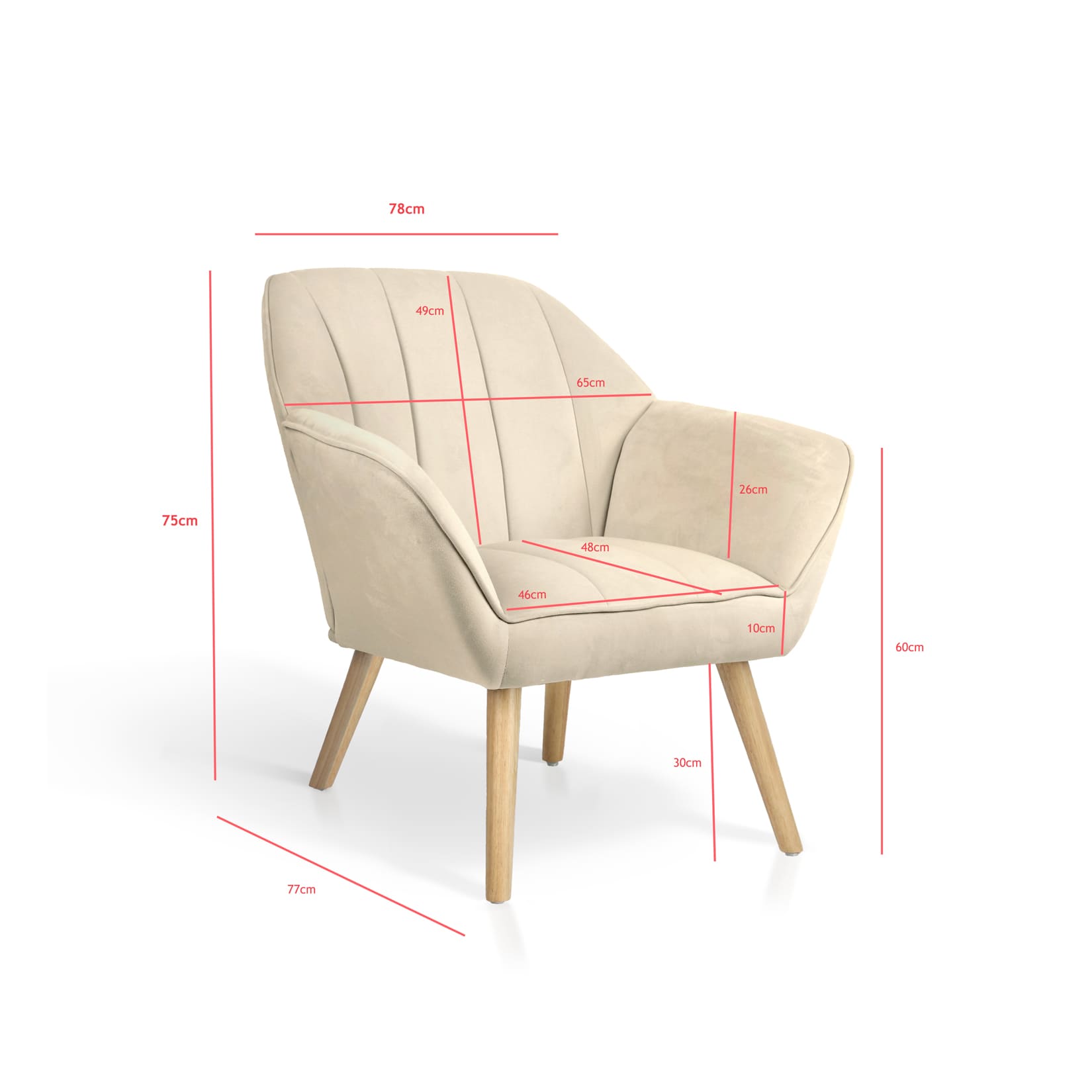 El sillón TORRETA aporta un toque sofisticado a cualquier espacio gracias a su tapizado en terciopelo beige o gris y a sus líneas decorativas en respaldo y asiento. Cuenta con patas de madera natural, respaldo fijo y cremallera trasera que realza su diseño. Es elegante, cómodo y fácil de montar, ideal para realzar salones, dormitorios o rincones de estilo.