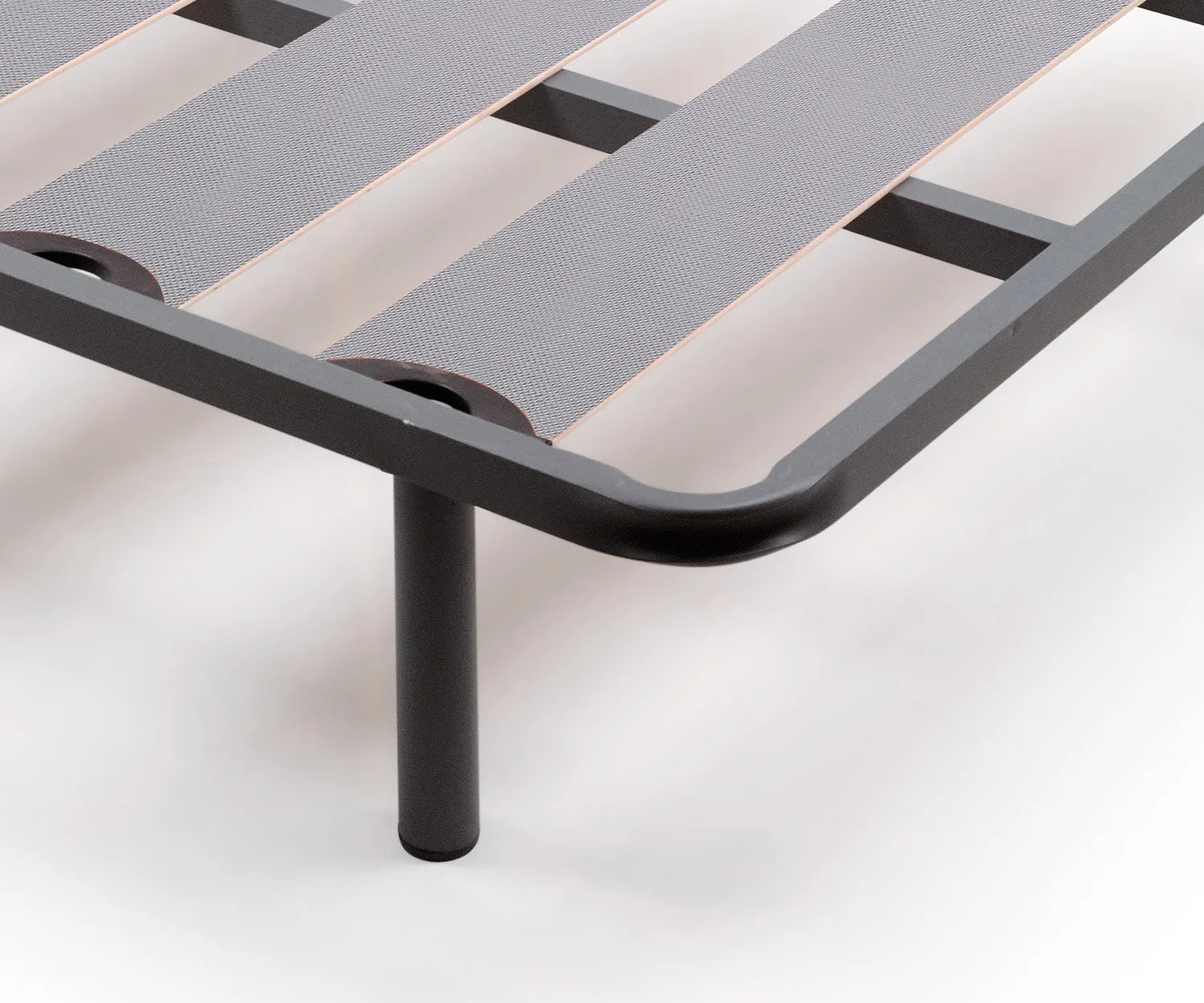 Somier de lamas de madera con estructura metálica robusta de tubo de acero y tratamiento contra la corrosión, que garantiza mayor resistencia y durabilidad. Incorpora soportes soldados con tornillo rosca M10, tacos PVC embutidos anti ruidos y lamas de madera contrachapada en acabado color carbono. Su estructura está reforzada con pintura epoxi color grafito para mayor protección. Se entrega con juego de 6 patas metálicas de 25 cm, fáciles de montar y muy estables.