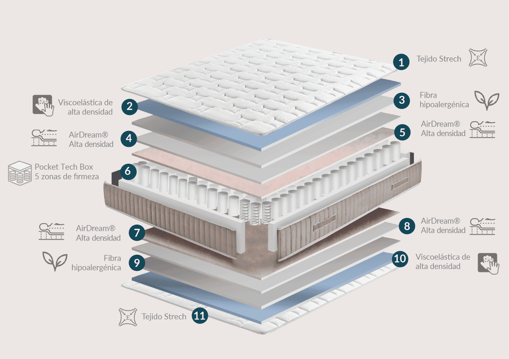 • Núcleo con muelles ensacados Pocket Tech Box y refuerzo perimetral