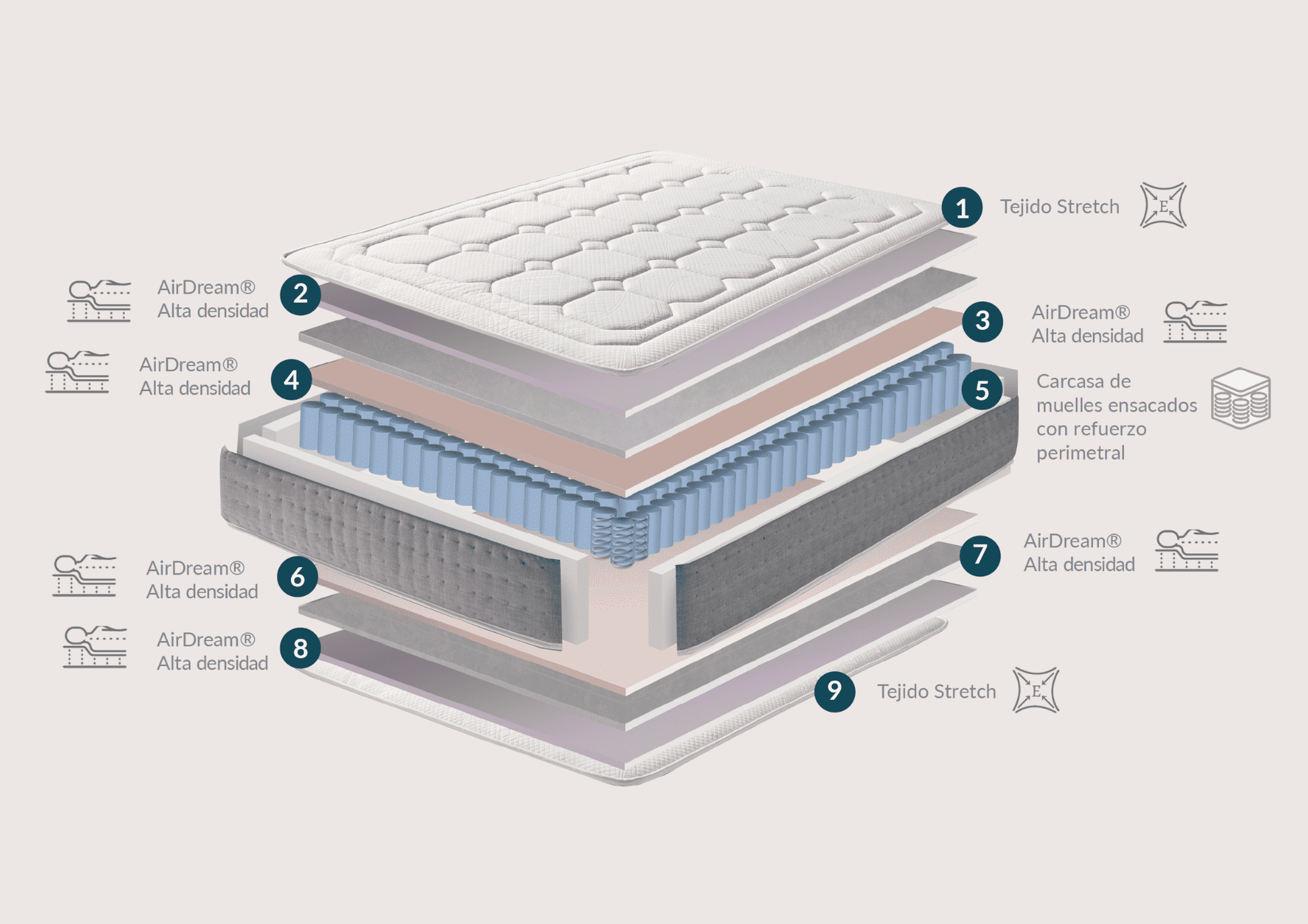 • Núcleo con carcasa de muelles ensacados y refuerzo perimetral