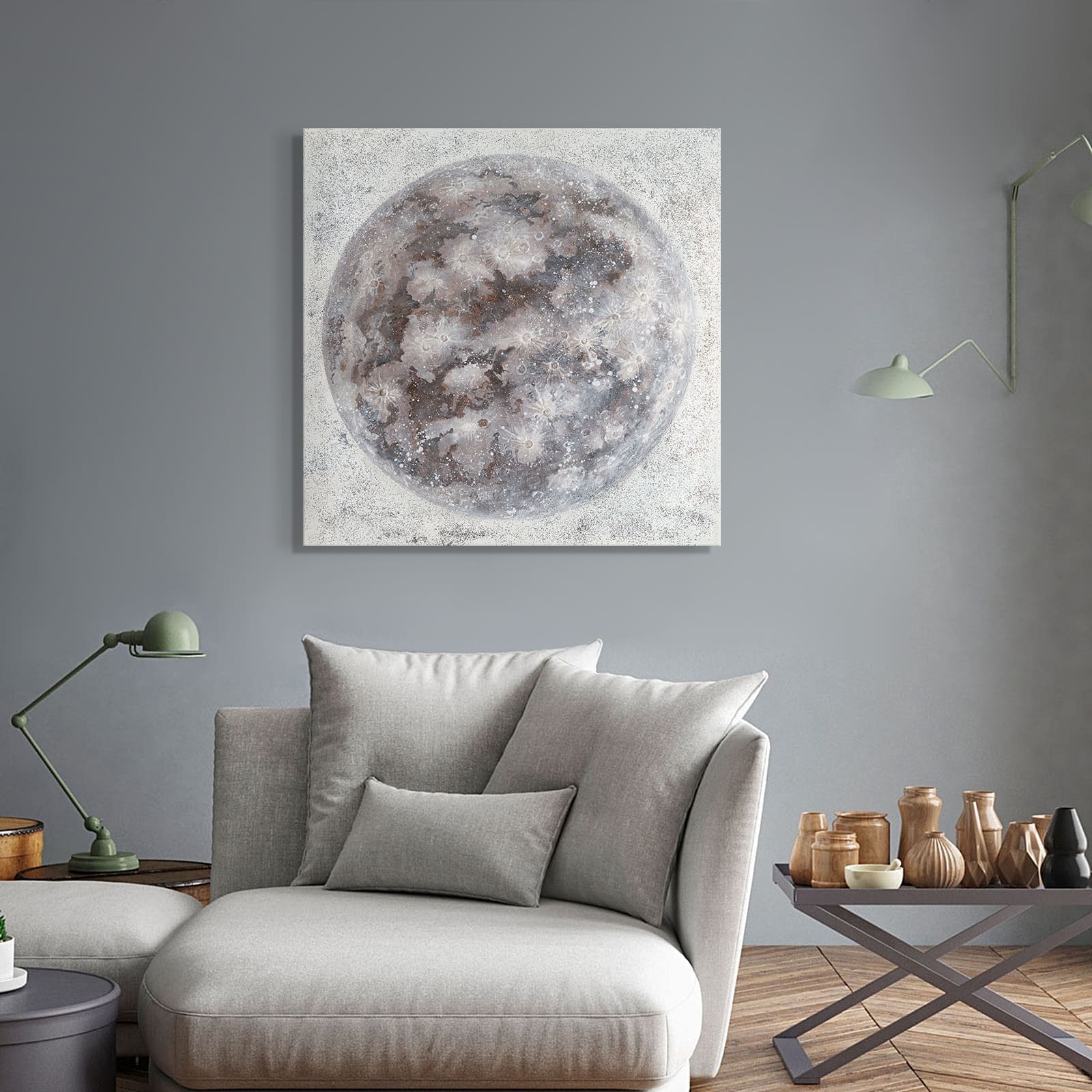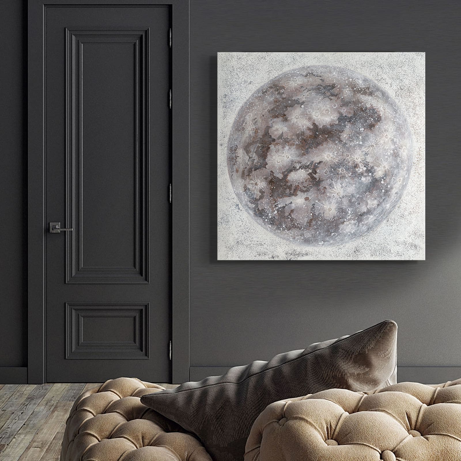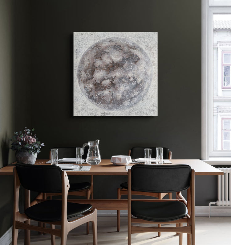 El cuadro RODÓ es una obra pintada a mano sobre lienzo, que representa la mística y belleza de la luna. Con su diseño artístico, esta pieza aporta un aire sereno y evocador a cualquier espacio.