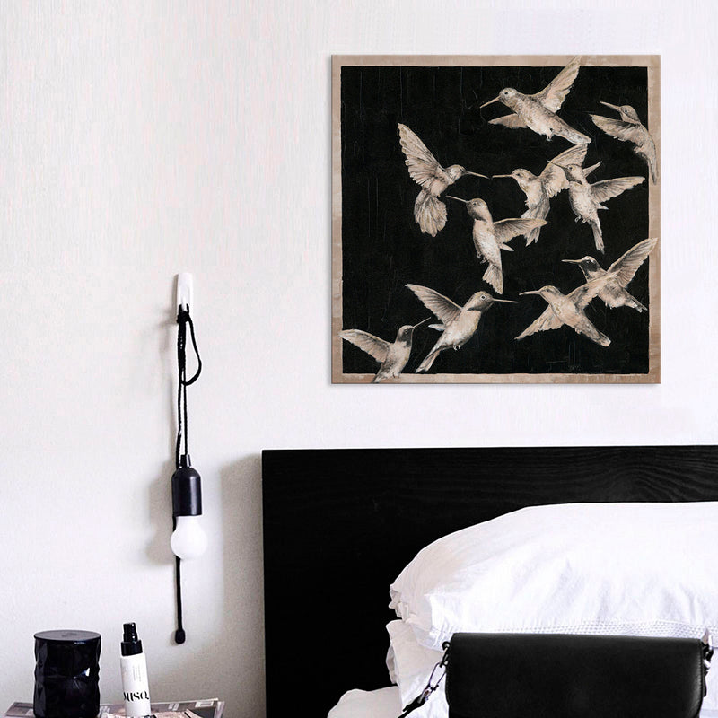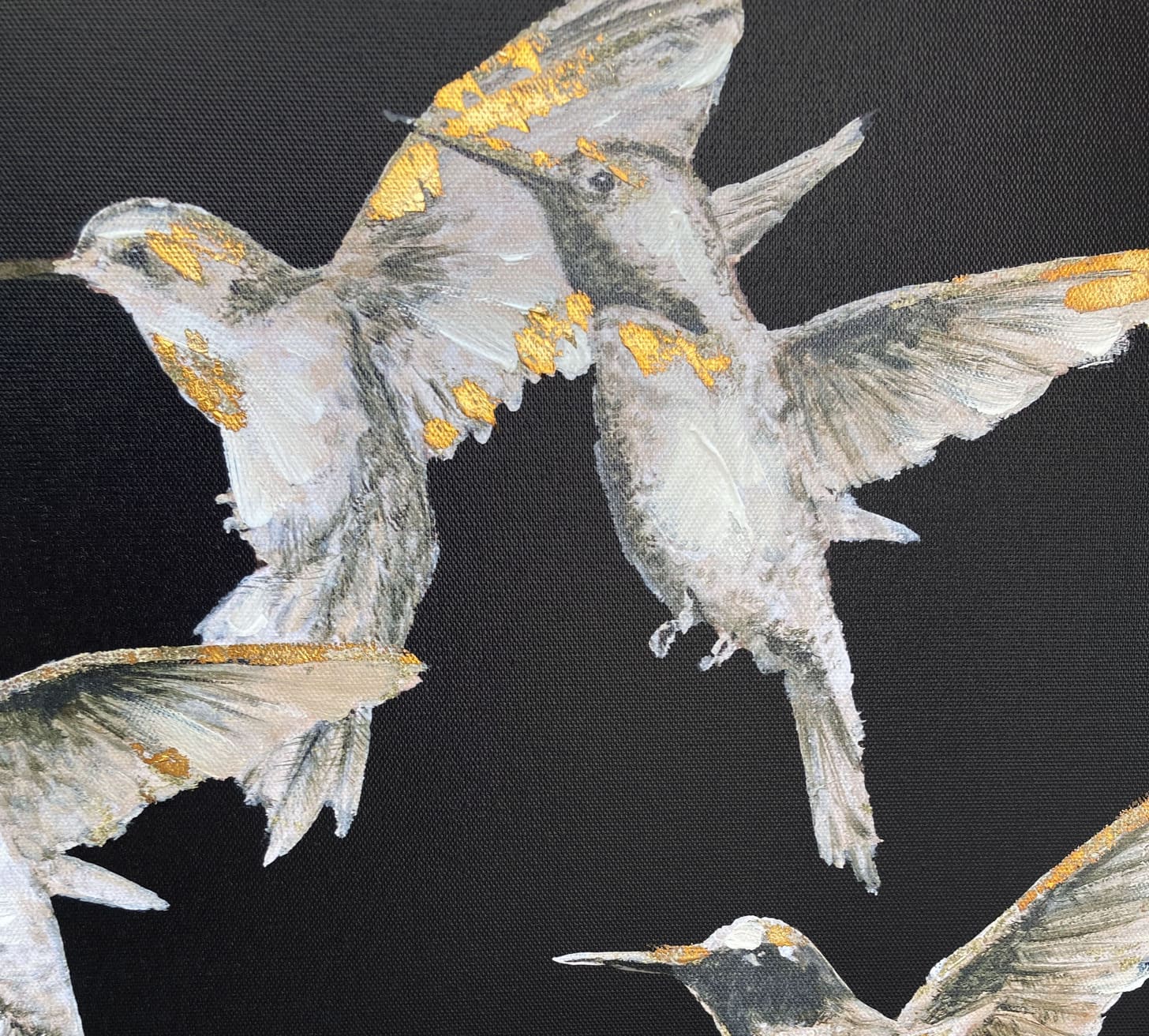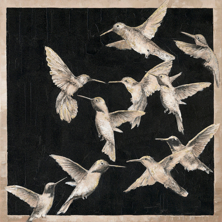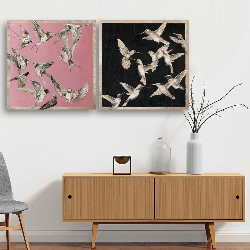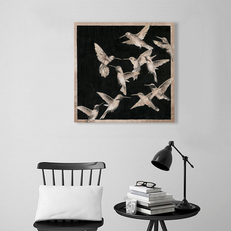 El cuadro TALAYUELO presenta un diseño con el motivo de aves sobre un fondo negro, resaltado con detalles dorados que añaden un toque sofisticado y moderno. Perfecto para añadir un aire delicado y elegante a cualquier espacio.