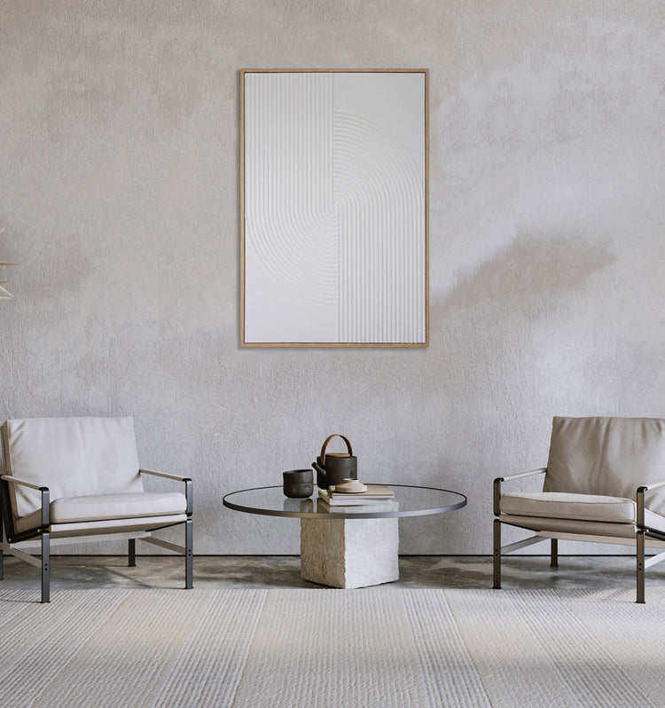 Este cuadro decorativo en espuma de poliuretano con detalles en relieve 3D pintados en tonos neutros es ideal para añadir un toque moderno y sofisticado a cualquier espacio. Su marco de MDF con acabado natural y la trasera reforzada aseguran durabilidad y estabilidad. El lienzo en tela sintética de poliéster presenta una base impresa al agua, con el relieve 100% pintado a mano, lo que aporta un toque artesanal único.
