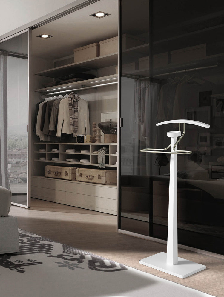 Galán de noche fabricado en madera de haya con un toque metálico en la pantalonera. Dispone además de una bandeja para depositar monedas o joyas. Lo podrás adaptar al estilo de tu hogar gracias a las múltiples opciones de acabados disponibles.