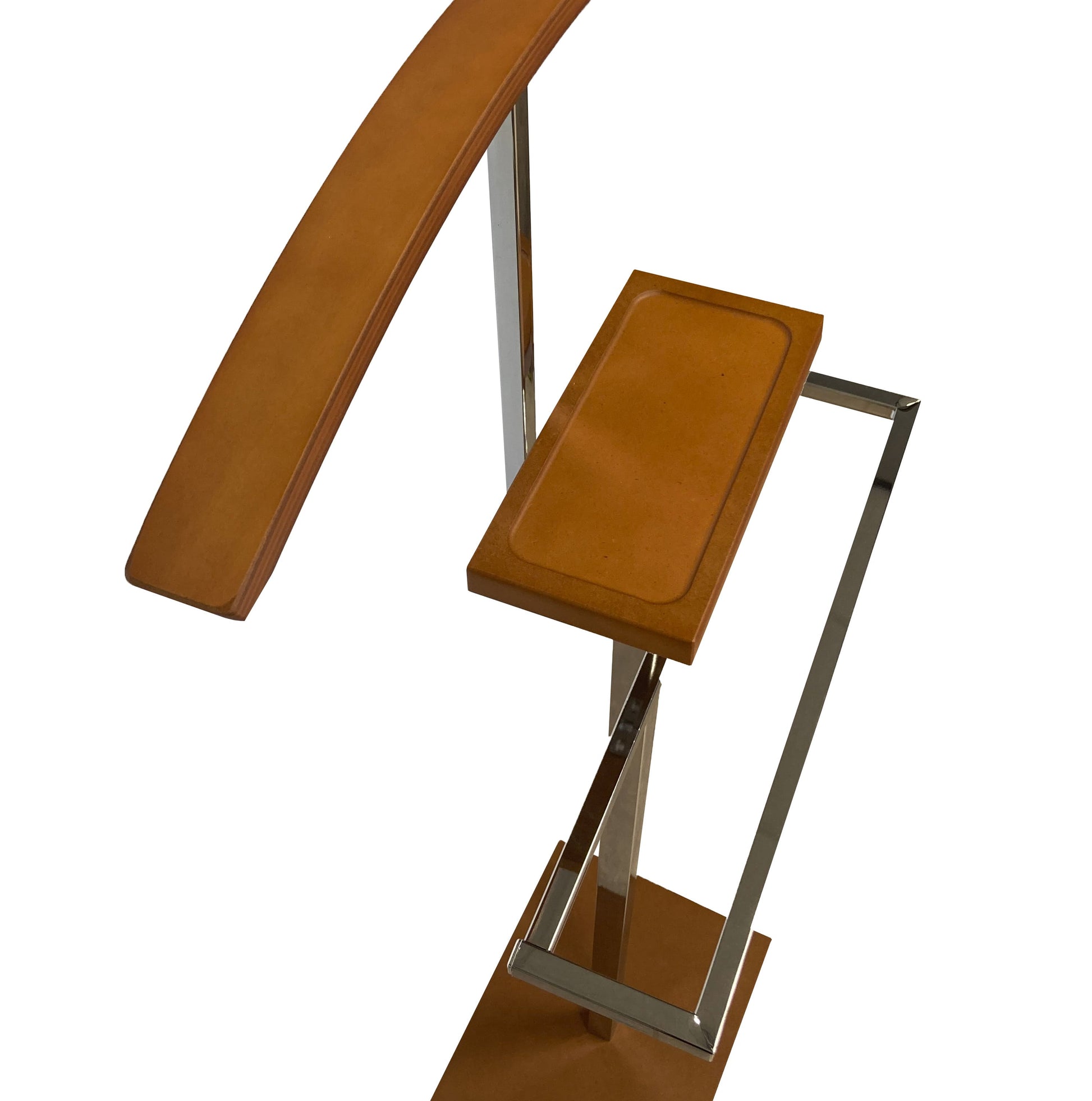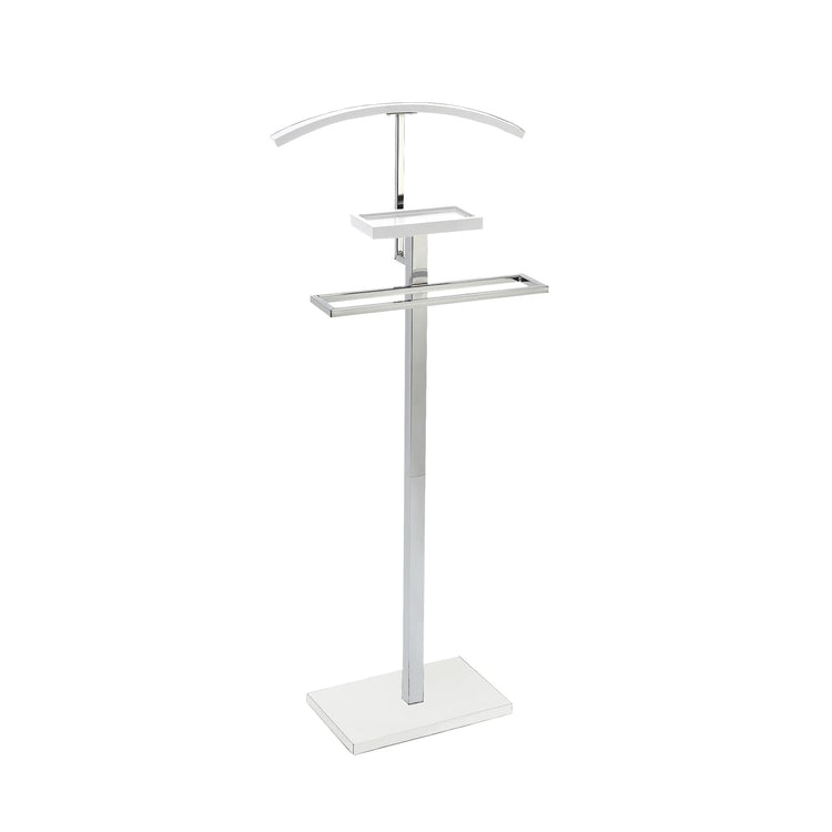 Galán de noche GUIANA, fabricado en metal cromado con detalles en madera lacada en blanco o en acabado color cerezo. Su diseño sencillo y moderno lo convierte en un complemento funcional para el dormitorio, ideal para organizar prendas sin arrugas y tenerlas siempre a mano. Las medidas son 110 cm de alto y 45x20 cm en la base.