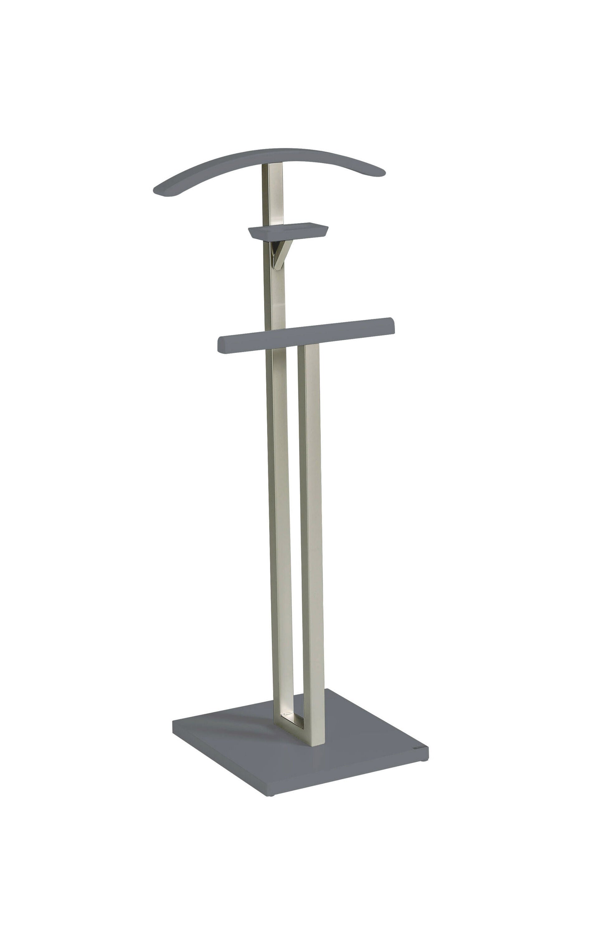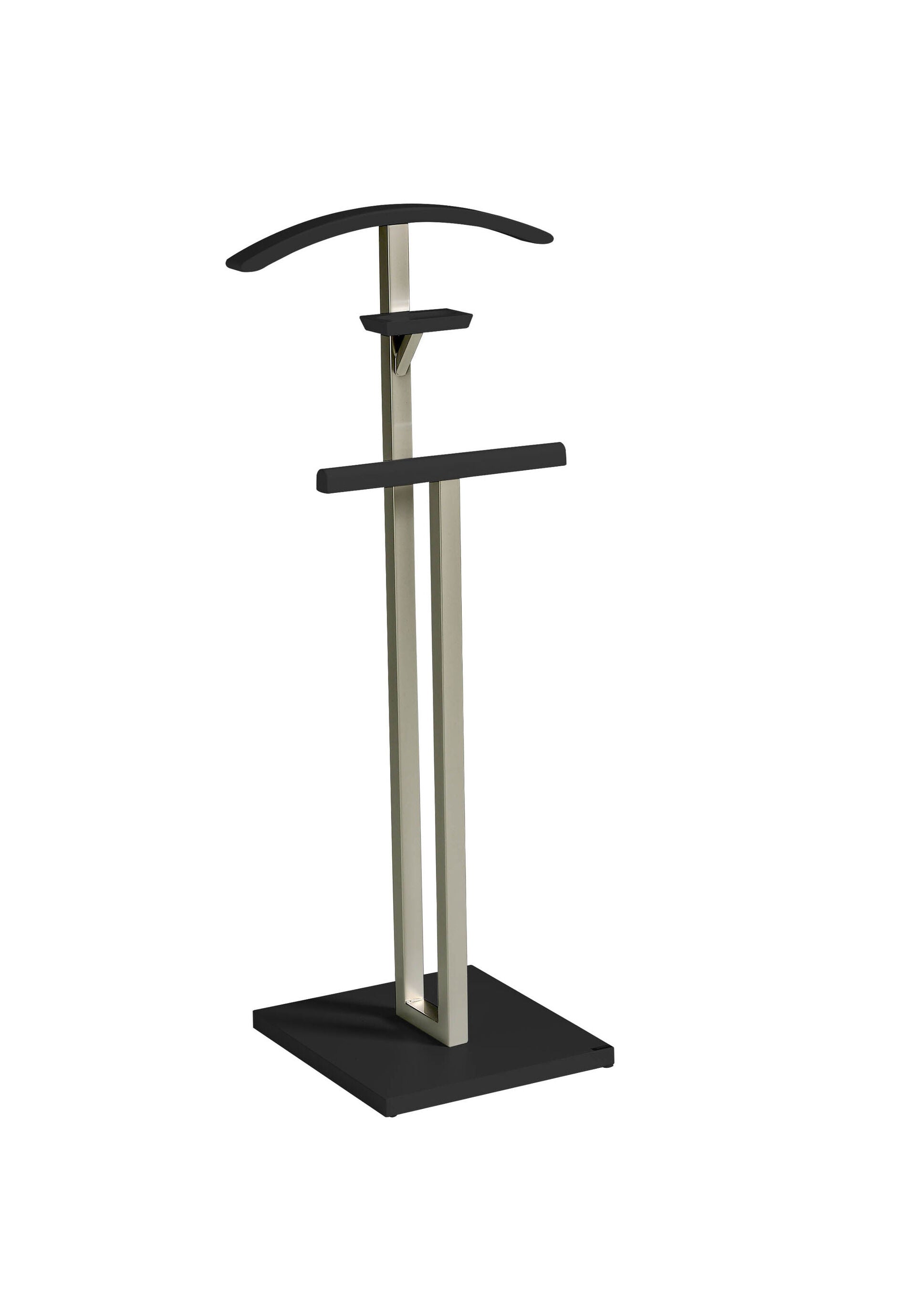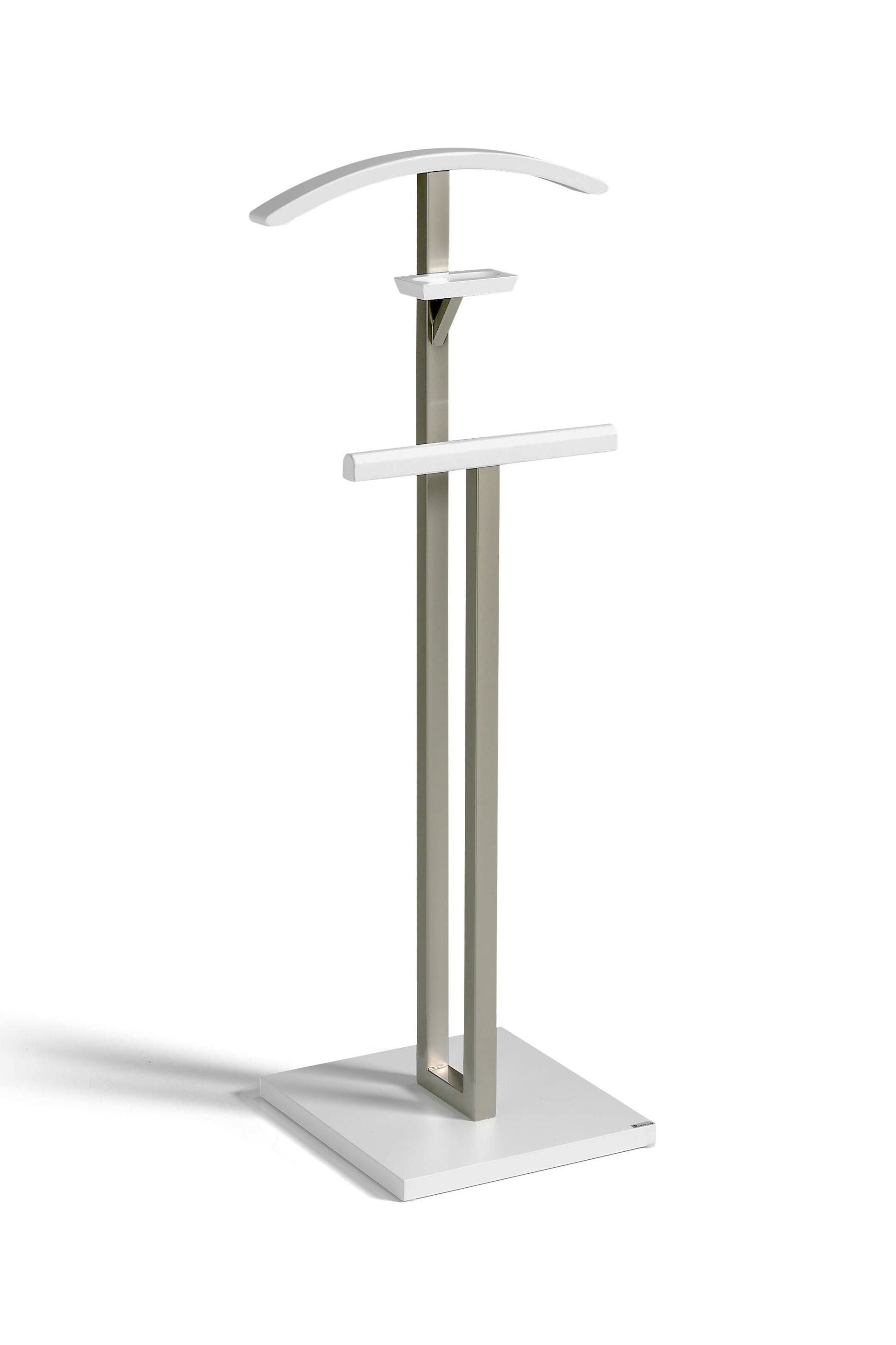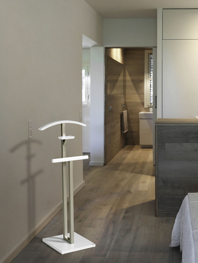 Galán de noche con doble mástil en metal cromado y detalles en madera de haya. Diseño sencillo y moderno compuesto por la percha, la pantalonera y una bandejita para dejar pequeños objetos. Disponible en una gran variedad de acabados, dándote la oportunidad de adaptarlo al estilo de tu dormitorio.