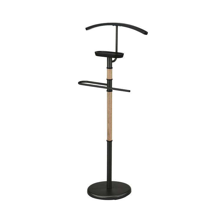 Galán de noche MANZANEDA, que combina madera de roble con metal en color negro y blanco. Formado por percha, pantalonera y una pequeña bandeja, será el mejor accesorio para mantener el orden en el dormitorio. Las medidas son 110 cm de alto y 45x28 cm en la base.