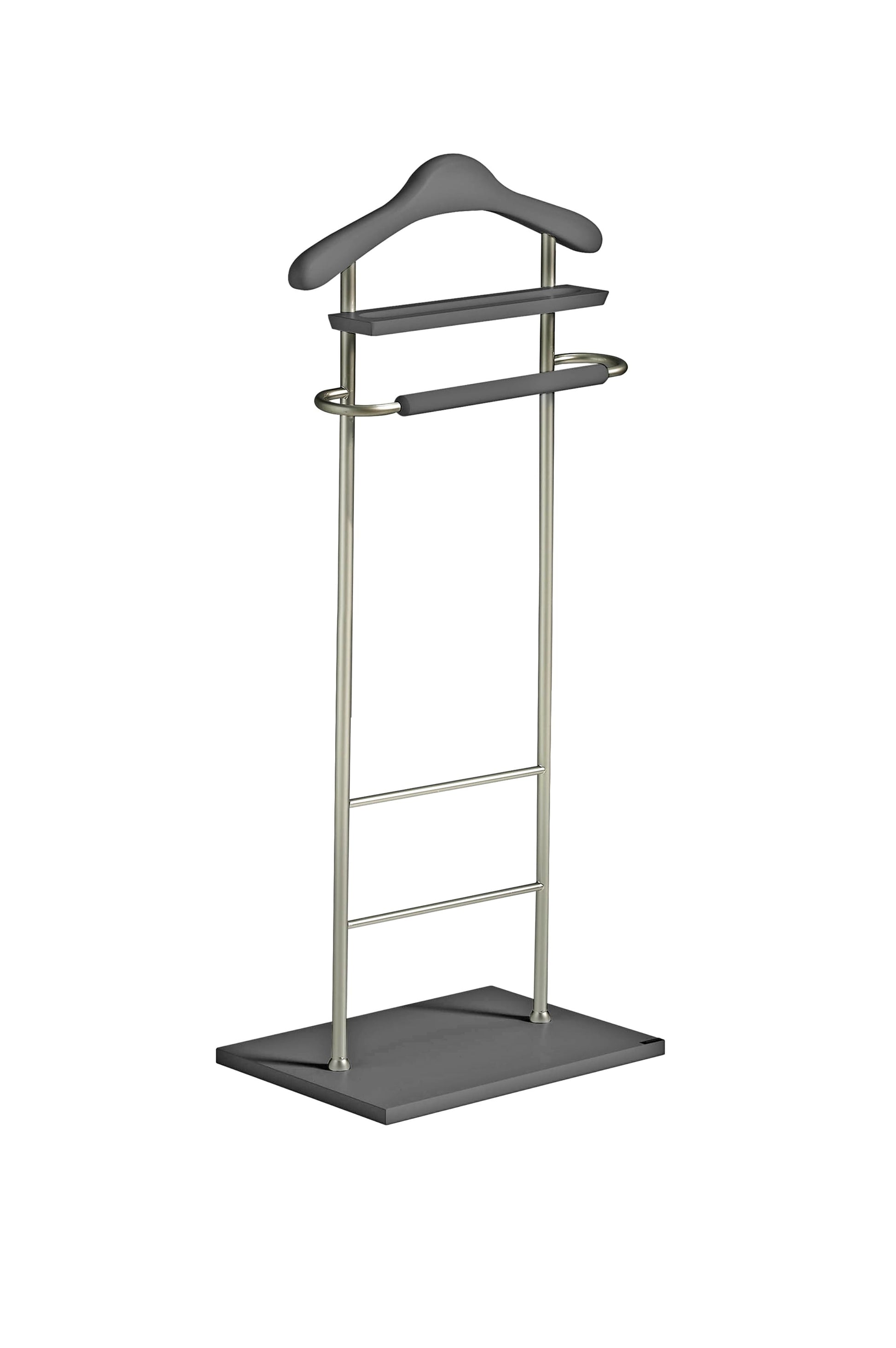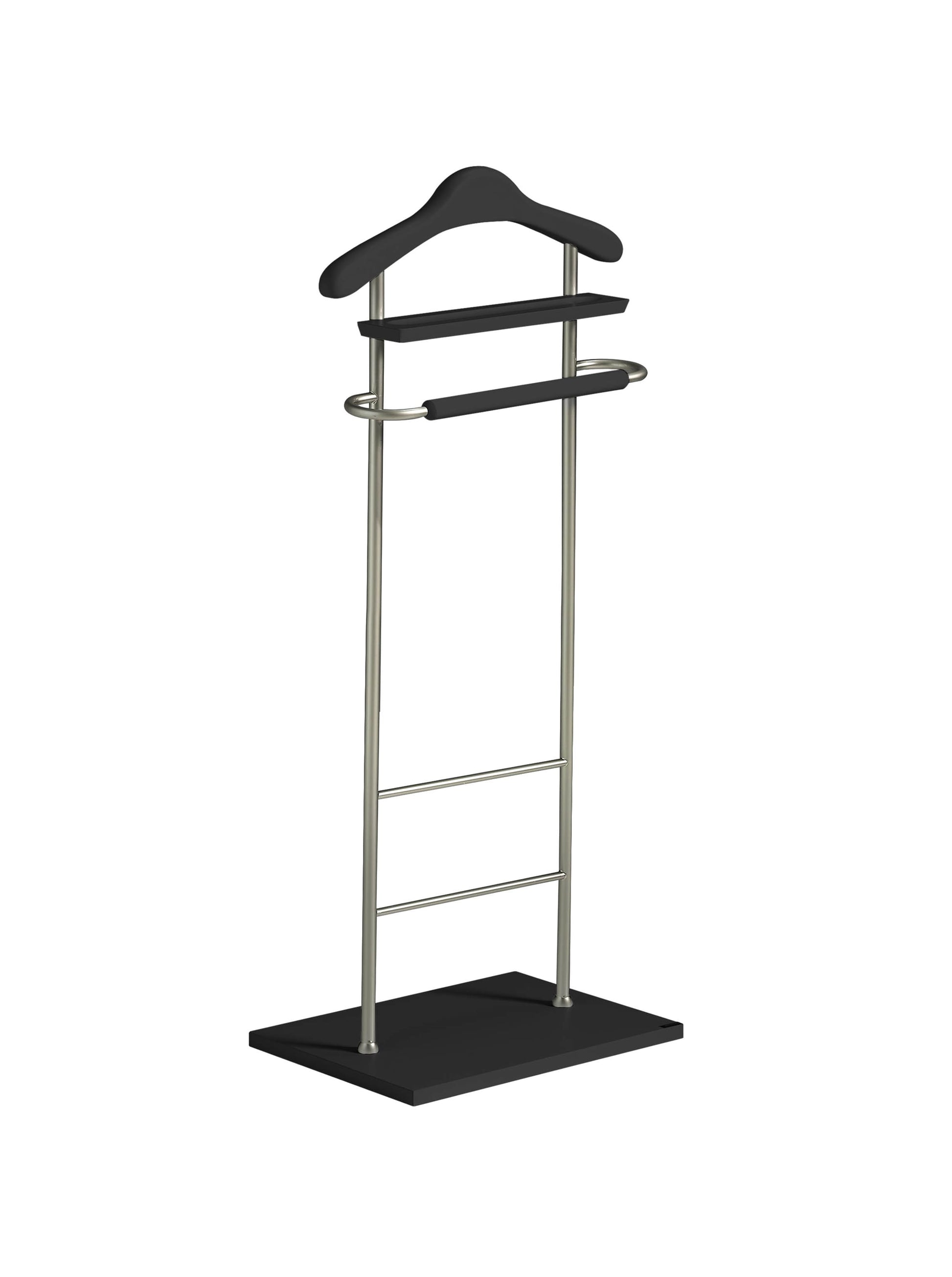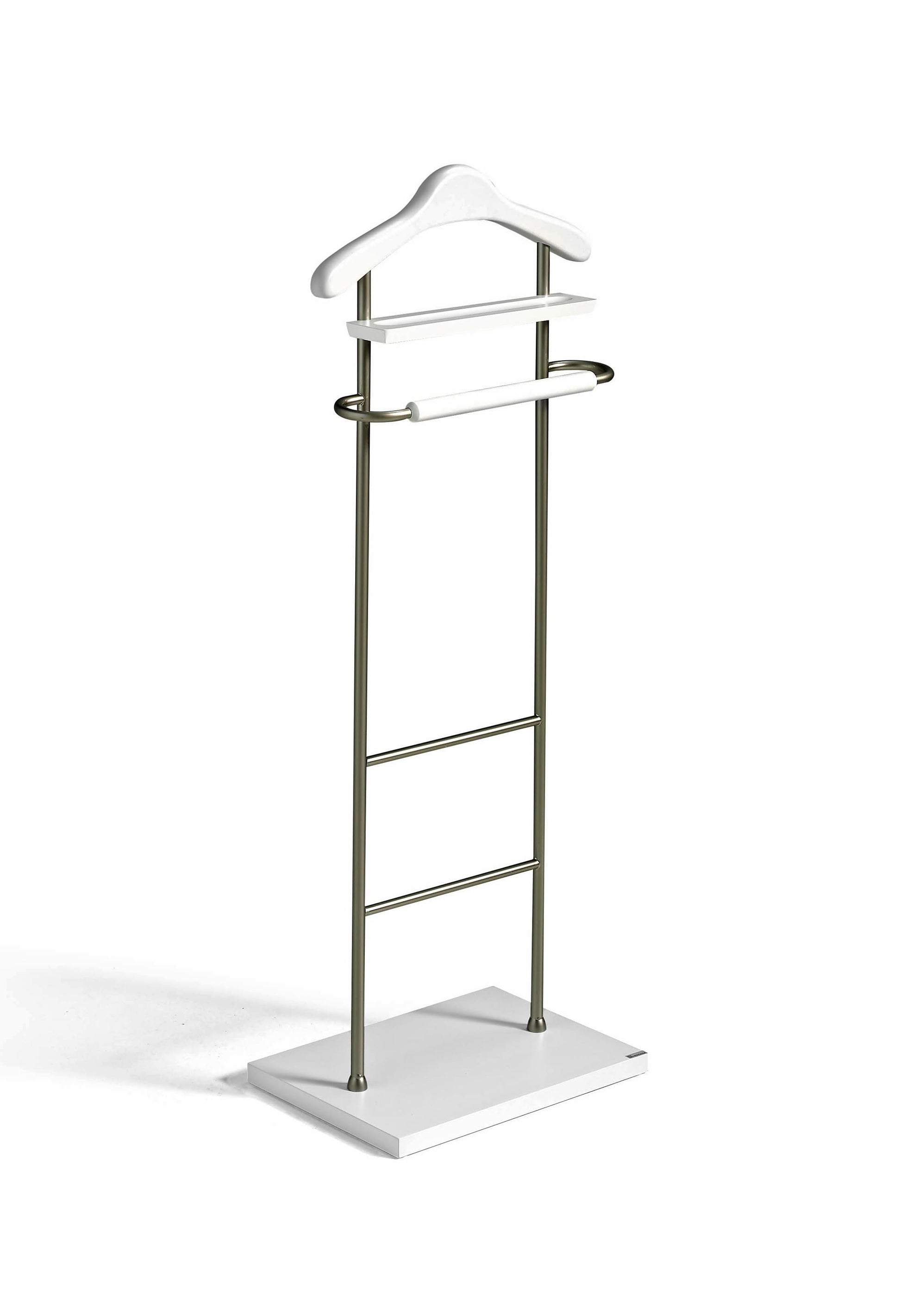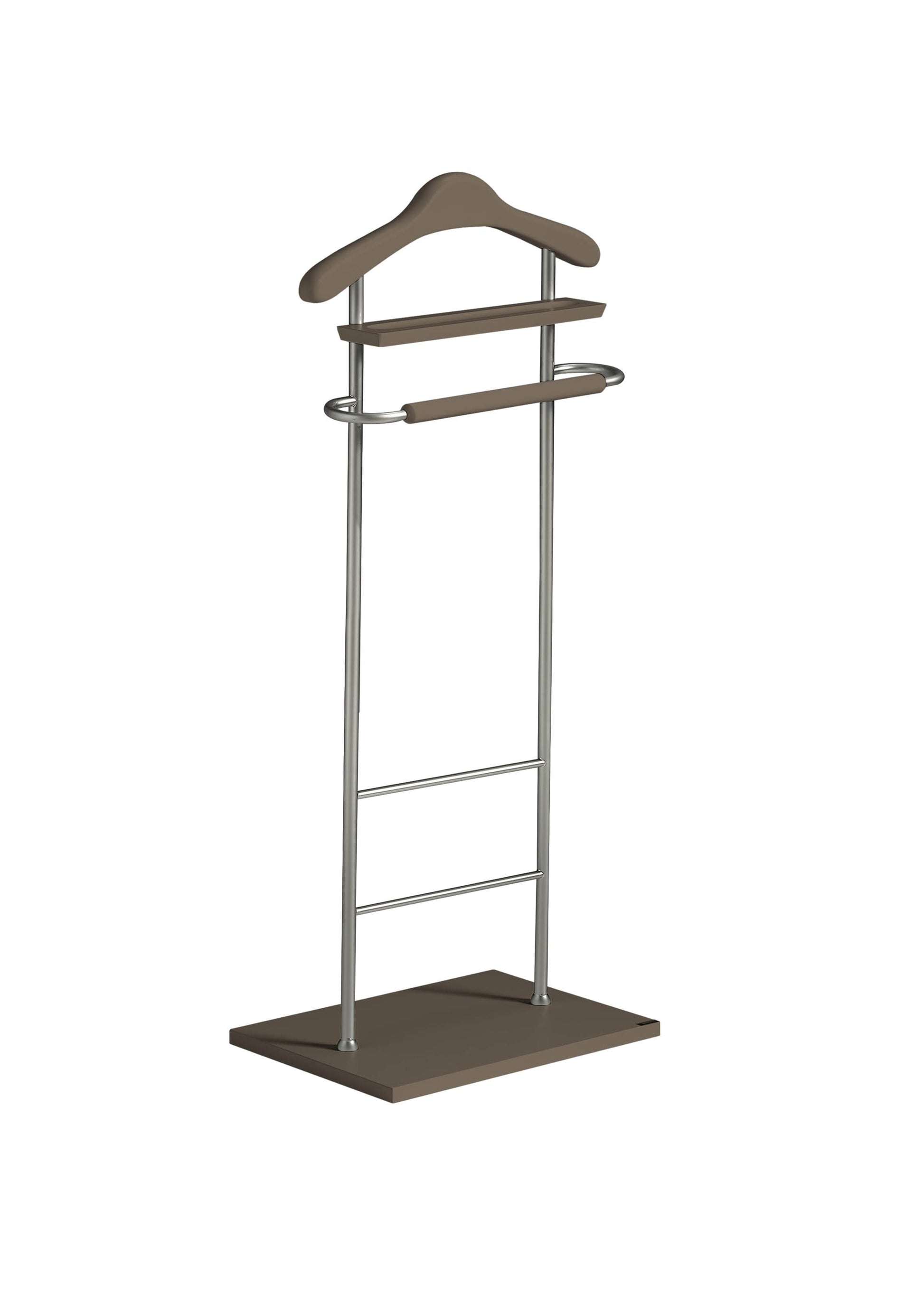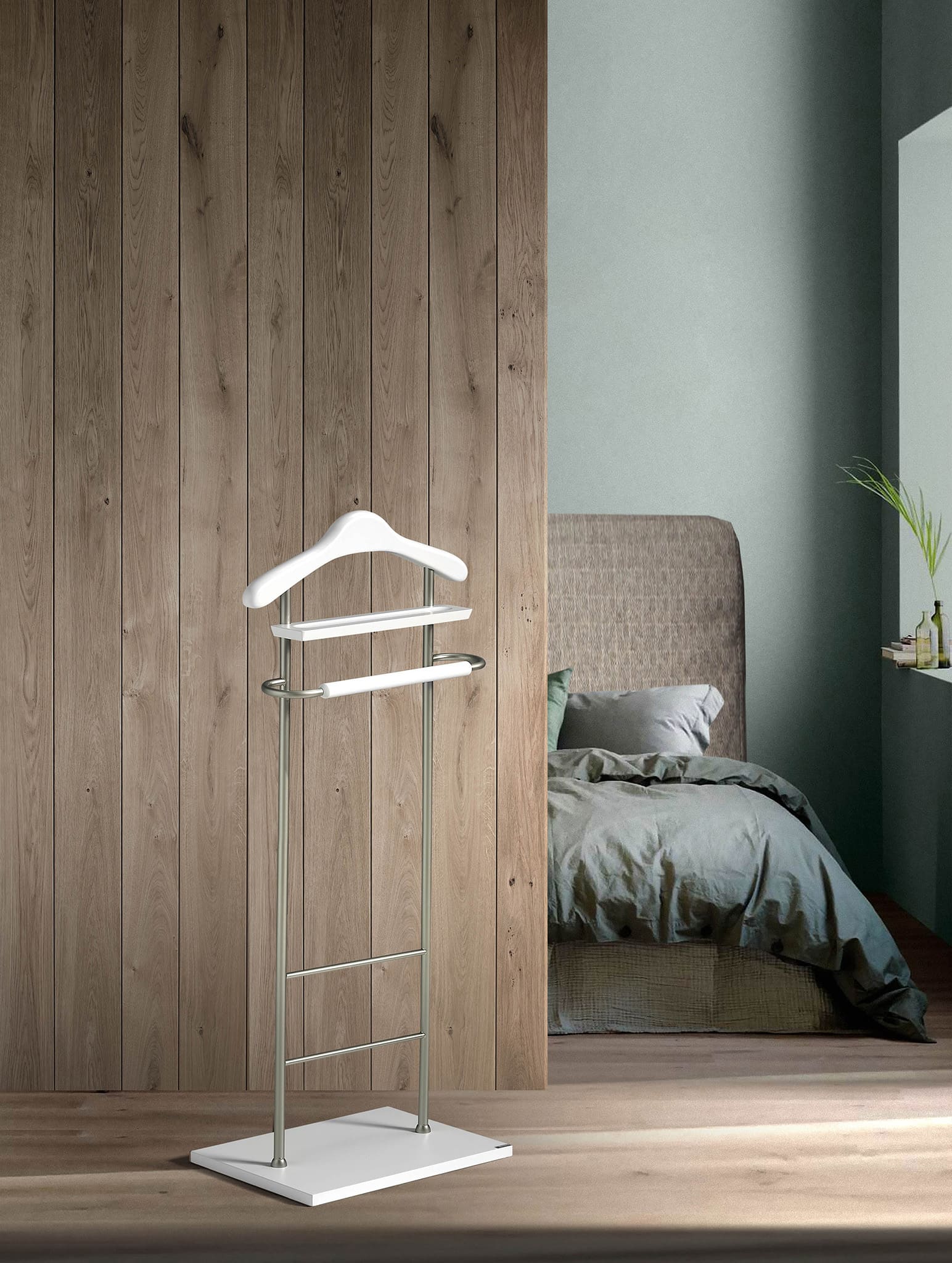 Galán de noche fabricado en madera de haya y estructura metálica. Su diseño moderno combina una base robusta con líneas estilizadas, integrando la clásica percha, pantalonera y una práctica bandeja superior ideal para vaciabolsillos. Los elementos de madera pueden lacarse en múltiples colores, adaptándose a distintos estilos de dormitorio.