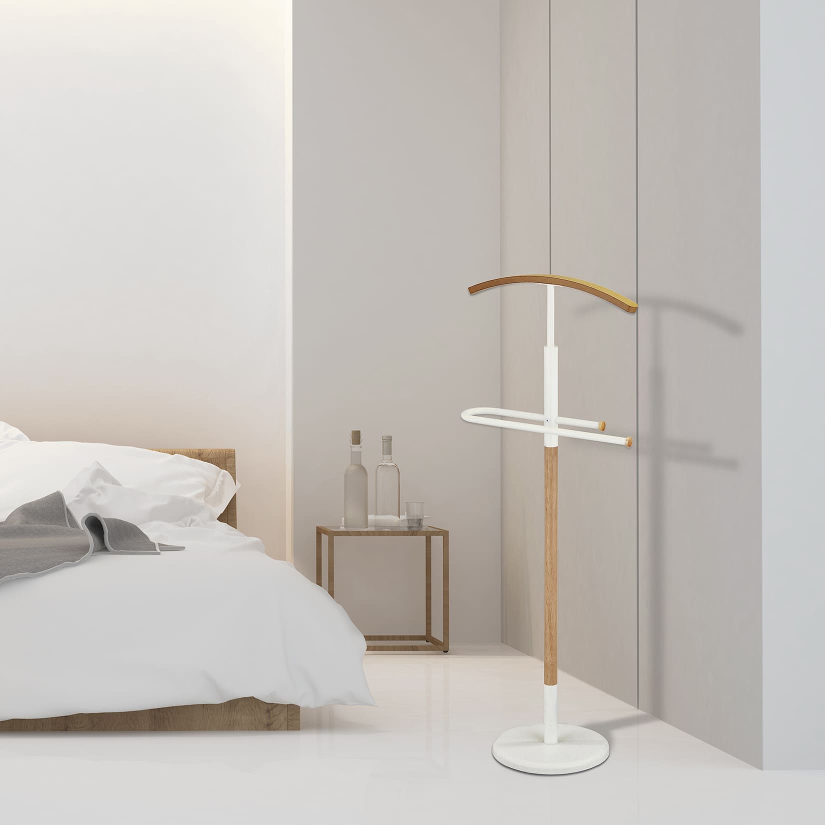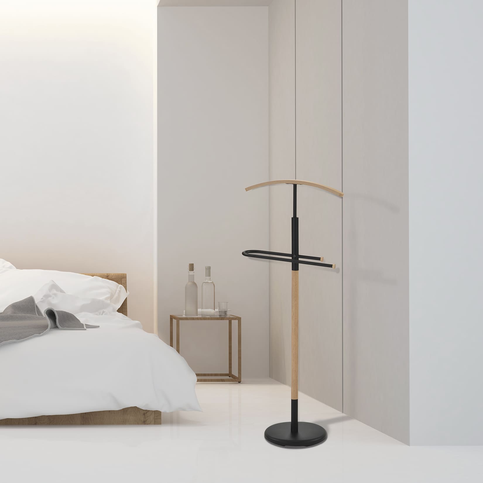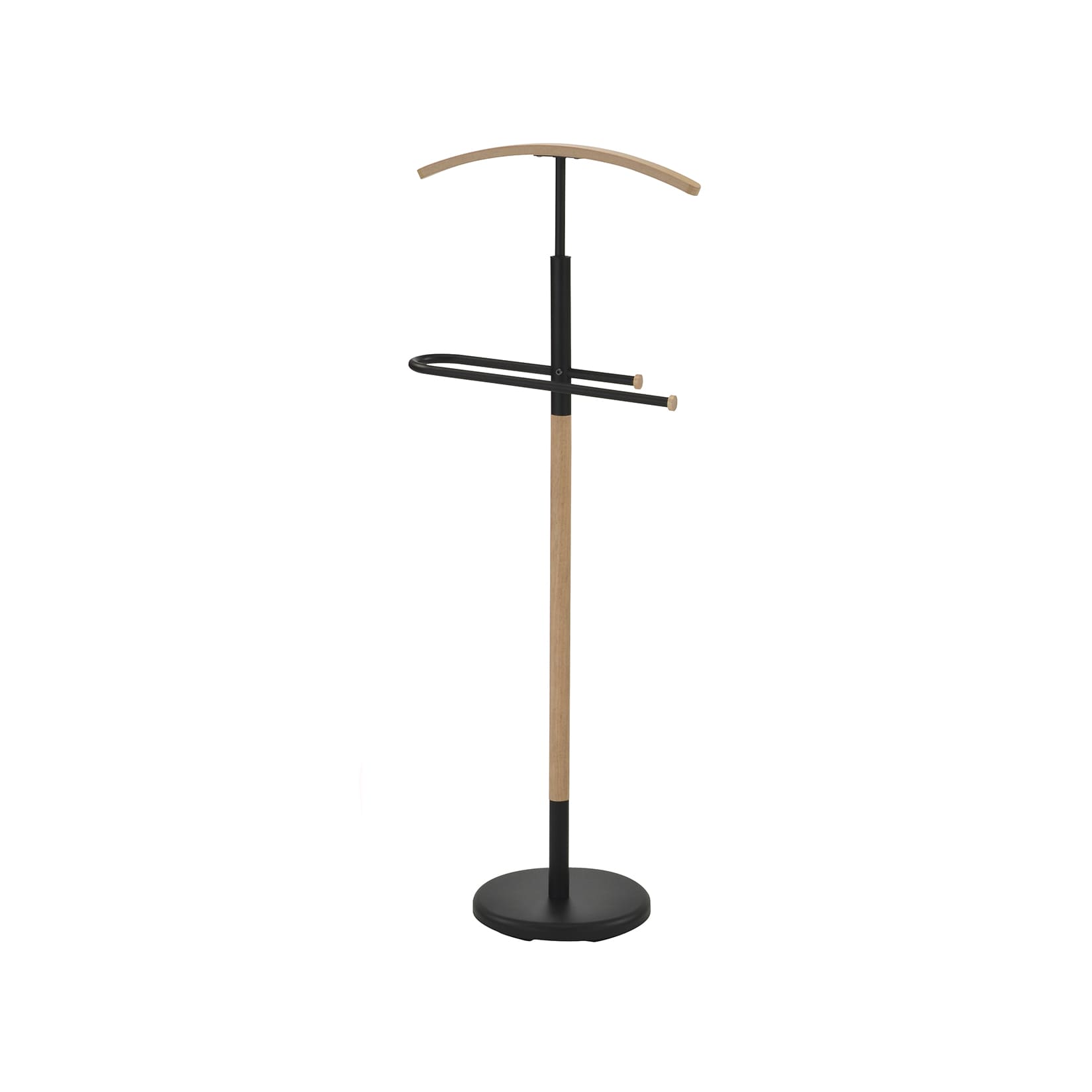 Galán de noche SANGUIÑAL, que combina madera de roble con metal en color negro y blanco. Formado por percha y pantalonera, será el mejor accesorio para mantener el orden en el dormitorio con un estilo actual y funcional. Las medidas son 120 cm de alto y 47x28 cm en la base.