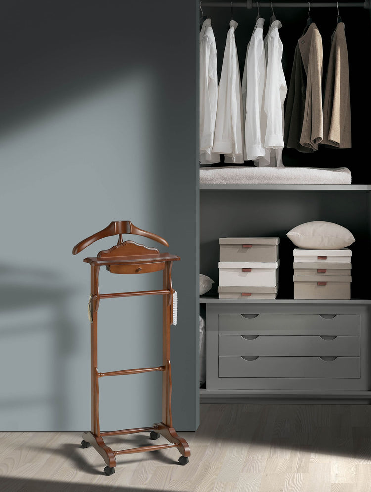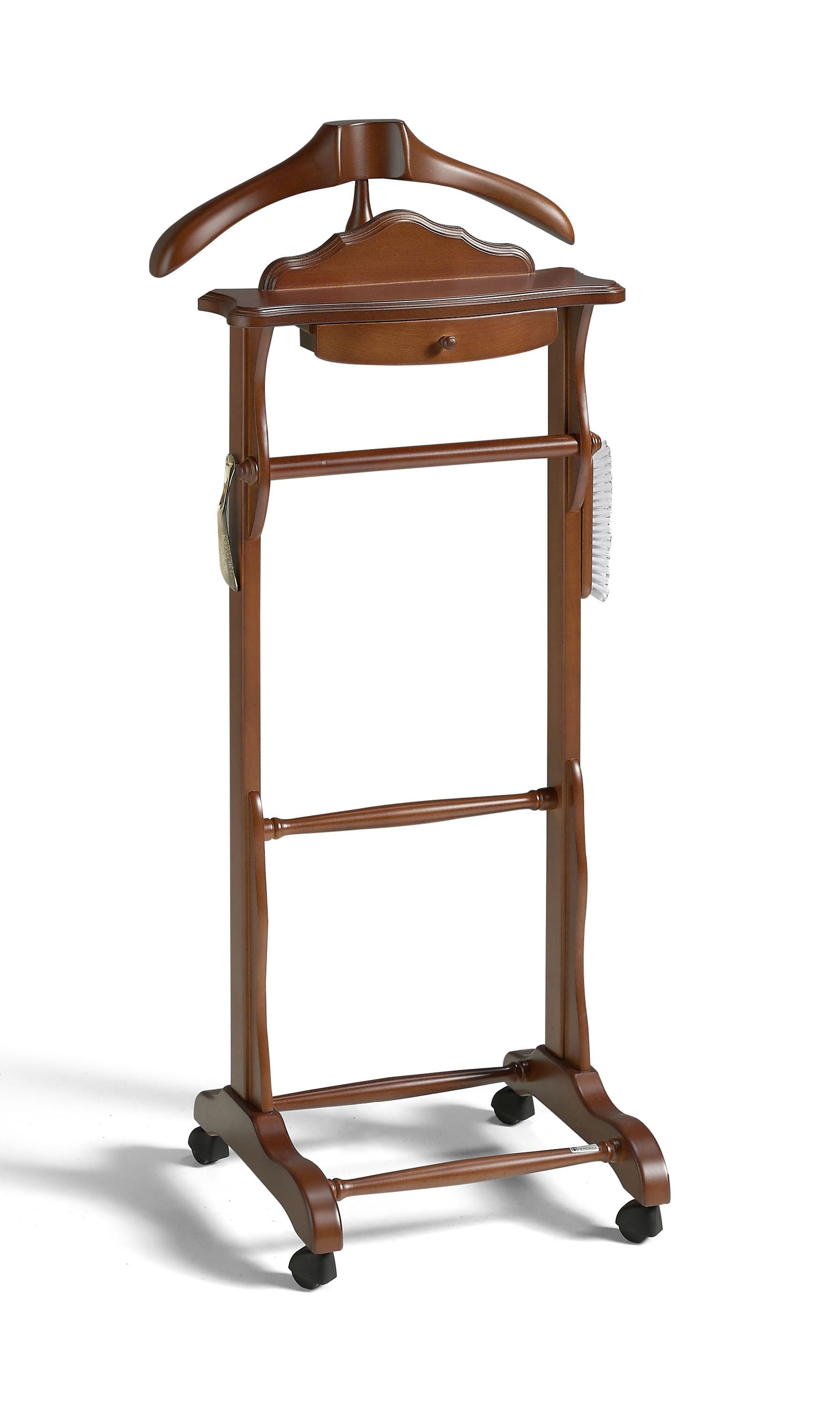 Galán de noche fabricado en madera de haya. De diseño clásico, este galán incluye ruedas para facilitar su desplazamiento y un práctico cajón. Además, se sirve con cepillo y calzador incluidos, aportando una funcionalidad extra. Lo podrás adaptar lacándolo en cualquiera de nuestros colores disponibles.