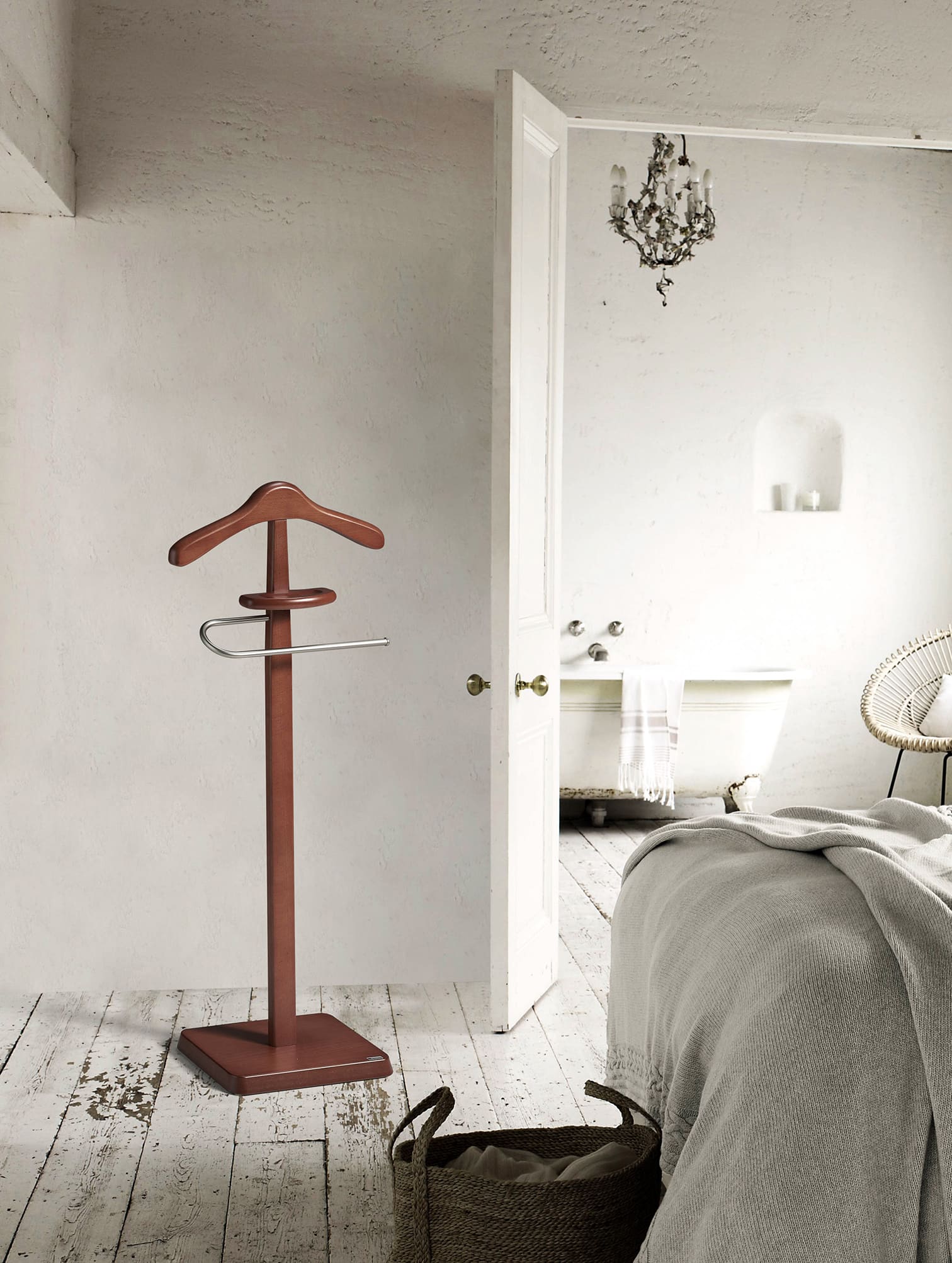 Galán de noche fabricado en madera de haya con un toque metálico en la pantalonera. Dispone además de una bandeja para depositar monedas o joyas. Lo podrás adaptar al estilo de tu hogar gracias a las múltiples opciones de acabados disponibles.