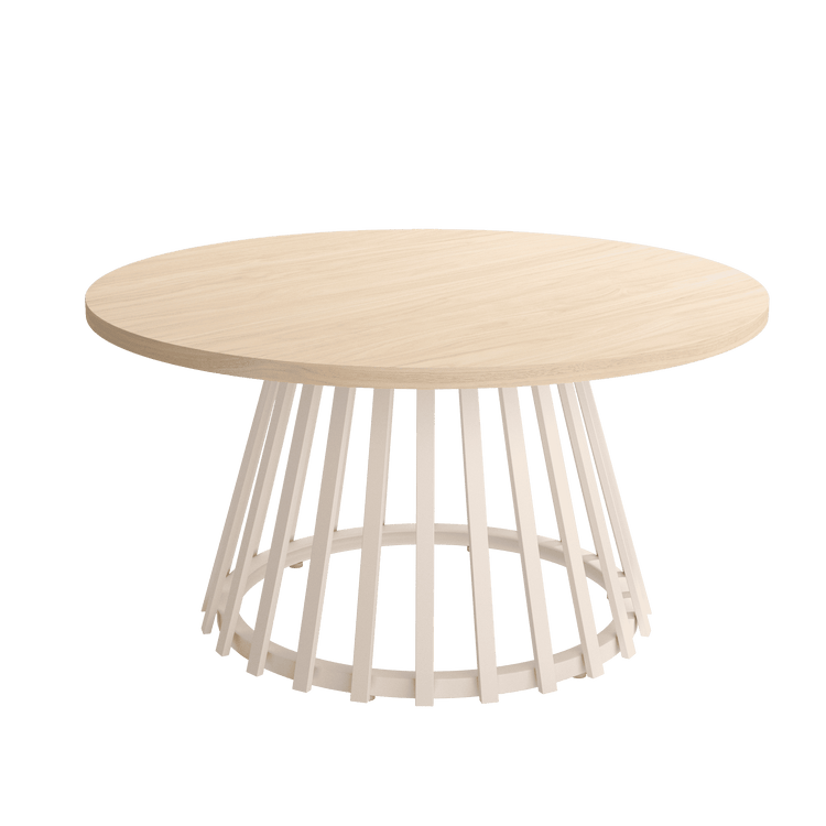 GAMO es una mesa auxiliar redonda con un diseño distintivo que destaca por su estructura metálica en acabado marfil o negro, ideal para aportar estilo y funcionalidad a cualquier rincón del hogar. Su sobre de 22 mm en acabado melamínico ofrece resistencia y una estética cuidada, perfecta para complementar sofás, rinconeras o espacios de paso.
