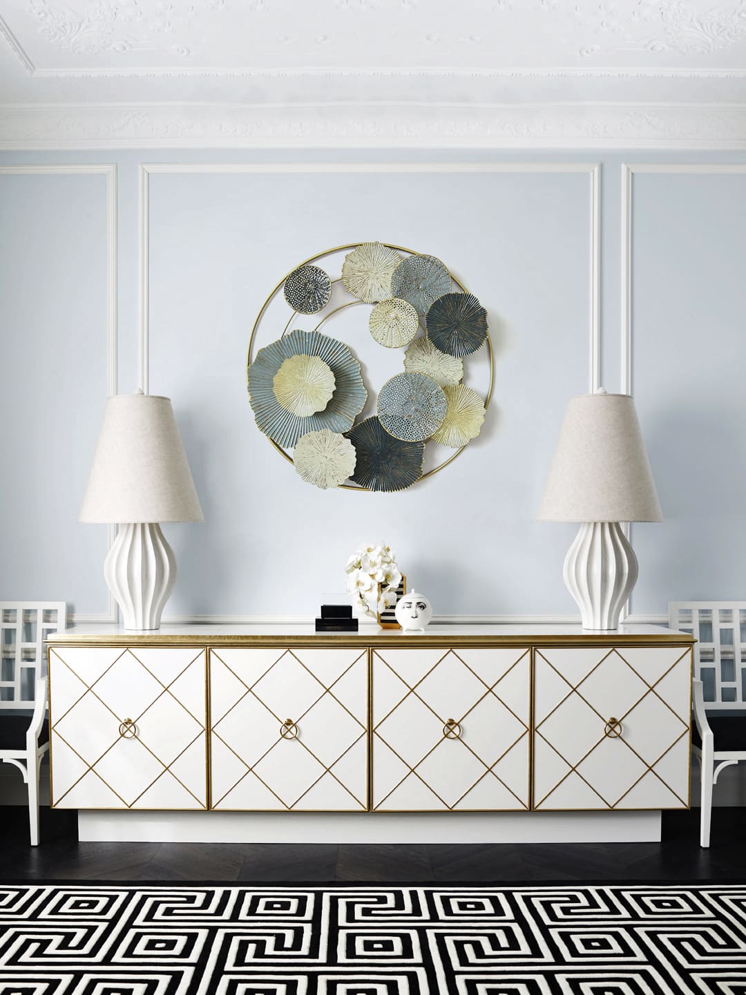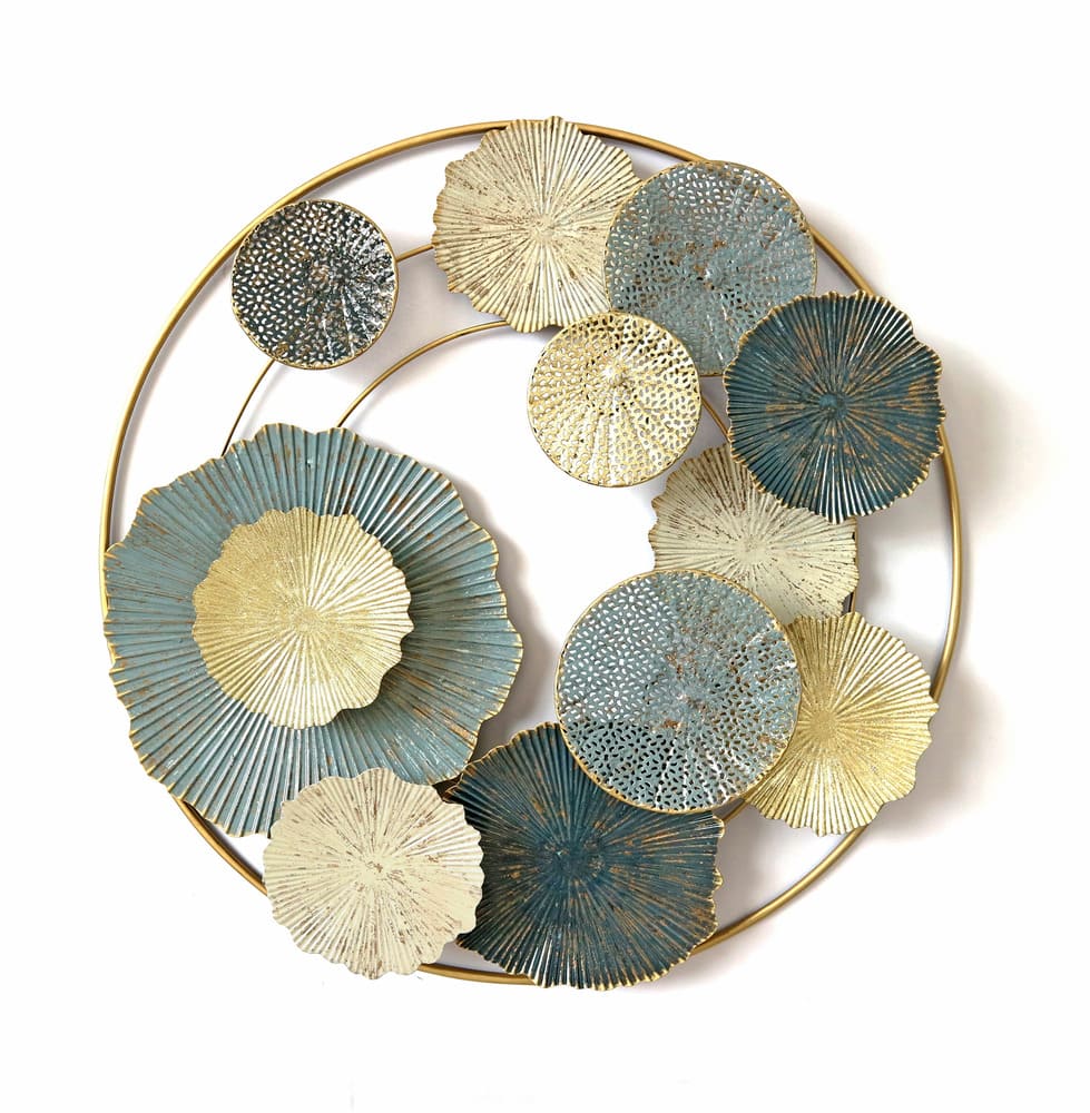 Pieza decorativa sofisticada que combina aros dorados con platos metálicos en distintos tamaños y texturas. Sus tonos azules y metalizados aportan un estilo moderno y elegante, ideal para realzar cualquier ambiente.
