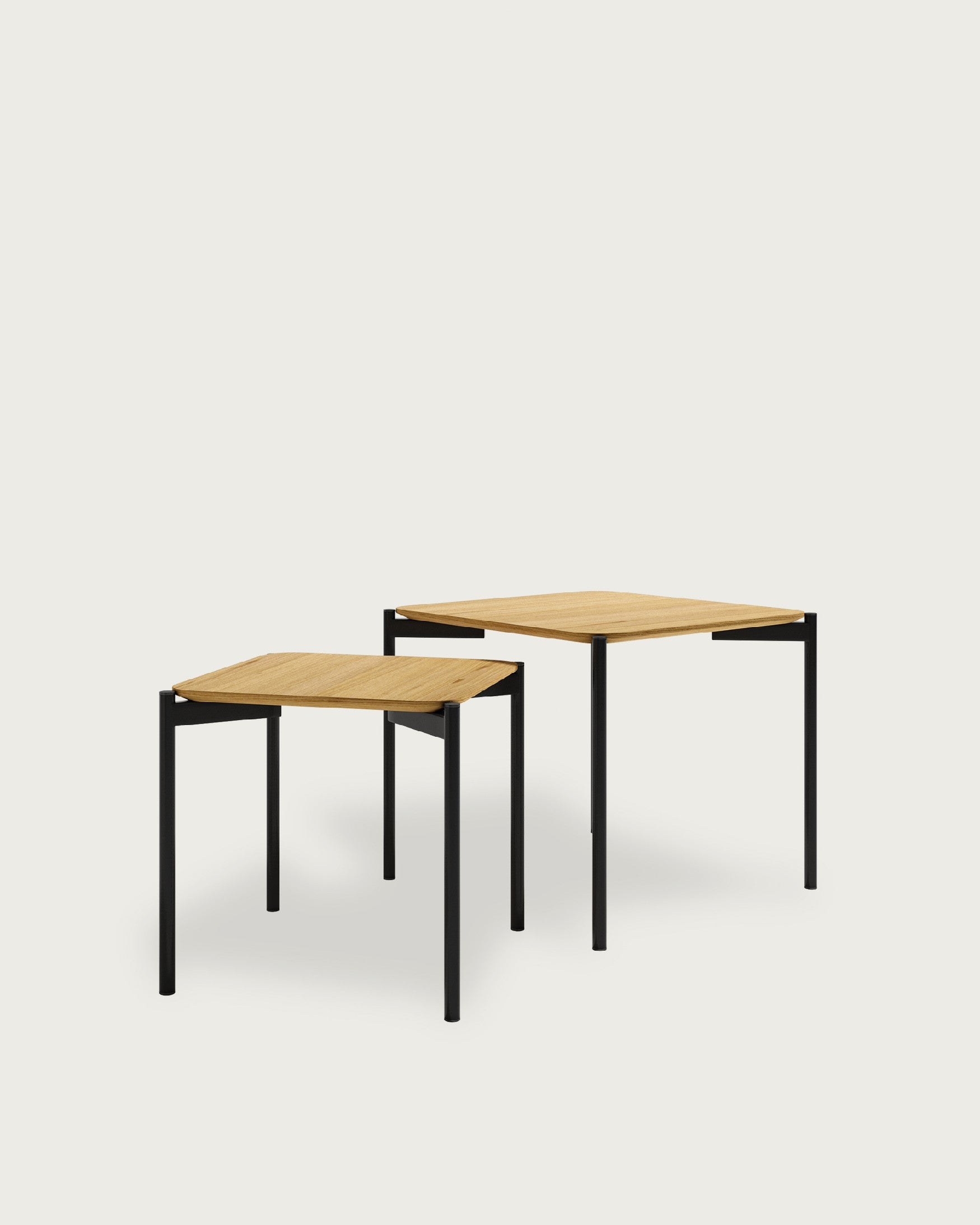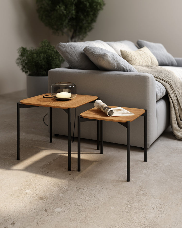 Conjunto de 2 mesas auxiliares cuadradas con tapa de roble natural y patas metálicas negras. Pensadas para usarse juntas o por separado, se encajan fácilmente y ofrecen superficies de apoyo extra donde las necesites. El bisel de 19 mm aligera la pieza y protege el canto en el uso diario.