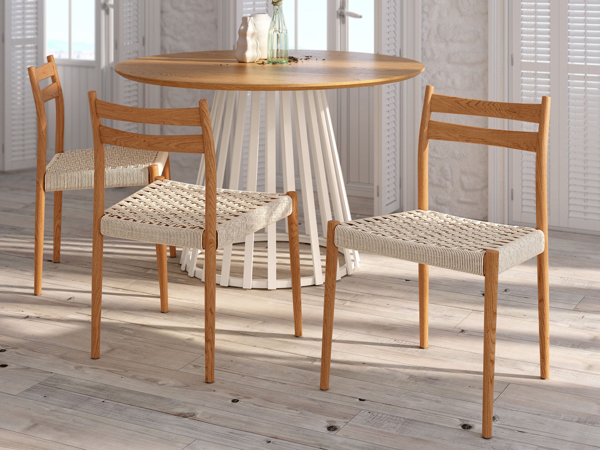 La silla Bacares presenta un diseño clásico de líneas rectas, con estructura de madera maciza y asiento de cuerda natural trenzada a mano. Su estilo sencillo y funcional la convierte en una opción versátil para cocinas, comedores o ambientes de estilo rústico o mediterráneo.