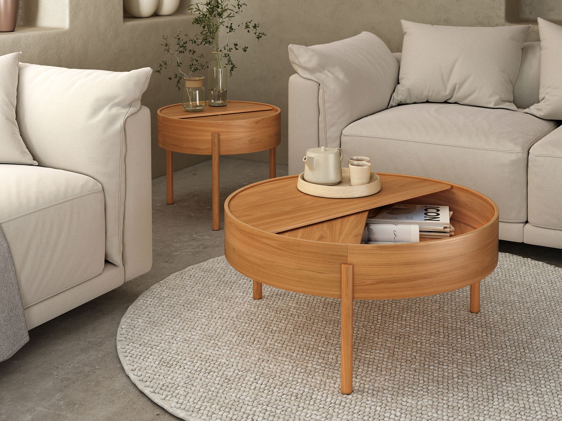 Las mesas auxiliares JAUCA, fabricadas en madera de roble natural, combinan funcionalidad y diseño. Su sobre giratorio esconde un práctico compartimento interior, ideal para guardar pequeños objetos. Una pieza versátil para salones, zonas de lectura o espacios contemporáneos que buscan funcionalidad sin renunciar al estilo.