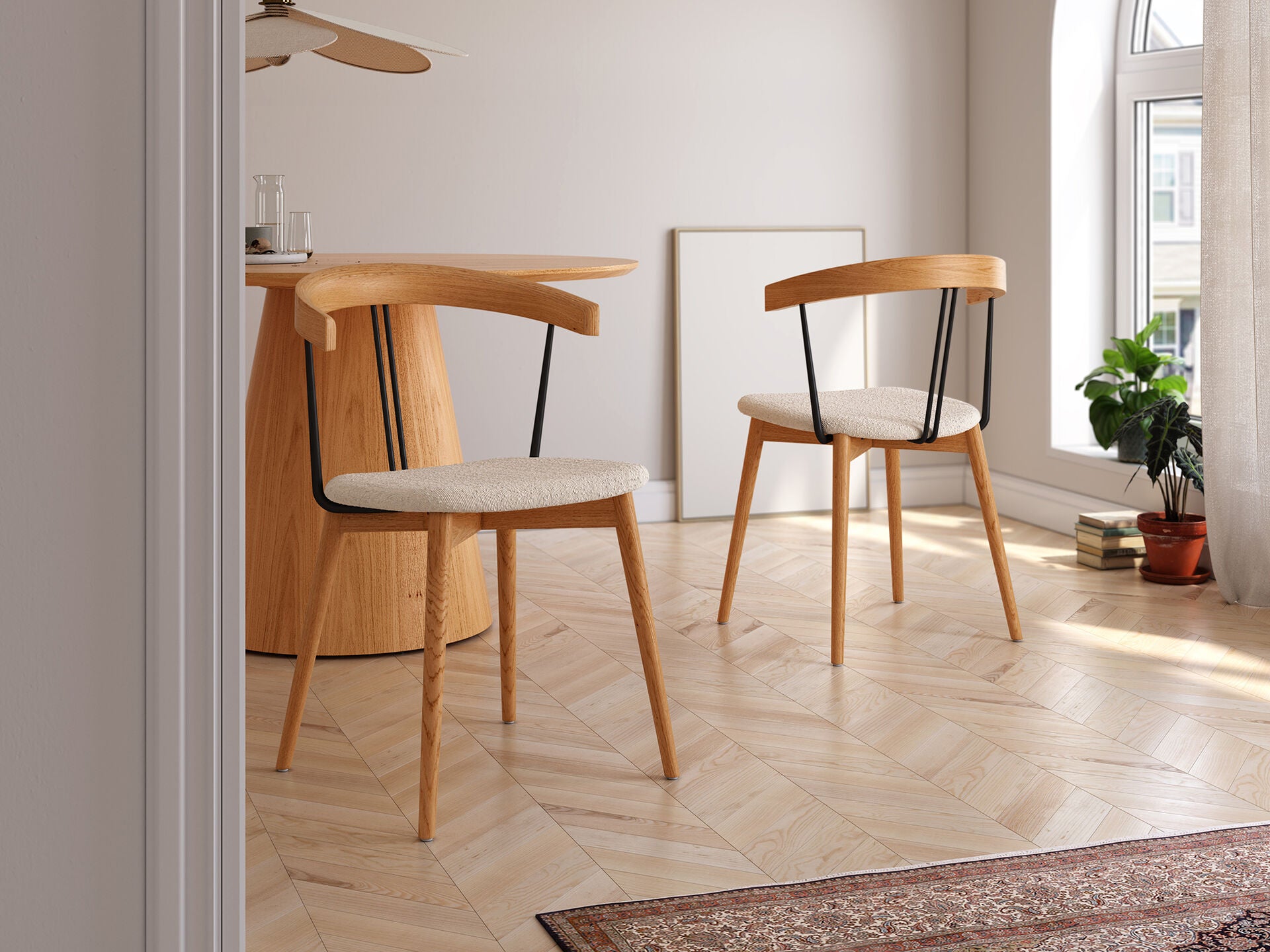 La silla OHANES combina estructura de madera con respaldo metálico, logrando un equilibrio perfecto entre calidez natural y diseño contemporáneo. Su asiento acolchado ofrece gran confort, ideal para espacios contract, comedores o restauración.