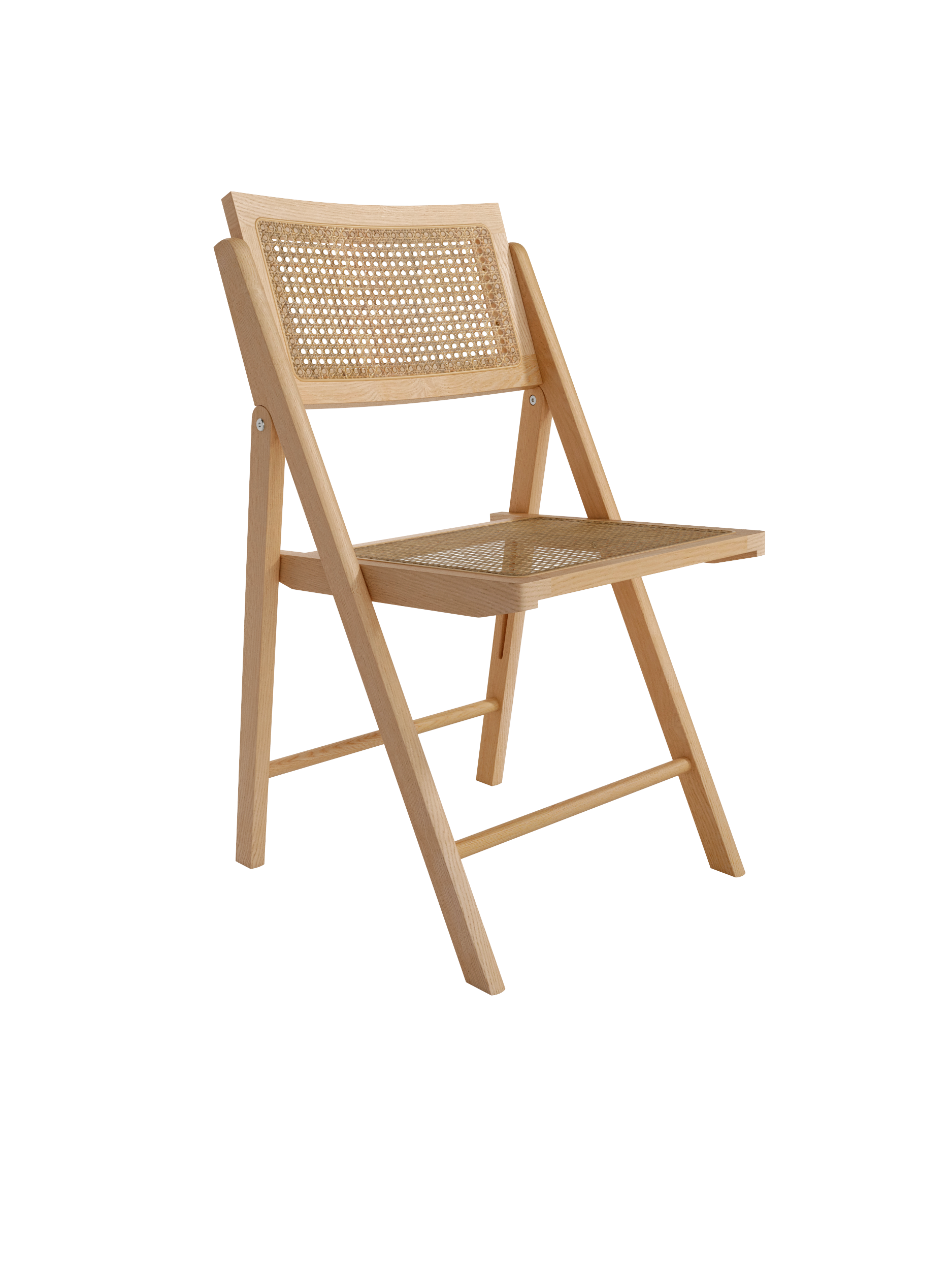 La silla ORIA es una solución funcional con encanto natural. Se trata de una silla plegable fabricada en madera, con respaldo y asiento en ratán que aportan ligereza visual y frescura. Ideal como asiento auxiliar para interior o terrazas cubiertas.