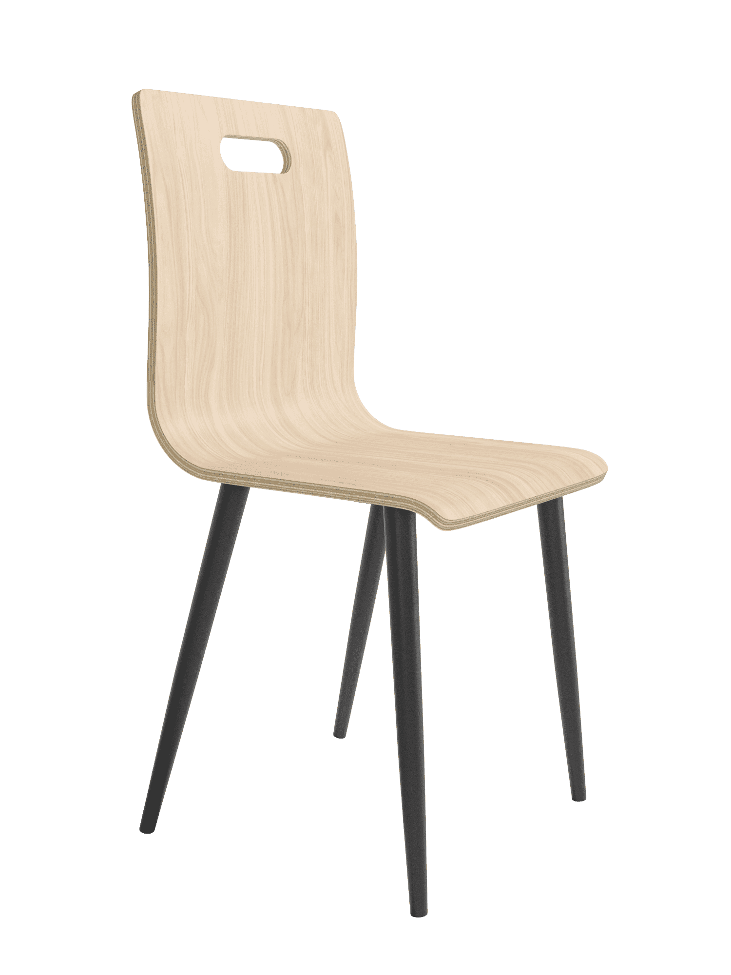 Silla con respaldo y asiento fabricados en tablero contrachapado de alta resistencia, con un diseño ergonómico que combina comodidad y estilo. Sus patas metálicas negras aportan solidez y estabilidad, mientras que la amplia variedad de acabados permite adaptarla a diferentes ambientes, desde comedores hasta espacios de hostelería o estudio.