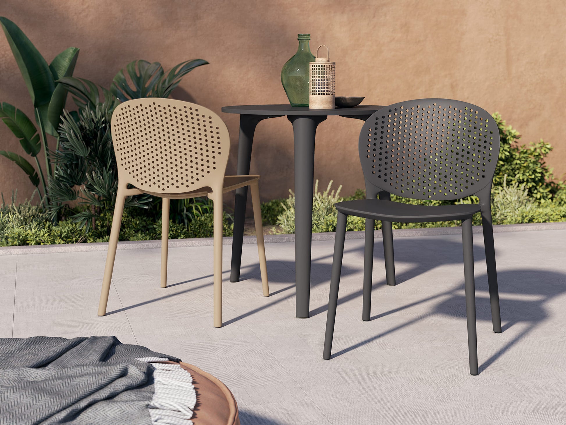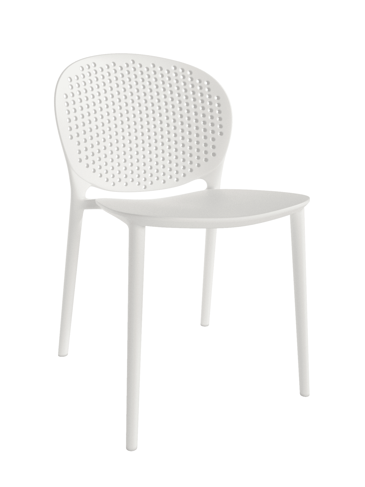 Compacta, ligera y con un diseño de respaldo perforado que favorece la ventilación, la silla ALBERITE está fabricada en polipropileno y pensada para el uso en exteriores. Su silueta redondeada aporta comodidad y una estética desenfadada que encaja en terrazas, jardines o espacios contract.