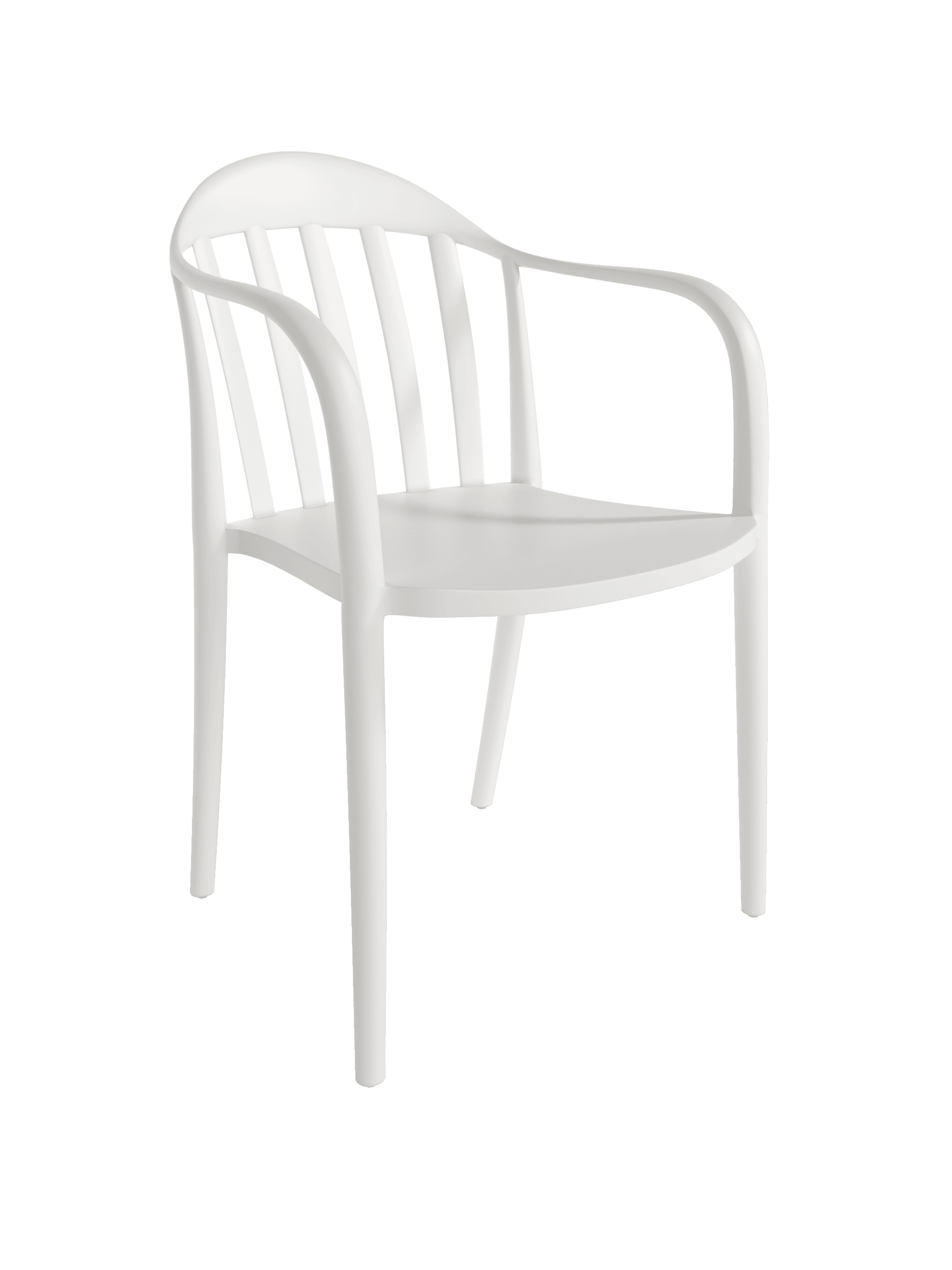 Con un respaldo curvado y barrotes verticales, la silla TRIEVES ofrece una estética relajada con un guiño retro. Fabricada en polipropileno y completamente apilable, es ideal para exteriores gracias a su resistencia y ligereza.