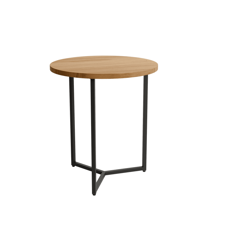 La mesa auxiliar redonda MEIRO destaca por su diseño industrial y minimalista. Con estructura de metal negro y sobre de madera en acabado roble natural, es perfecta como pieza auxiliar en salones, dormitorios o espacios de trabajo.