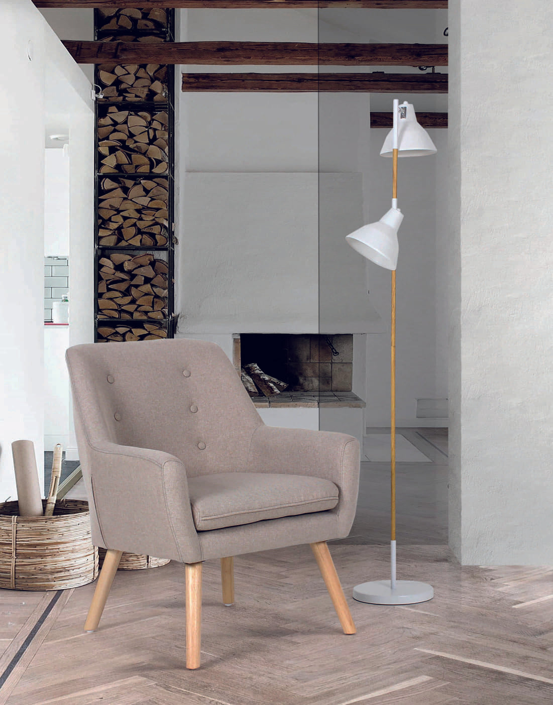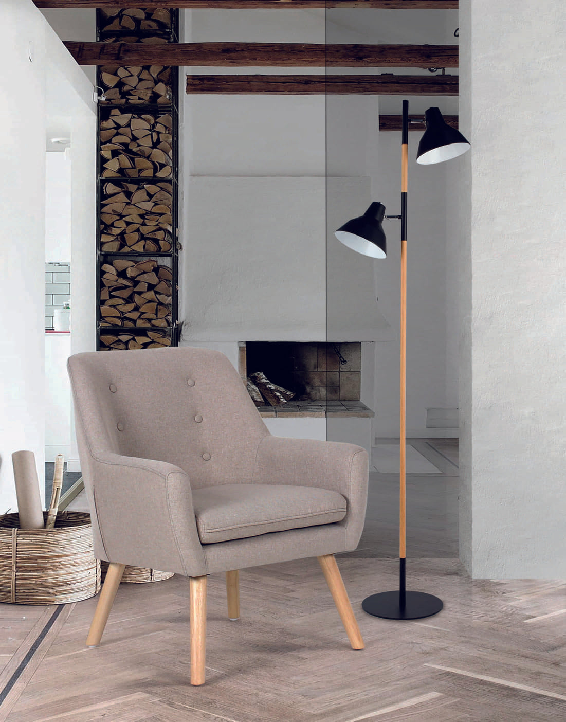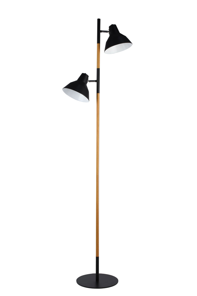 Lámpara de pie CATOUTE. Esta lámpara, fabricada en madera y metal, cuenta con dos tulipas ajustables disponibles en blanco o negro. Su diseño versátil permite dirigir la luz según las necesidades, siendo compatible con bombillas A++, A+, A, B, C, D, E. Con una altura de 150 cm, es ideal para proporcionar una iluminación amplia y funcional en cualquier espacio.