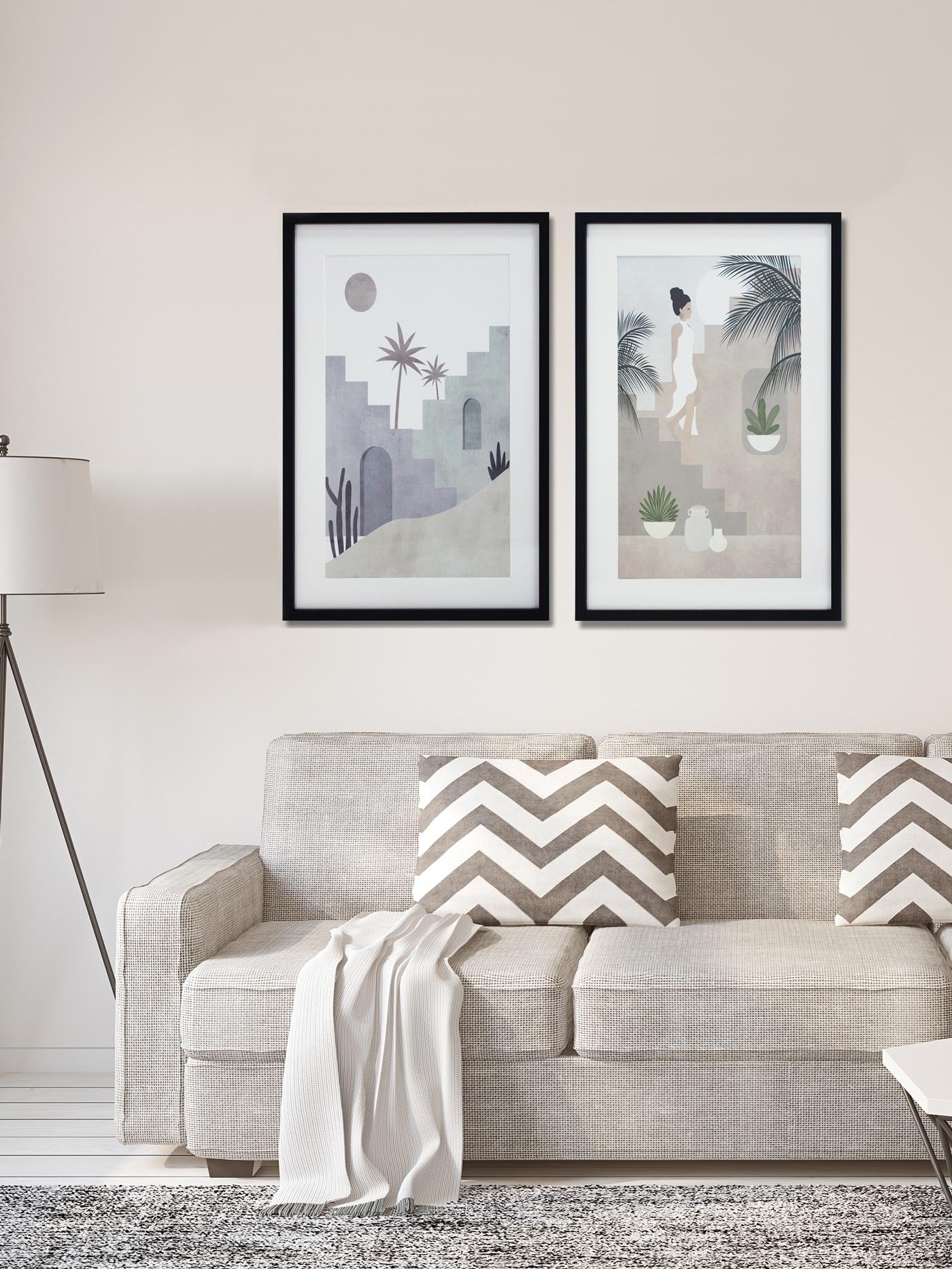 Este set de dos láminas en papel grueso con diseño urbano en tonos pastel es ideal para aportar un estilo fresco y moderno a cualquier espacio. Protegidas con cristal de poliestireno y enmarcadas en MDF negro, estas piezas destacan por su equilibrio entre elegancia y creatividad. El cartón paspartú en el contorno añade un acabado refinado que resalta los detalles del diseño.