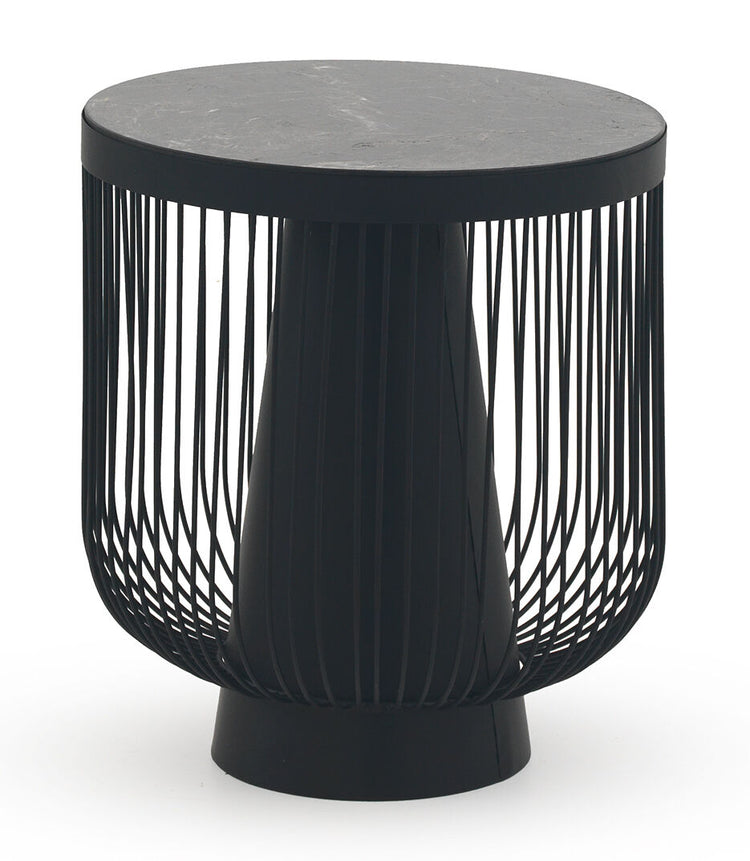 La mesa auxiliar PLANCHA está fabricada en mármol gris oscuro y metal, con una encimera redonda de mármol negro y base metálica en color negro.