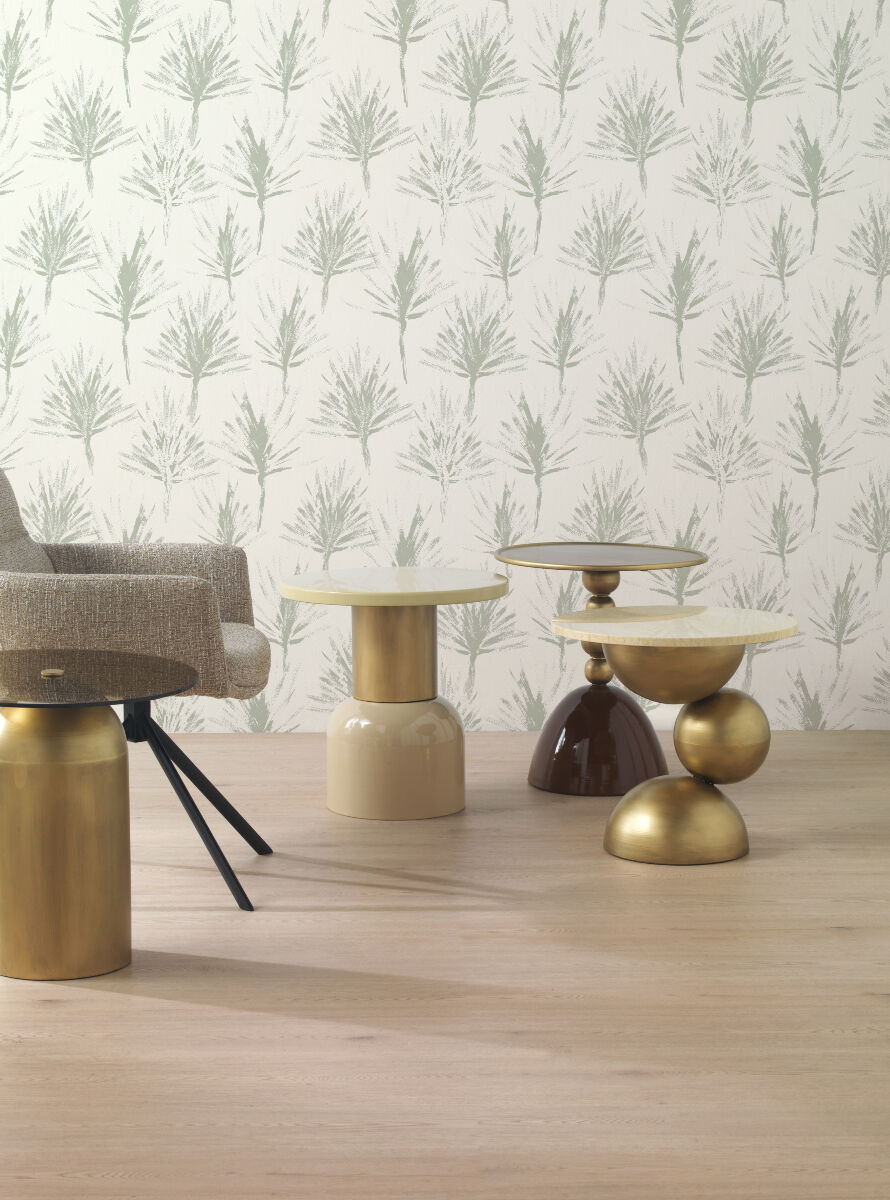 La mesa auxiliar TORANDI está fabricada en metal con acabado en color crema brillante. Presenta una forma redonda y combina una encimera metálica con brillo y una base metálica lacada en crema con acabado brillante.