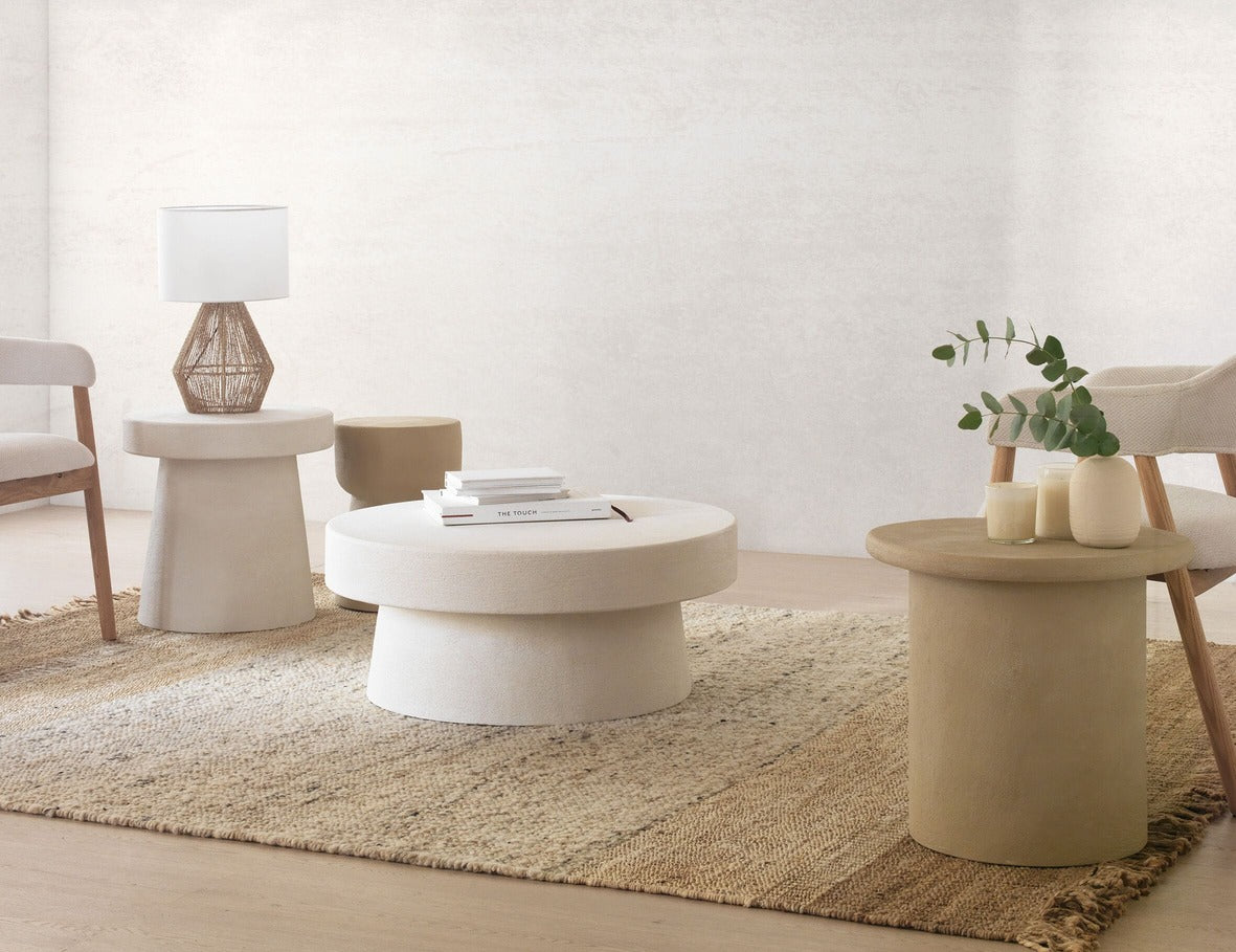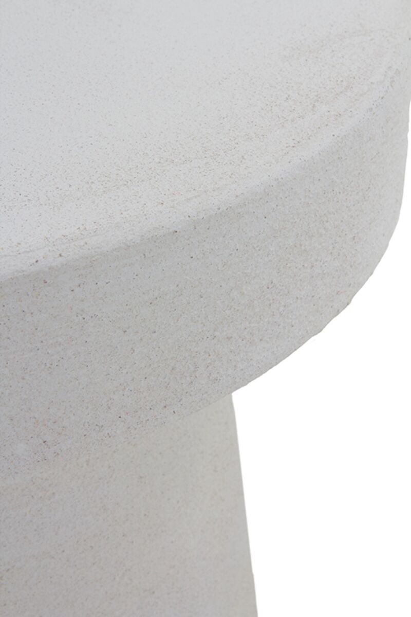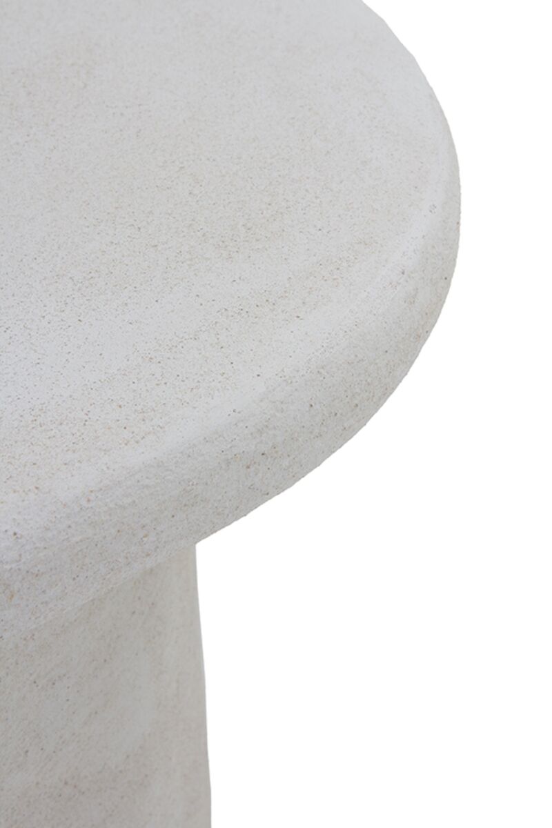 La mesa de centro MORÍS destaca por su diseño compacto y funcional, elaborada en poliresina con acabado cemento en color blanco. Presenta una forma redondeada y un tacto rugoso que aporta textura y personalidad al espacio. Su estilo minimalista la convierte en una pieza ideal para complementar salones modernos o contemporáneos.