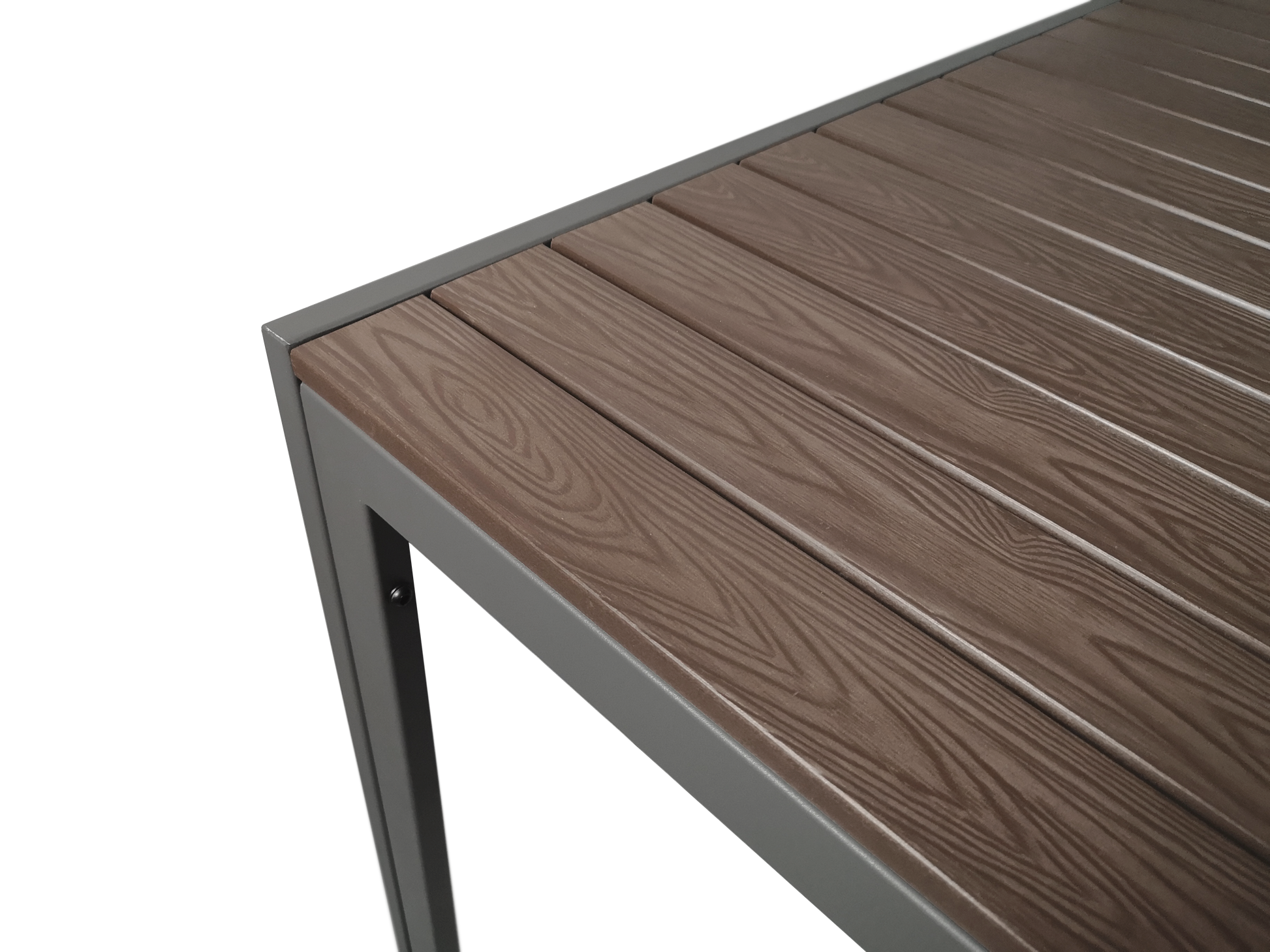 Diseñada para resistir a la intemperie con estilo, la mesa MALLENE combina una estructura metálica con un sobre de lamas de WPC efecto madera, aportando la calidez del aspecto natural sin renunciar a la durabilidad de los materiales técnicos.