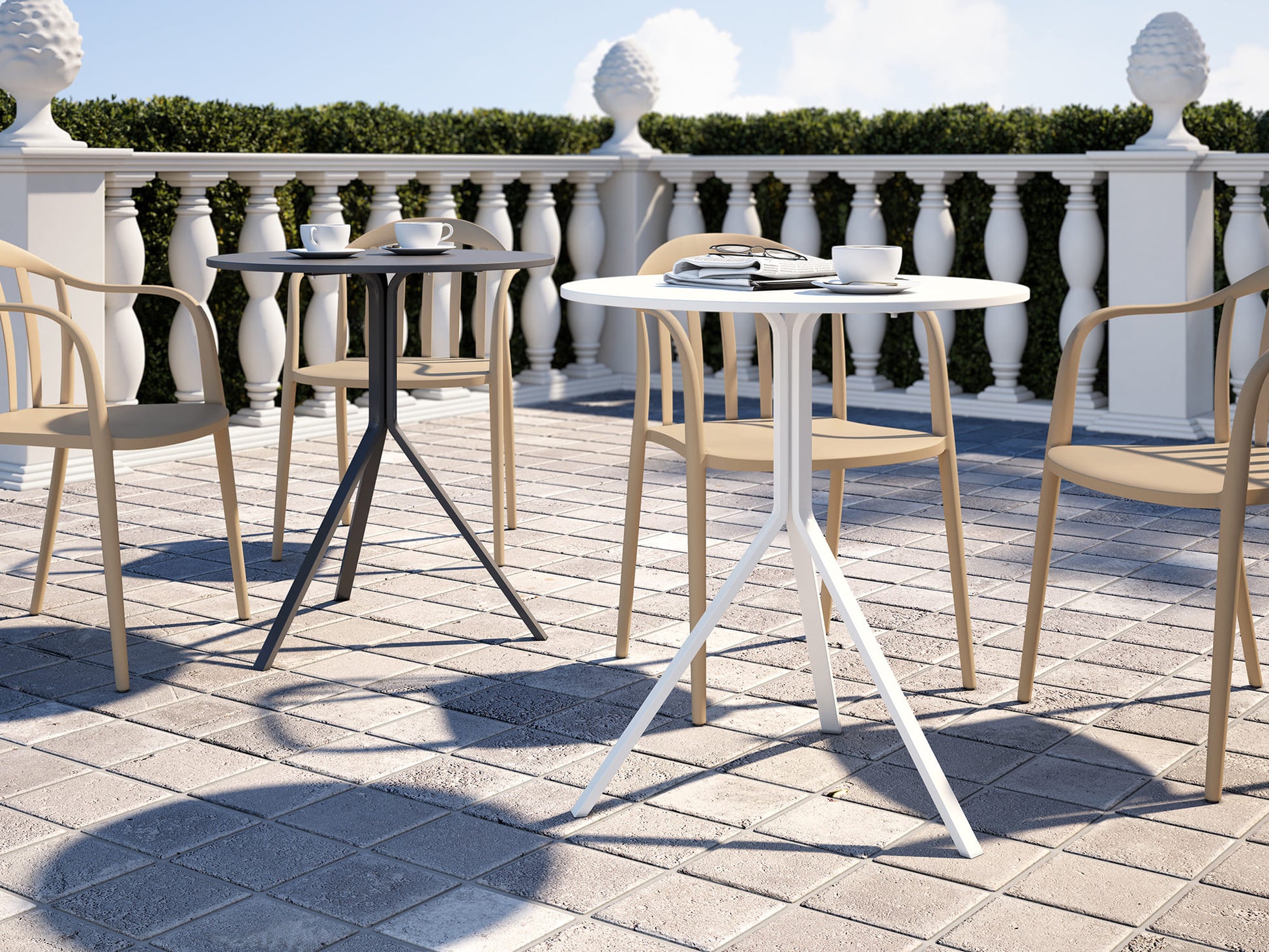 Con una estructura ligera y moderna, la mesa JARA se distingue por su base de tres patas metálicas lacadas y su sobre redondo de polipropileno. Su diseño aporta equilibrio visual y funcionalidad, convirtiéndola en una pieza ideal para terrazas, balcones o espacios interiores con estilo.