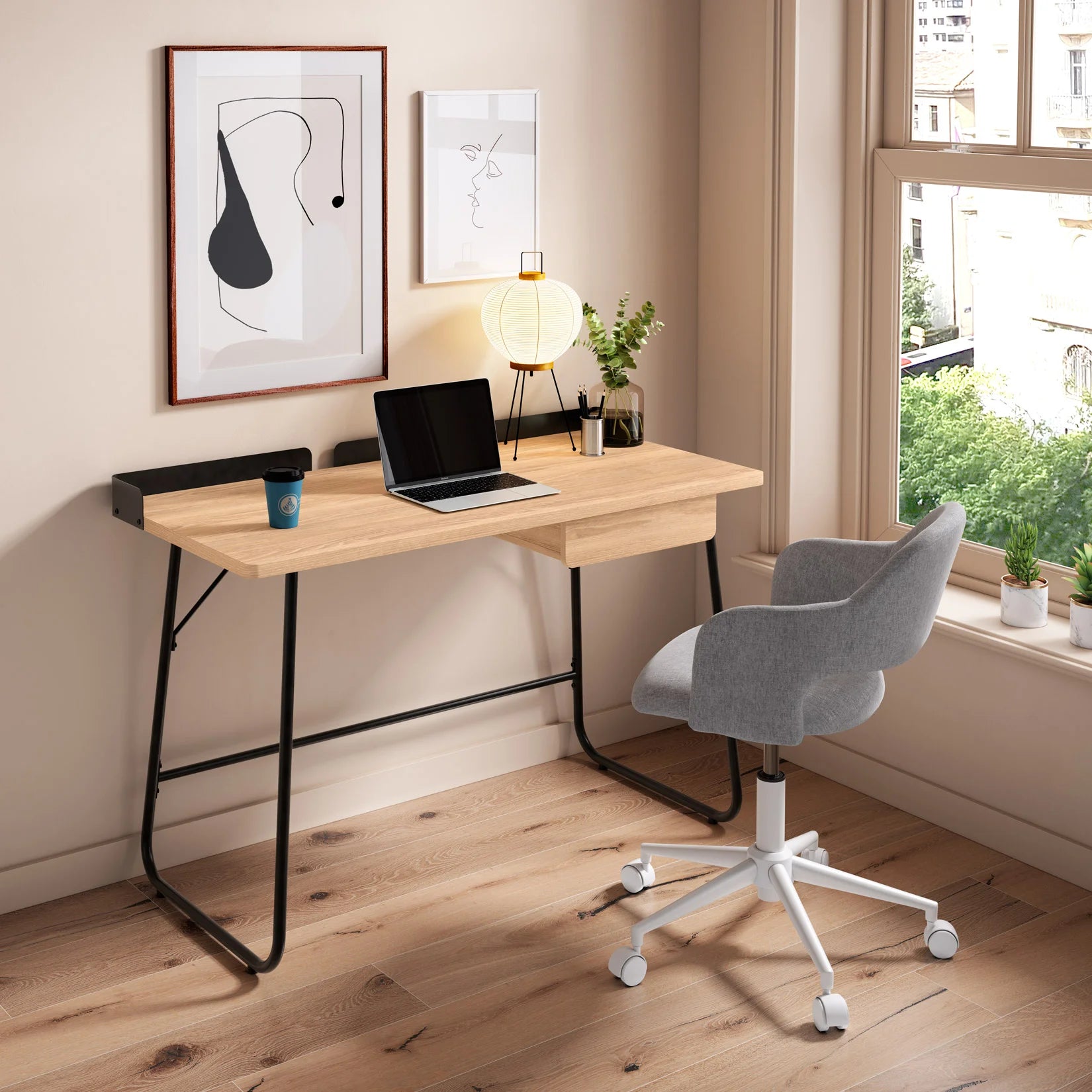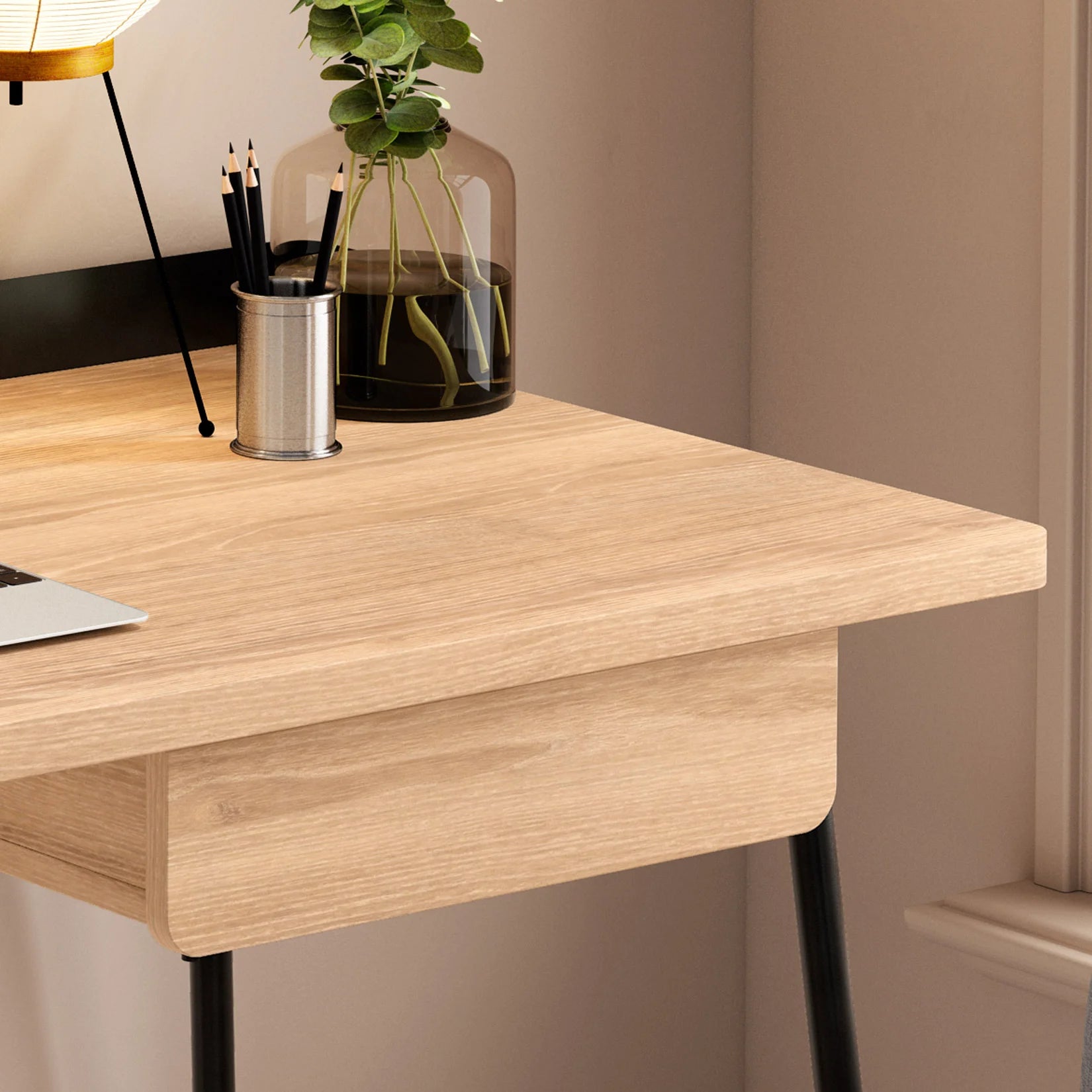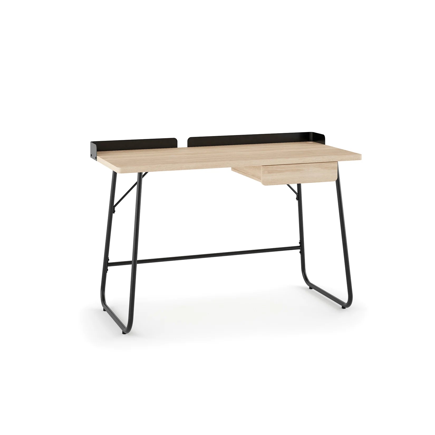 El escritorio MERÓN destaca por su diseño moderno y funcional, ideal tanto para el hogar como para la oficina. Incorpora una tapa de melamina resistente y un cajón integrado en color roble que aporta practicidad, acompañado de una estructura metálica negra que garantiza estabilidad y un estilo contemporáneo.