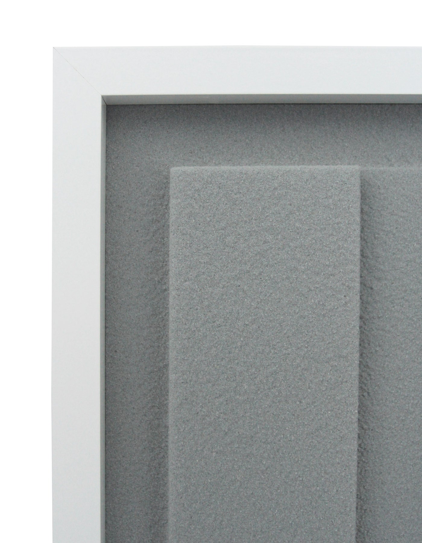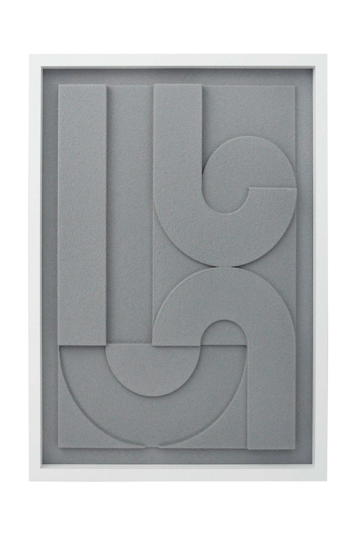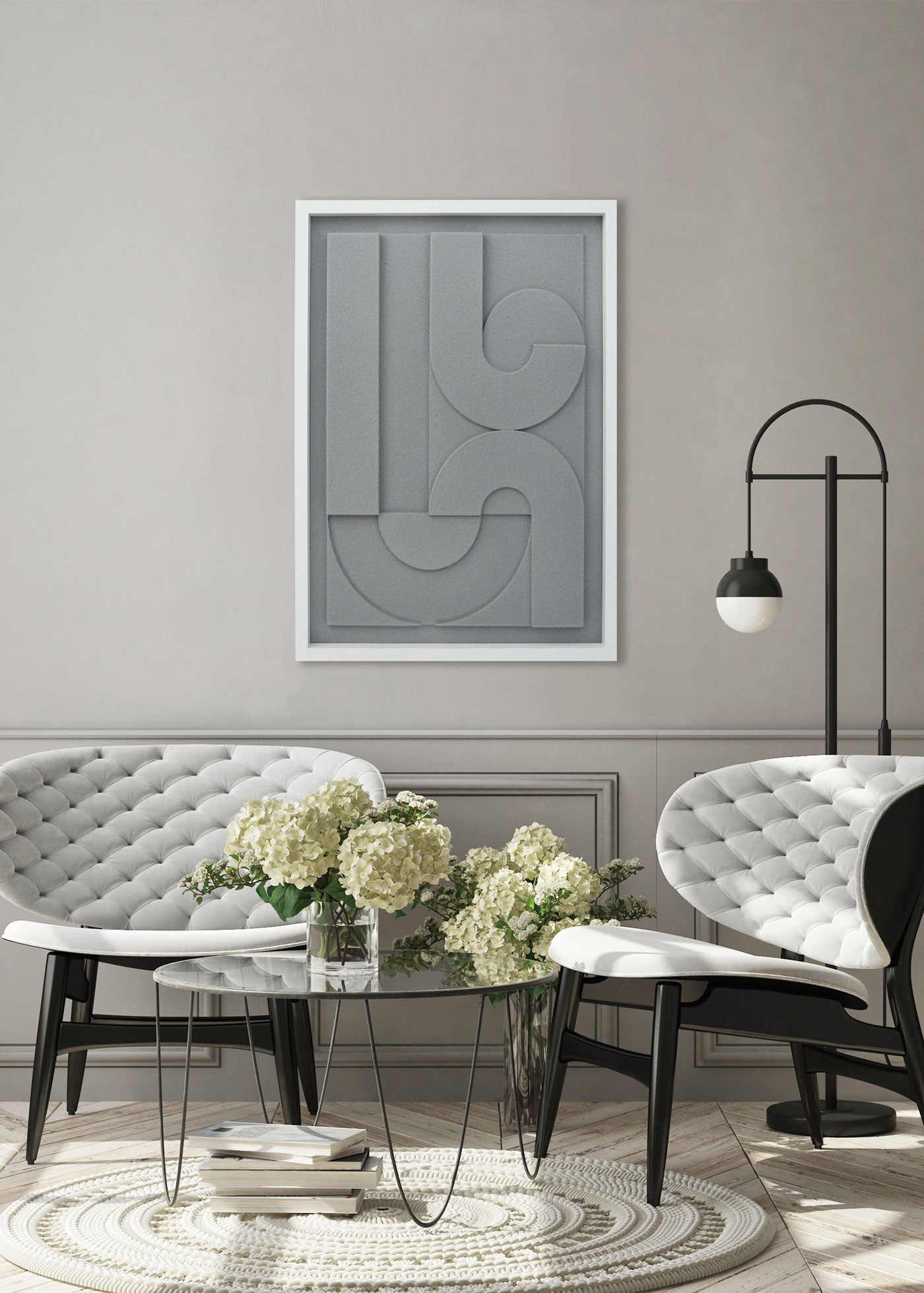 Este cuadro tridimensional en espuma de poliuretano con relieve 3D pintado en gris es una pieza moderna y sofisticada. Su acabado texturizado resalta la profundidad del diseño, mientras que el marco de MDF en tono blanco aporta un contraste elegante y versátil para cualquier espacio.