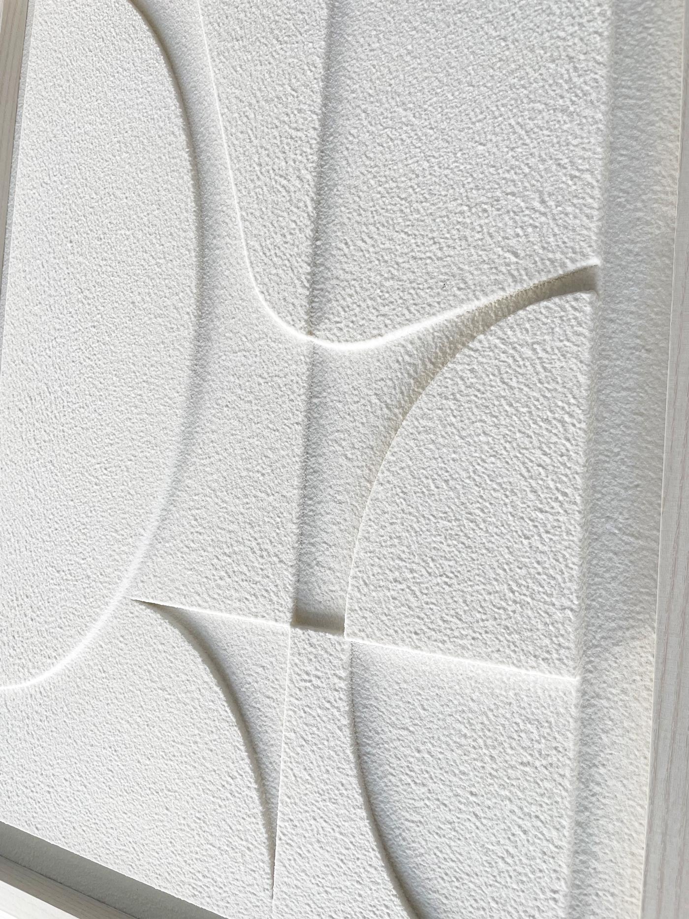 Este cuadro tridimensional en espuma de poliuretano con diseño geométrico y acabado texturizado en blanco roto es una pieza sofisticada y moderna. Su estructura de tres capas en relieve 3D aporta profundidad y dinamismo, permitiendo combinarlo con otros modelos para crear composiciones únicas. El marco en MDF con impresión en acabado madera en tono blanco complementa su diseño minimalista y elegante.