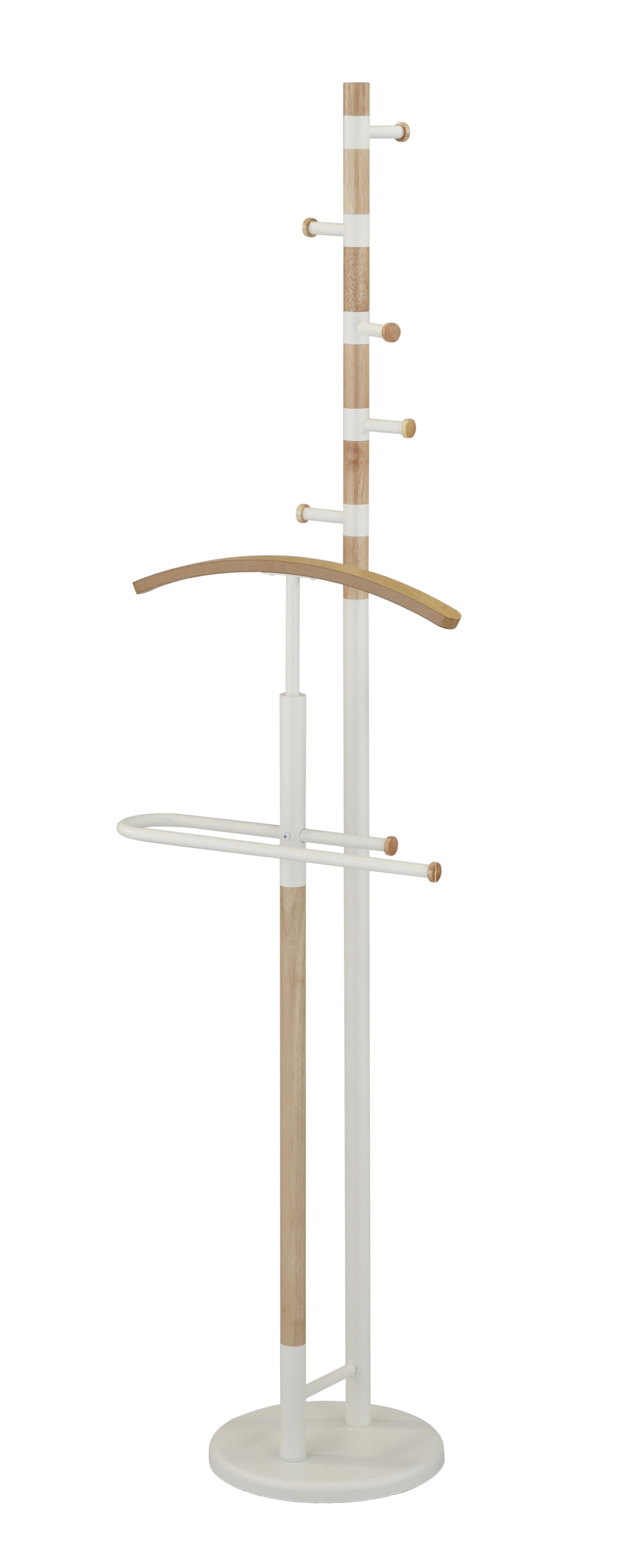Perchero de pie CERENGO, fabricado en una combinación de madera y metal en colores blanco y roble. Incluye percha, pantalonera y 5 colgadores, lo que le otorga una funcionalidad completa para organizar todo tipo de prendas. Su diseño lo convierte en un accesorio ideal para el dormitorio. Tiene una altura de 178 cm y una base de 47x31 cm.