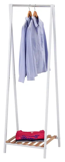 Perchero-parabán TESORERO, con estructura metálica blanca y diseño en forma de “bisagra”. Dispone de una barra superior para colgar prendas y una base de melamina en tono roble, ideal para zapatos, cajas o pequeños accesorios. Su estilo ligero y funcional lo convierte en una solución ideal para espacios pequeños o como complemento auxiliar en el dormitorio, el vestidor o la entrada. Medidas: 162 cm de altura, 53 cm de ancho y 42 cm de fondo.
