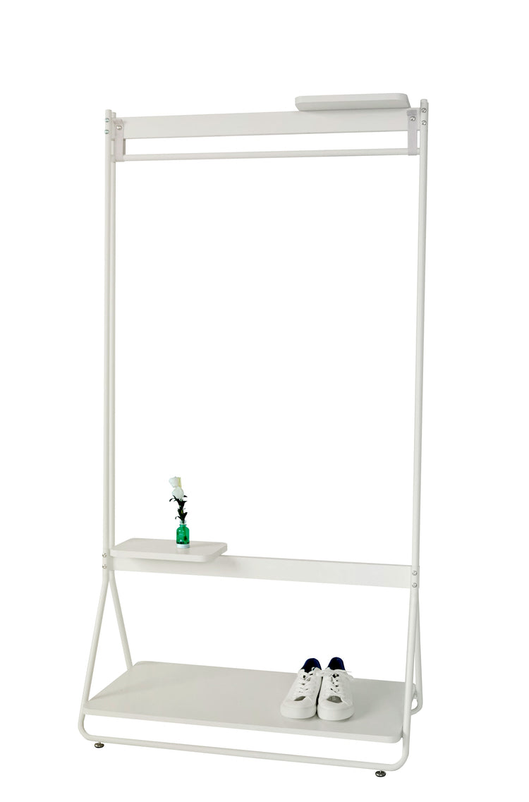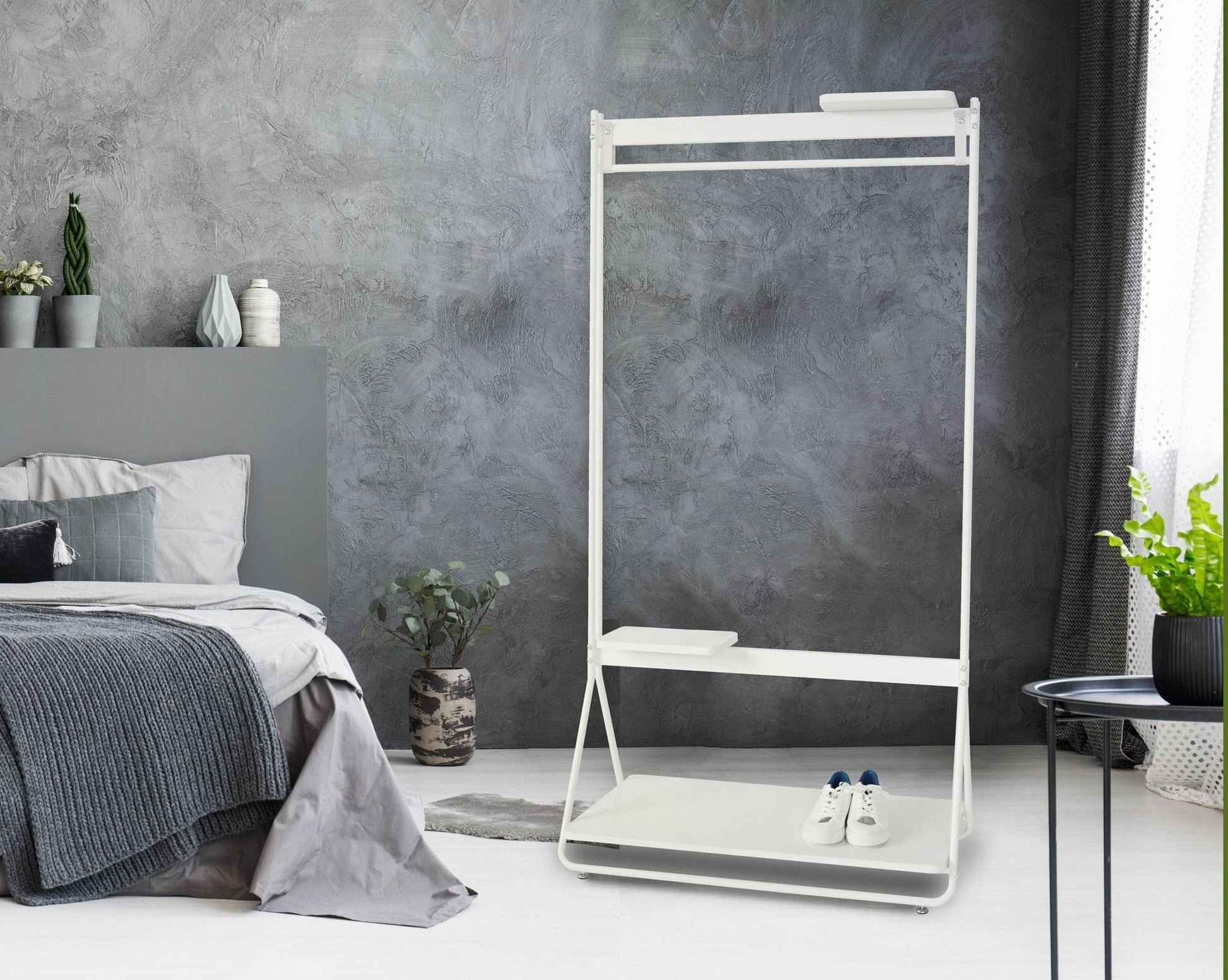 Perchero parabán CERREDO, con estructura metálica en color blanco y un diseño moderno y minimalista. Dispone de una barra superior para colgar ropa, una repisa en madera ideal para accesorios o bolsos pequeños, y una base inferior amplia perfecta para colocar zapatos. Es compacto y ligero, ideal para dormitorios, vestidores o ambientes contemporáneos. Sus medidas son 175 cm de altura, 91 cm de ancho y 44 cm de fondo.