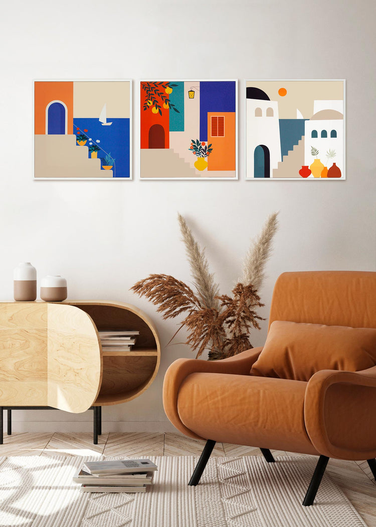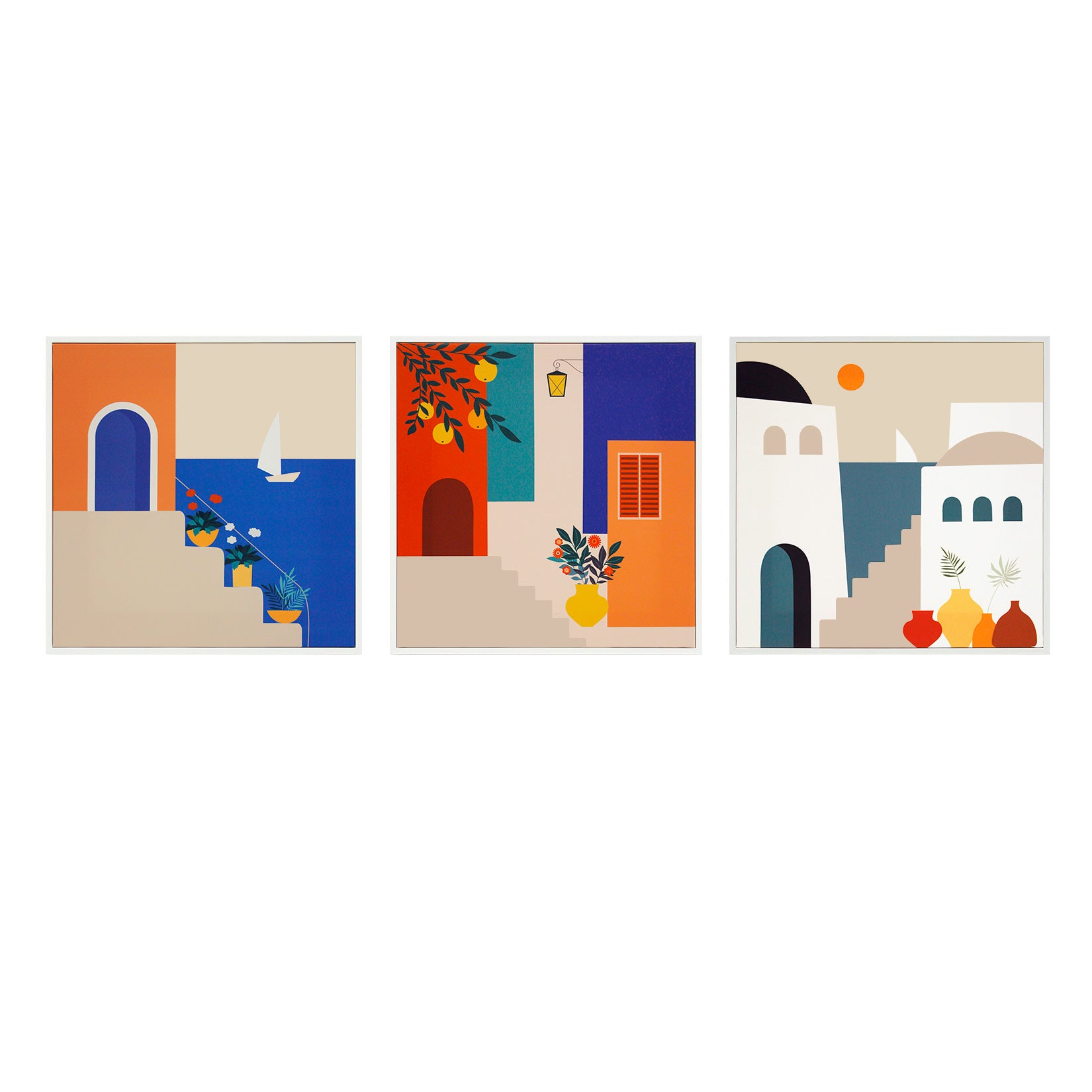 Este set de tres lienzos en tela sintética de poliéster presenta hermosos diseños de paisajes mediterráneos, creados con impresión en tinta al agua, lo que aporta un toque fresco y natural. Los cuadros están enmarcados en poliestireno blanco, lo que resalta la serenidad y belleza de cada escena, perfectos para darle un aire relajante a cualquier espacio.
