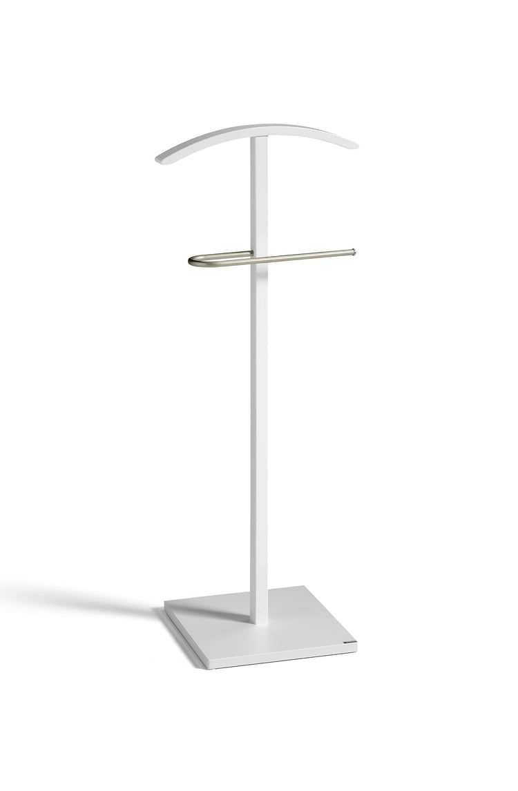 La base cuadrada de MDF lacado proporciona estabilidad, mientras que los herrajes de hierro con baño en cromo satinado garantizan resistencia a la humedad y al óxido. Equipado con una percha curvada para camisas y chaquetas, y una pantalonera metálica, es la solución perfecta para mantener la ropa en orden y sin arrugas.