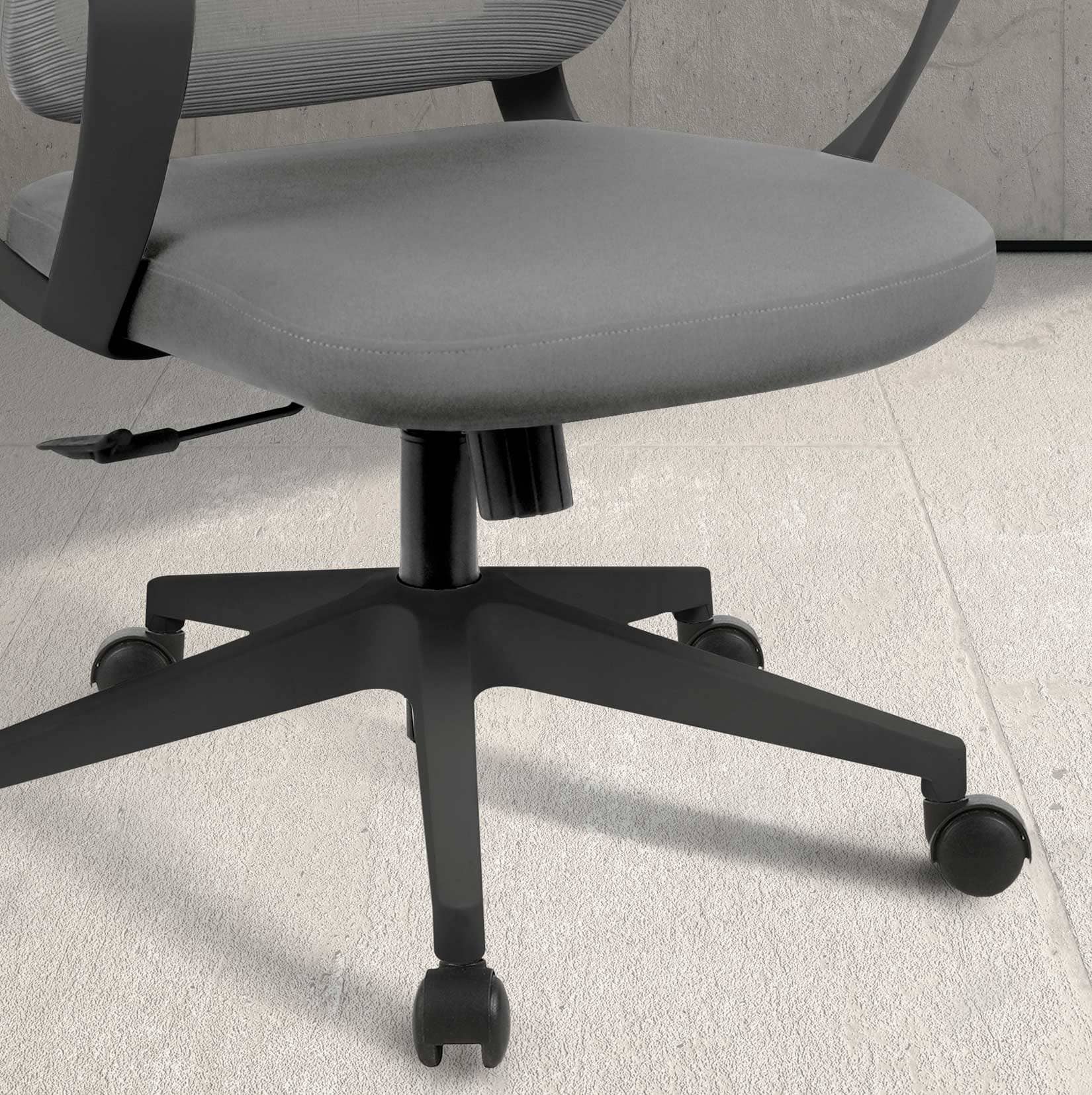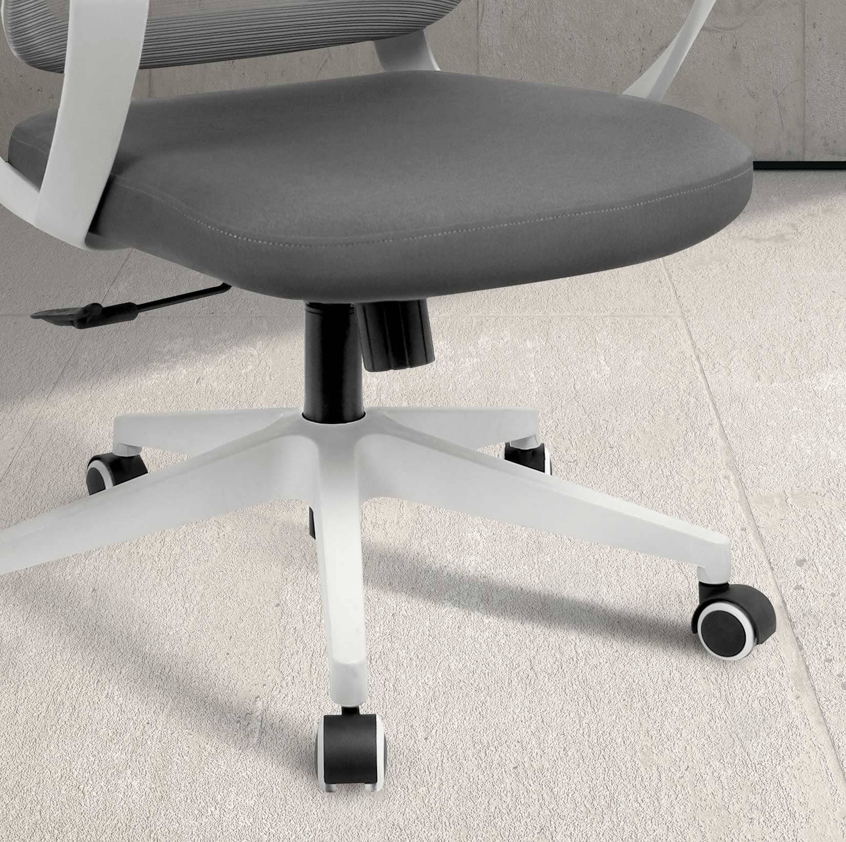 Incorpora sistema basculante y regulación de altura mediante pistón de gas, permitiendo ajustar la postura con facilidad. Su base de nylon, disponible en gris claro o negro según el modelo, aporta estabilidad, y las ruedas de silicona aseguran un desplazamiento suave sin dañar superficies delicadas como el parquet.