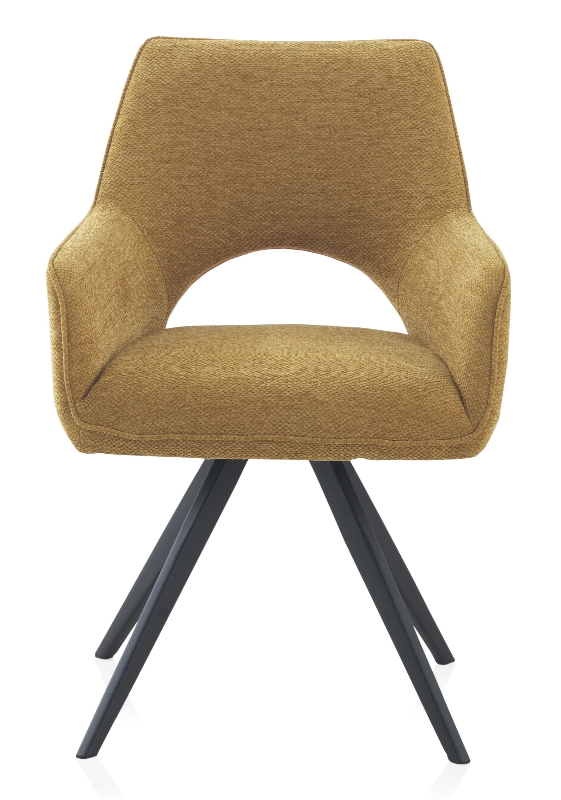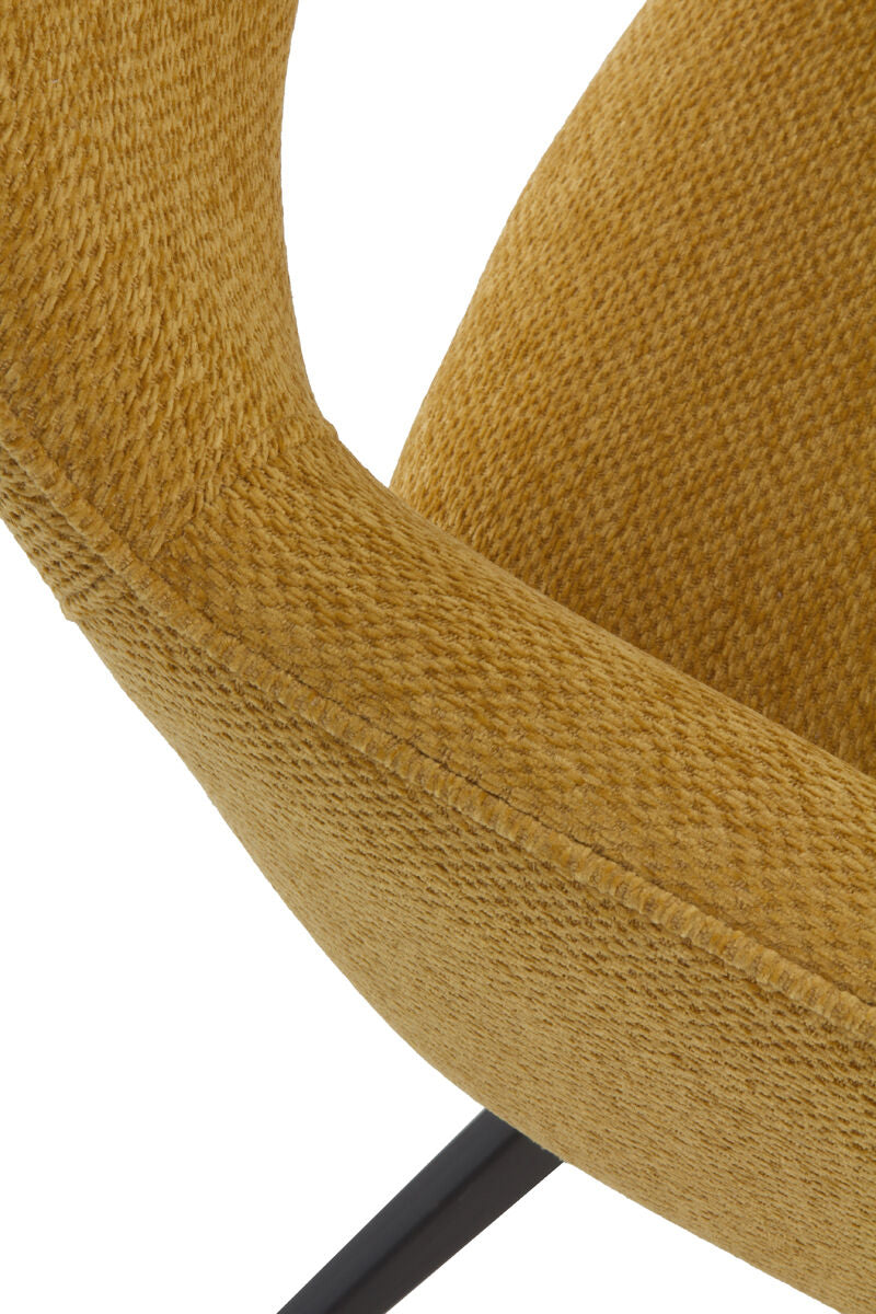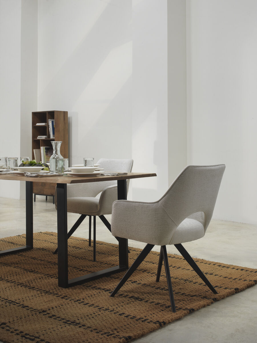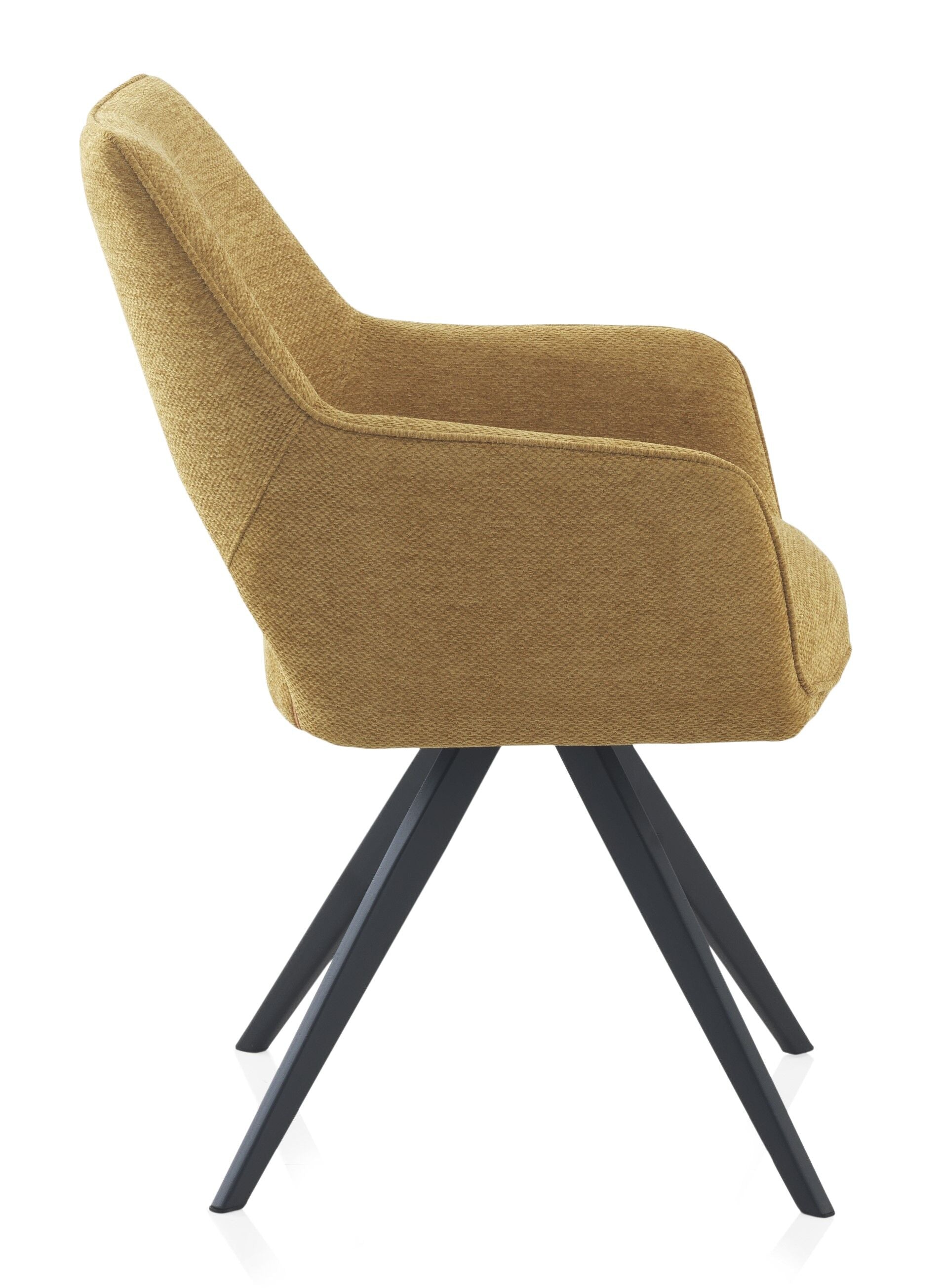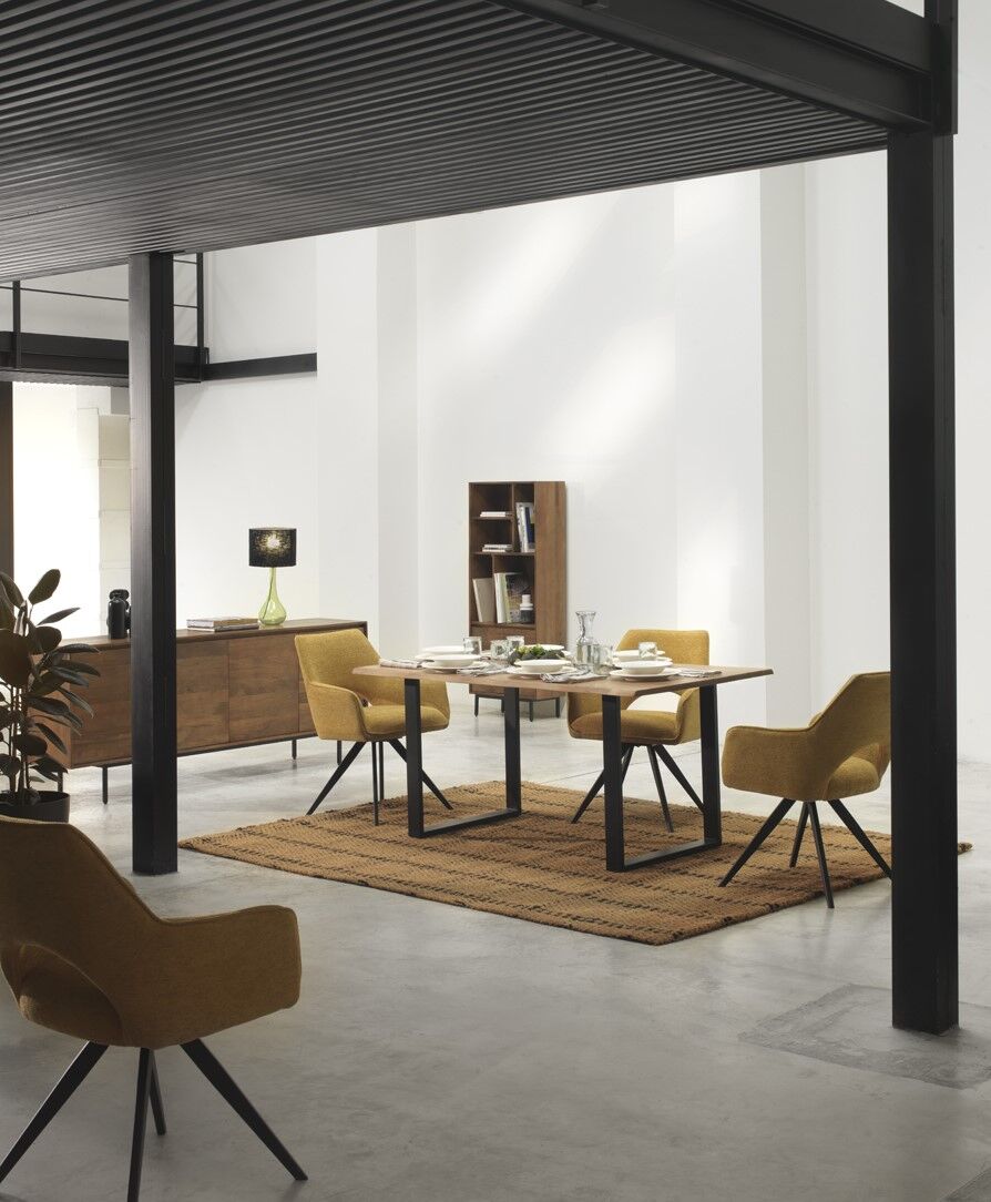 El sillón giratorio VENEIRO combina funcionalidad y diseño moderno. Su sistema giratorio con retorno automático a la posición inicial ofrece comodidad y practicidad en el uso diario. Está tapizado en tejido 100% poliéster disponible en color beige o mostaza, y se apoya sobre una estructura metálica negra que aporta estabilidad y estilo.