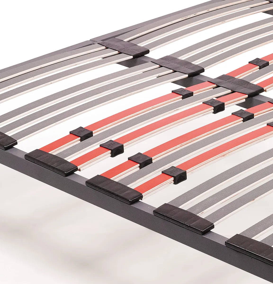 Somier de lamas de madera con estructura metálica robusta de tubo de acero y tratamiento contra la corrosión, que garantiza mayor resistencia y durabilidad. Incorpora soportes soldados con tornillo rosca M10, tacos PVC embutidos anti ruidos y lamas de madera contrachapada en acabado color carbono. Su estructura está reforzada con pintura epoxi color grafito para mayor protección. Se entrega con juego de 6 patas metálicas de 25 cm, fáciles de montar y muy estables.