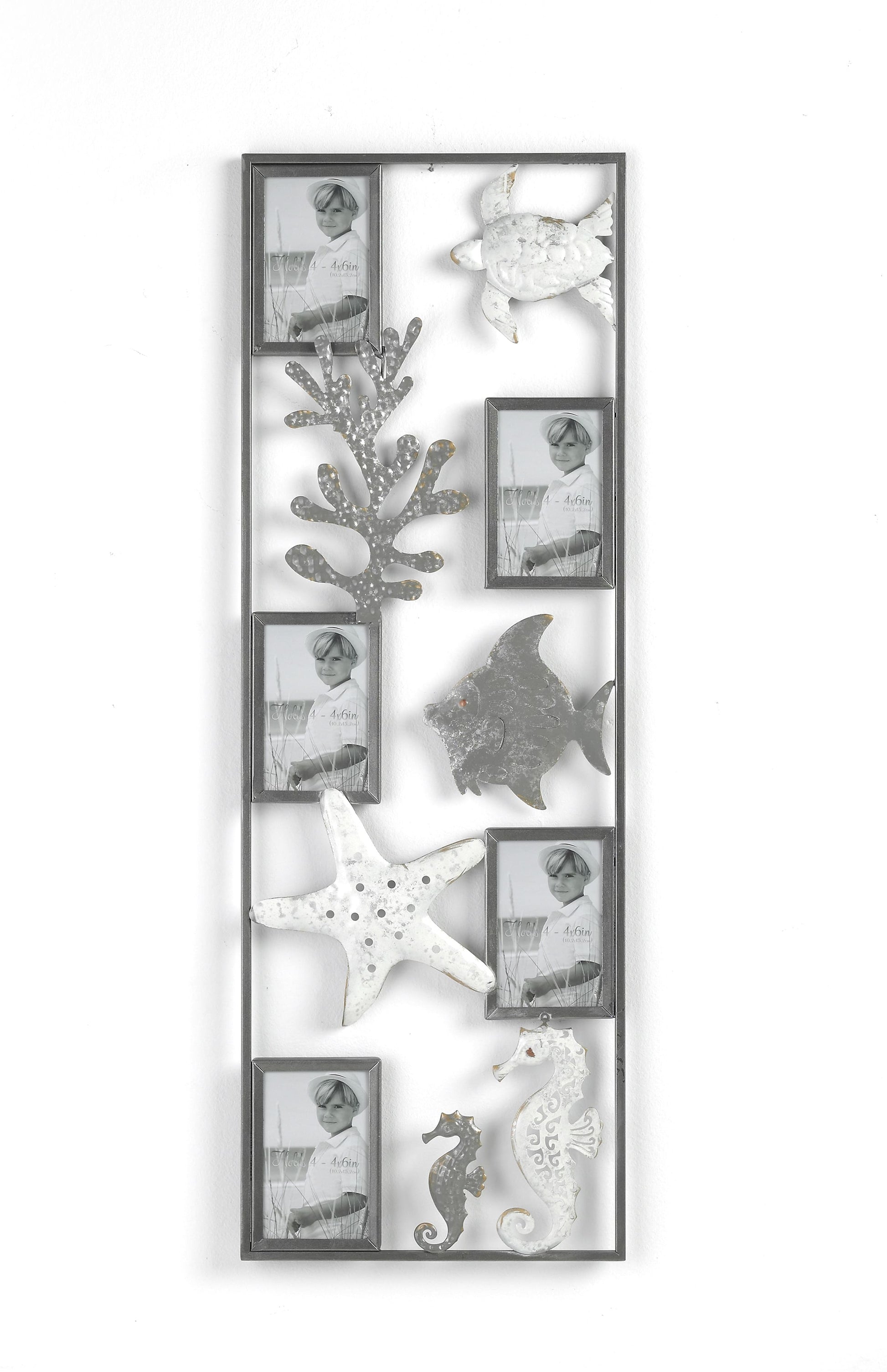 Estructura decorativa de metal en tonos grises con un diseño inspirado en el mar. Incorpora cinco portafotos, ideal para exhibir recuerdos en diversos espacios del hogar u oficina.